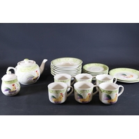 - **Teacups and Saucers:** Elegantly rounded teacups paired with matching floral saucers.