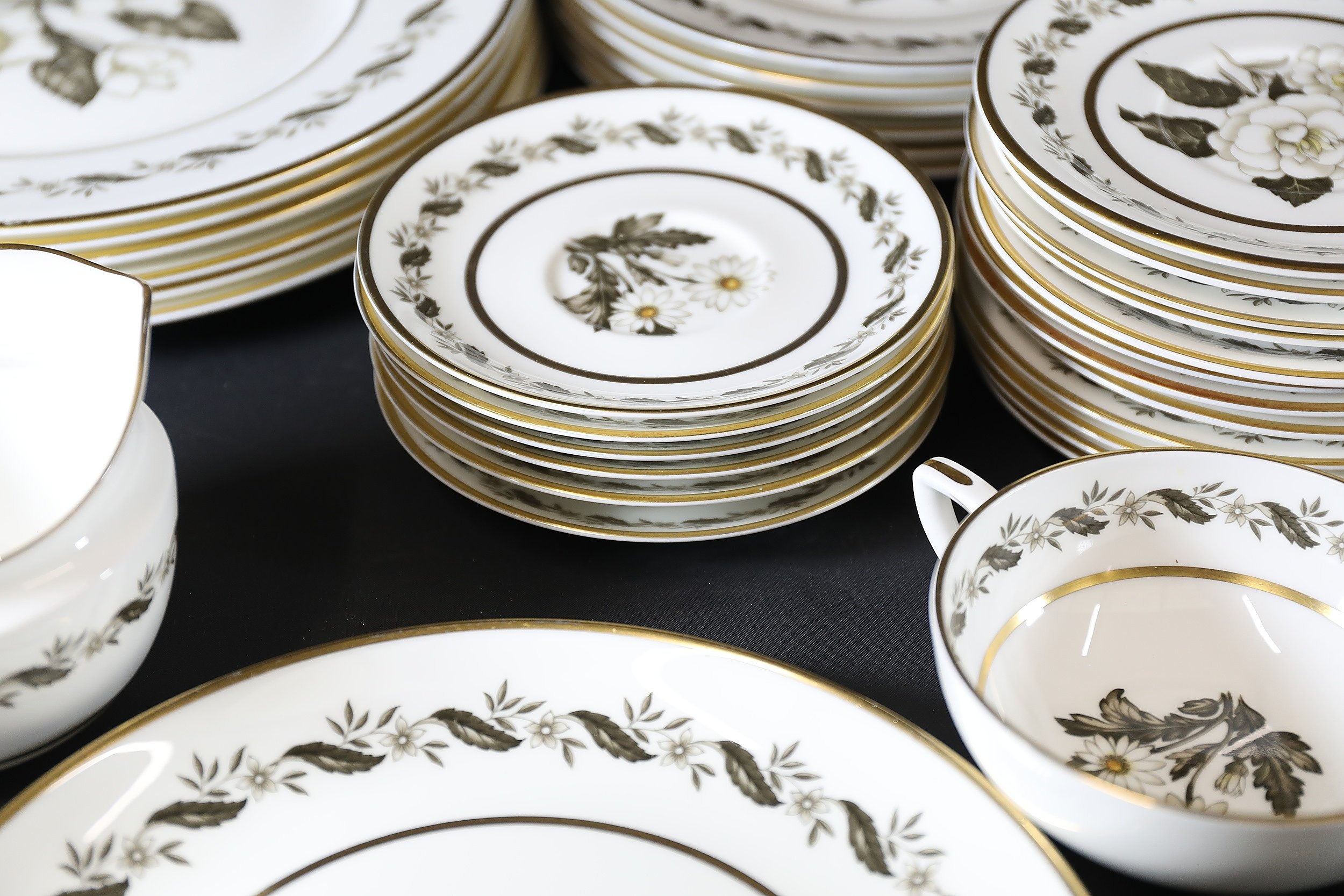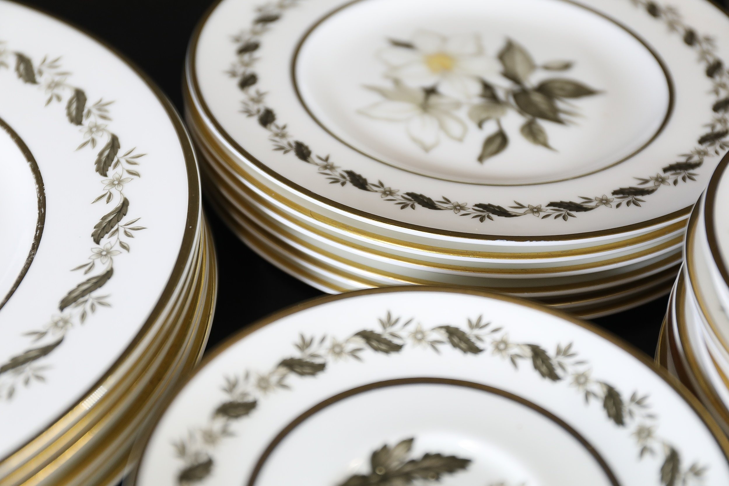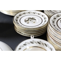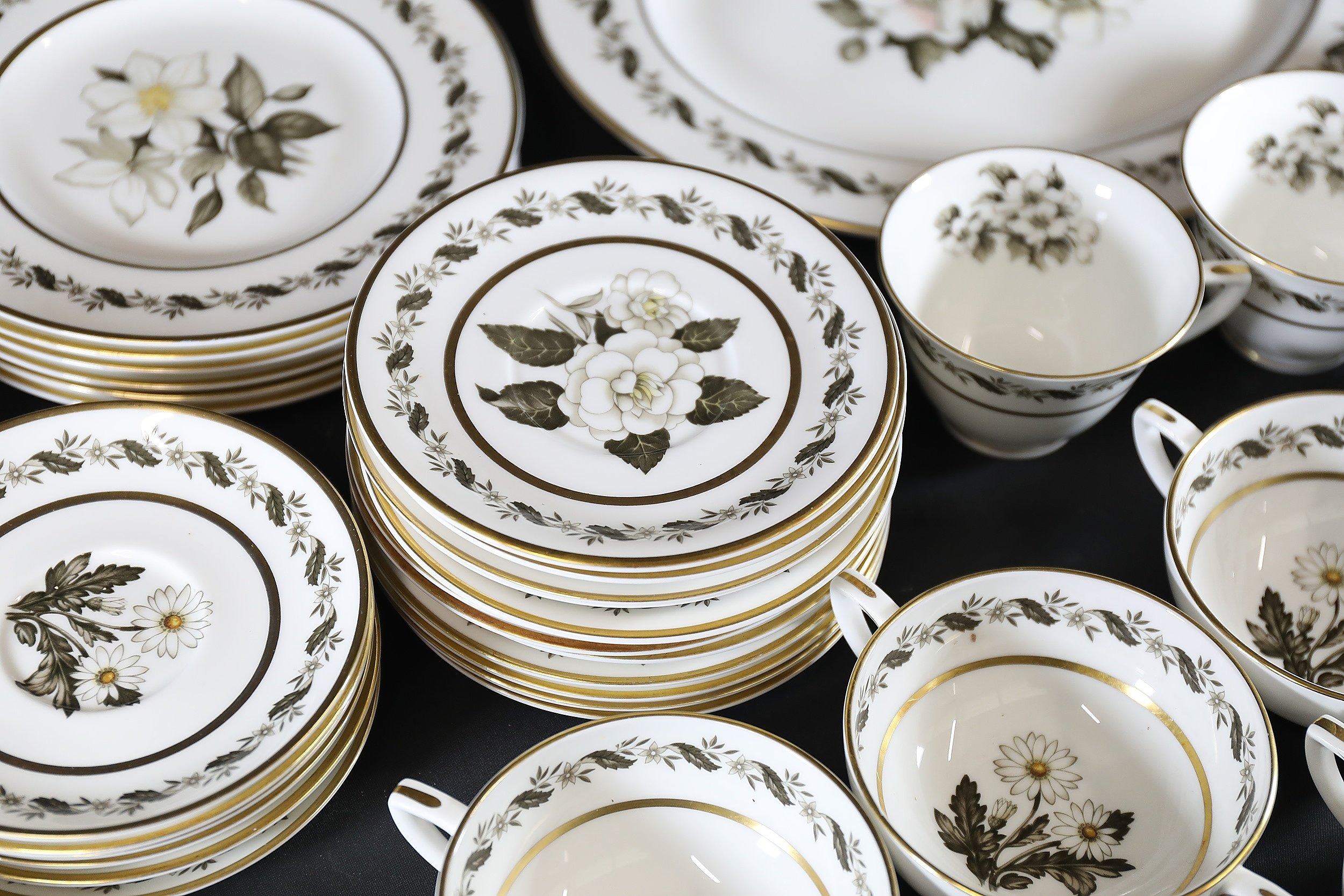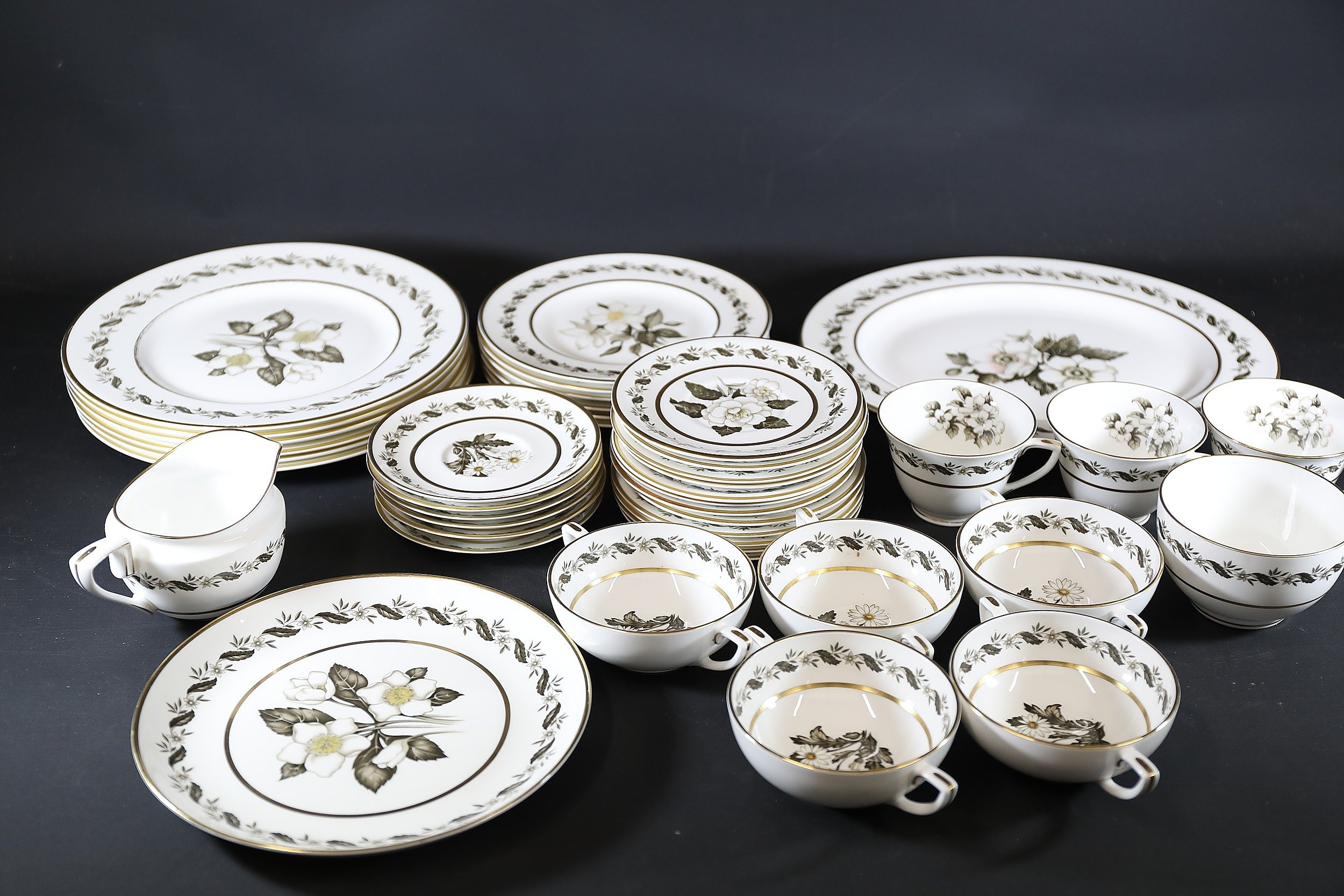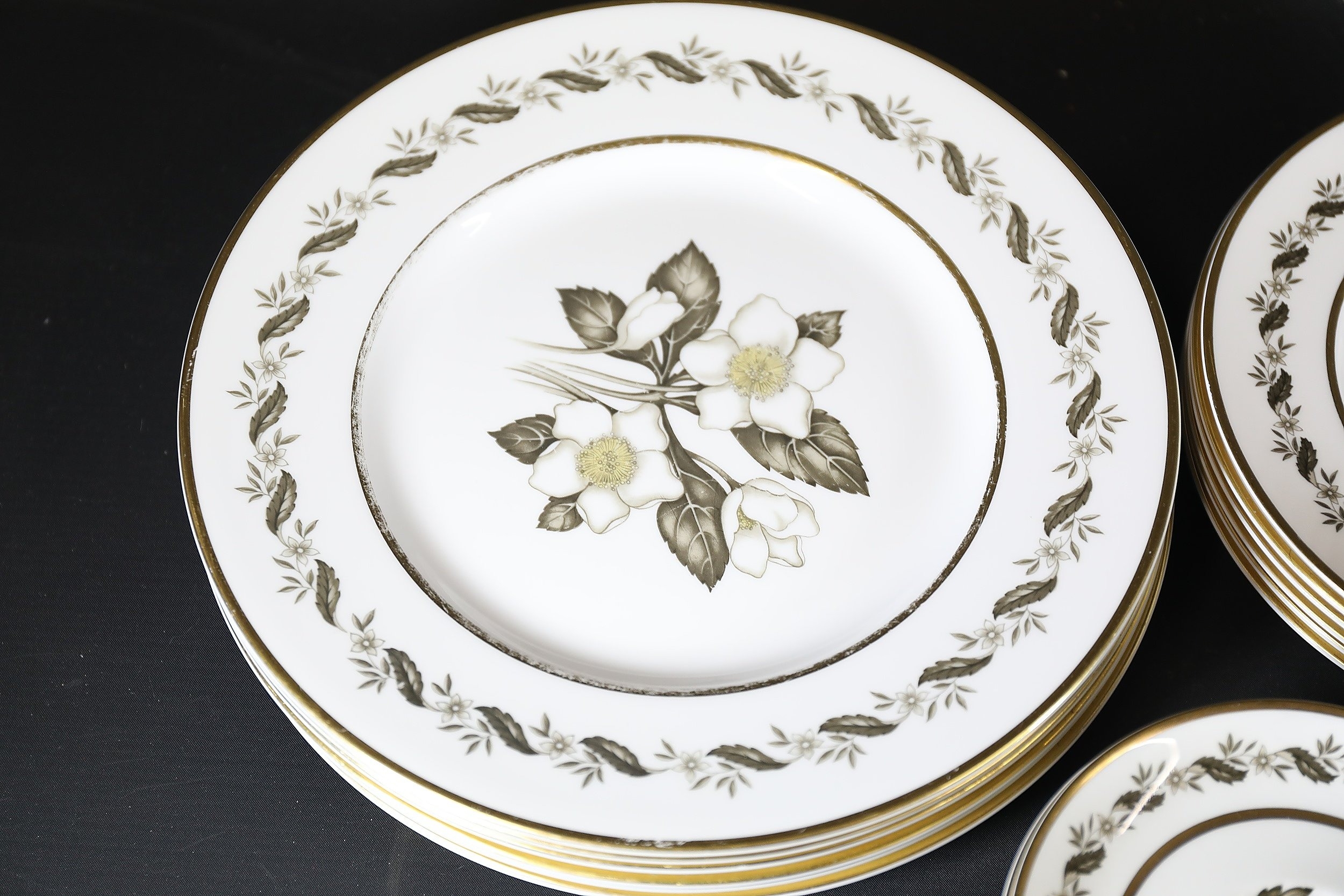 - **Plates:** Dinner plates, side plates, and dessert plates with central floral motifs and gold-edged borders.