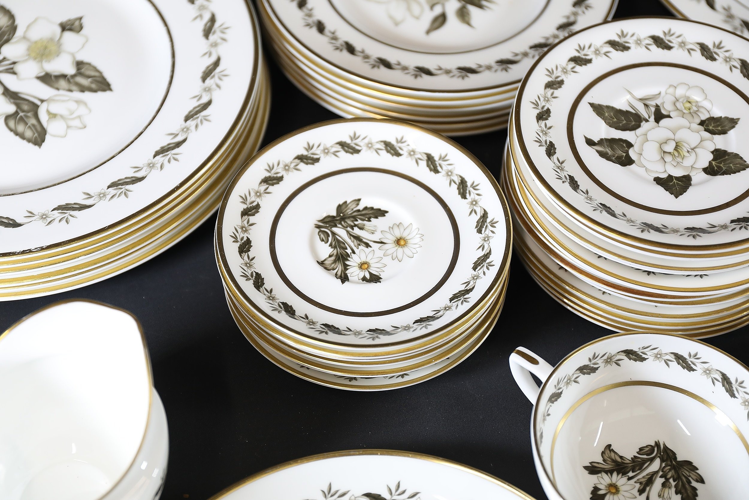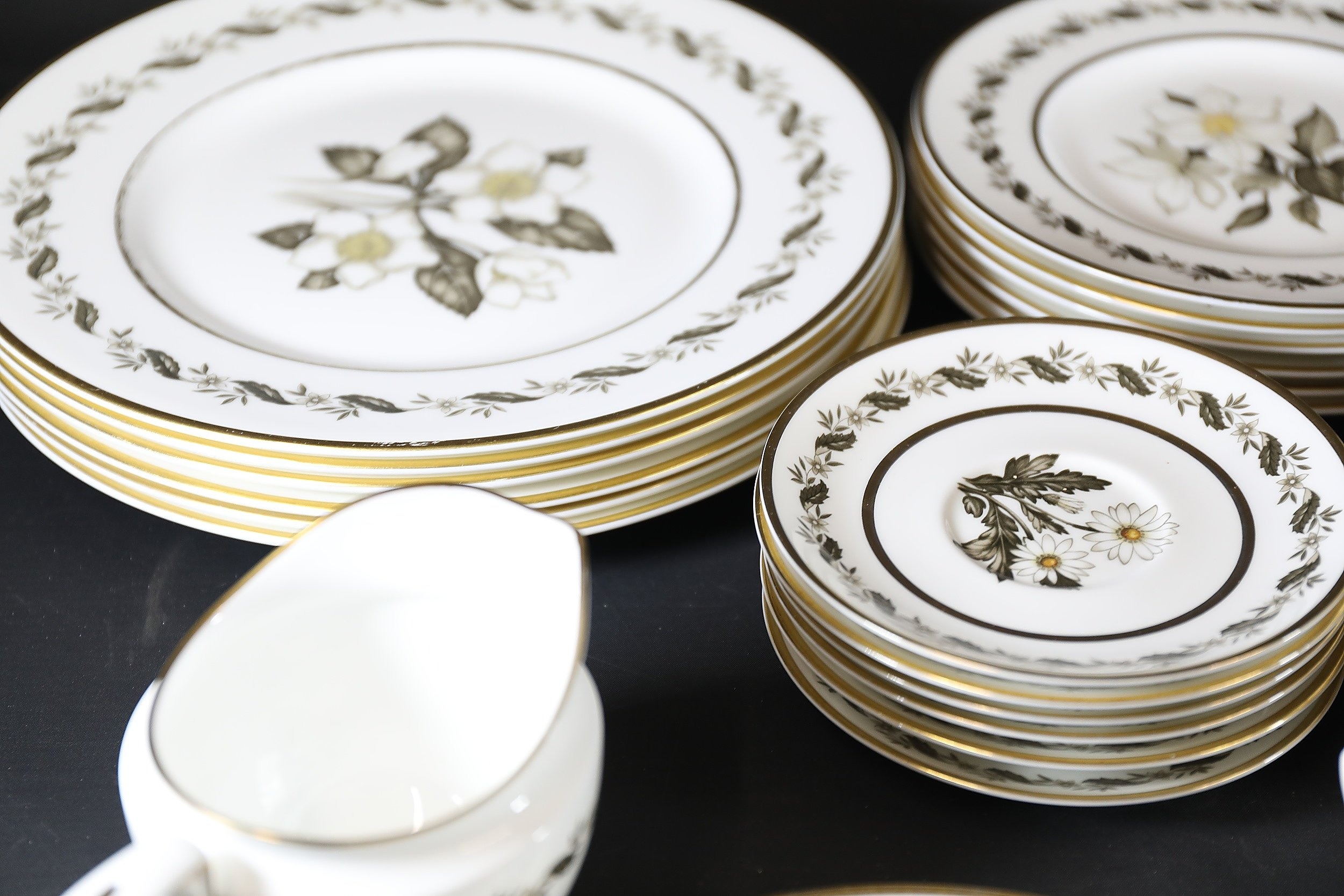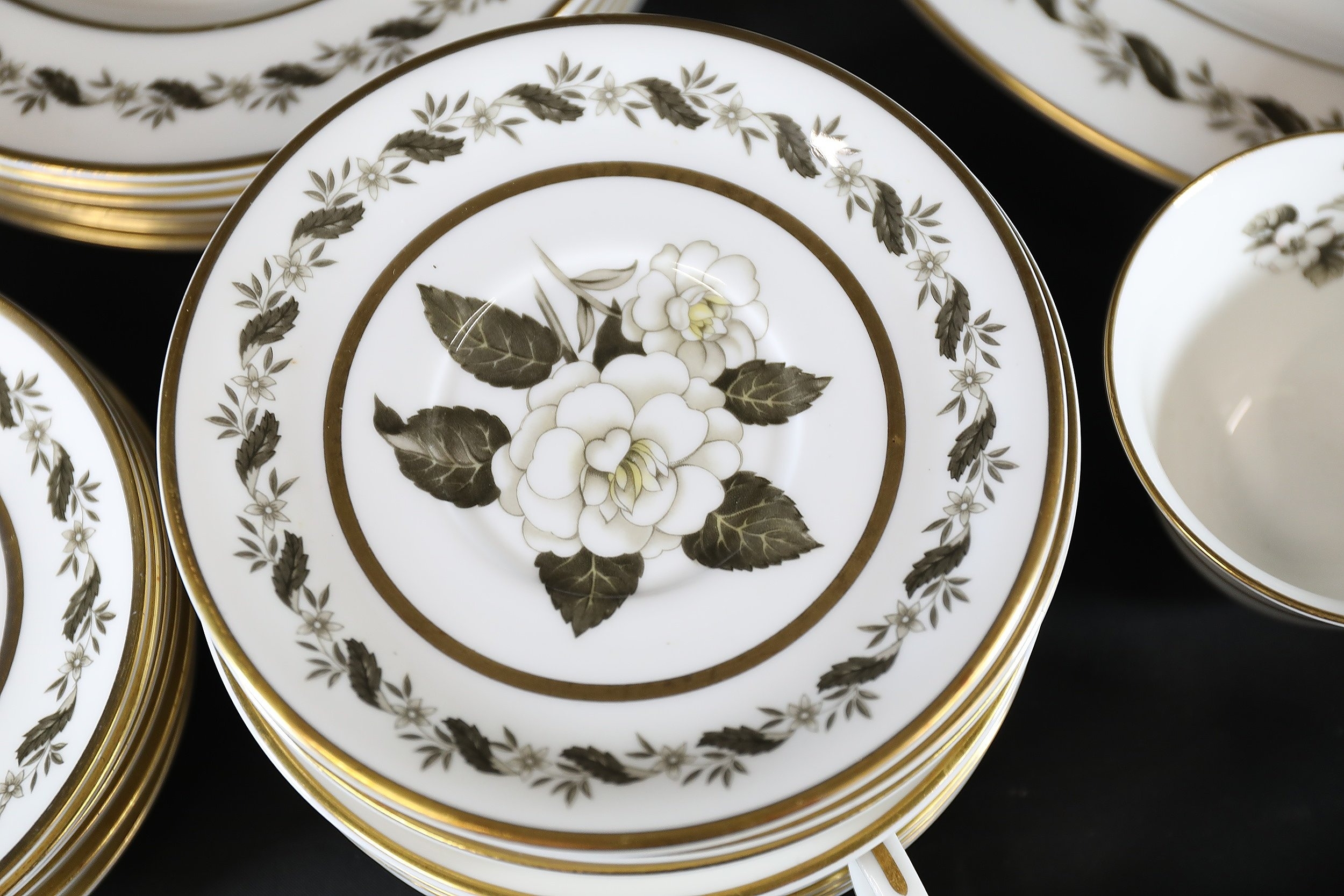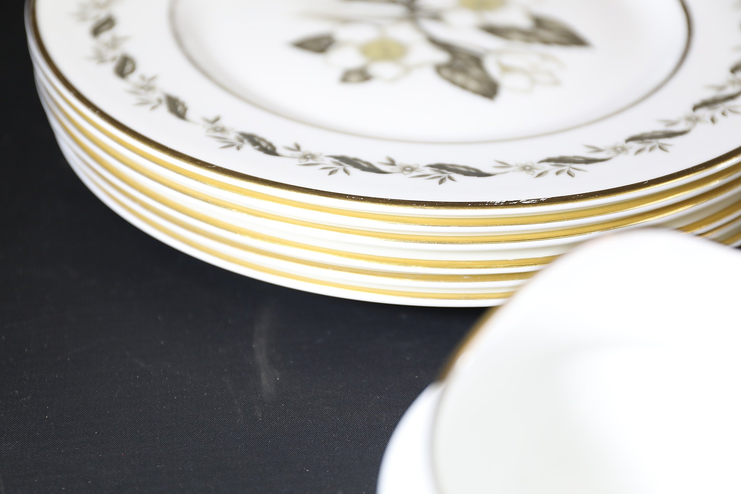 - **Plates:** Dinner plates, side plates, and dessert plates with central floral motifs and gold-edged borders.