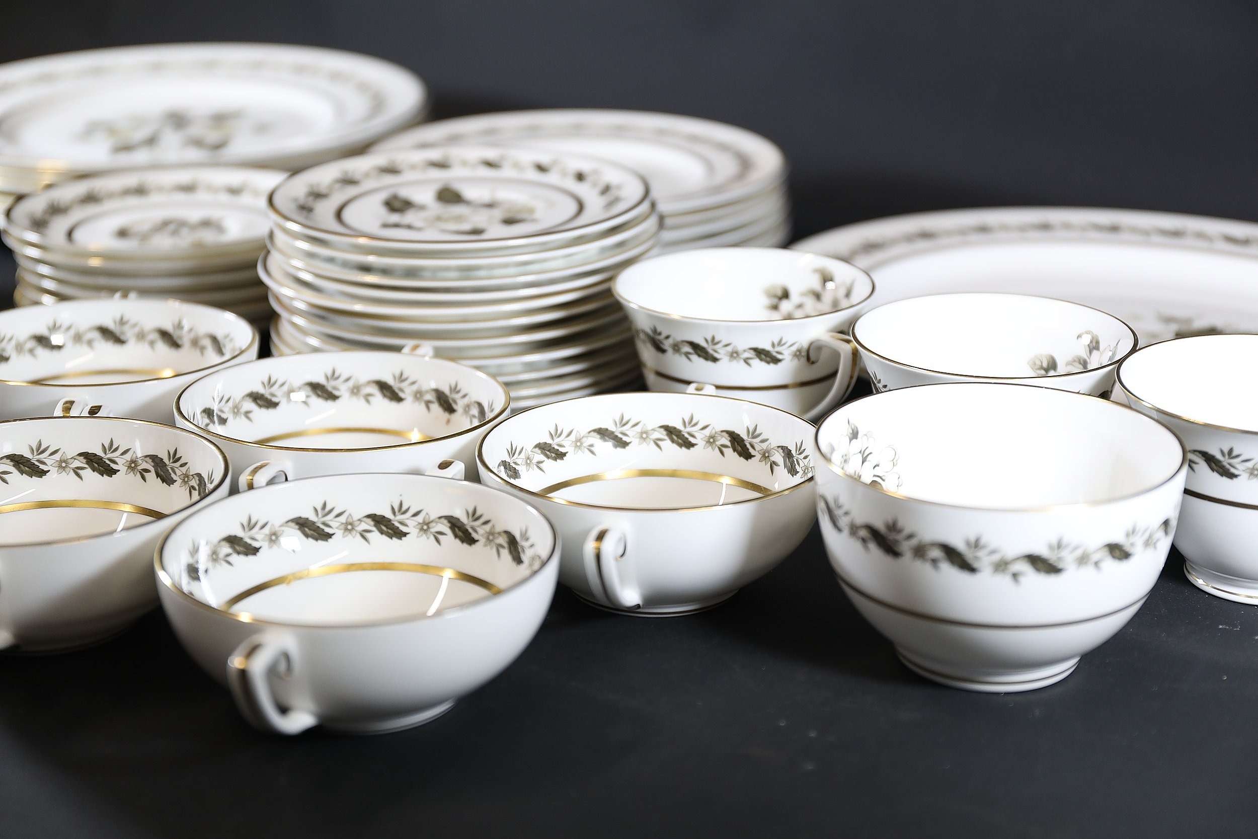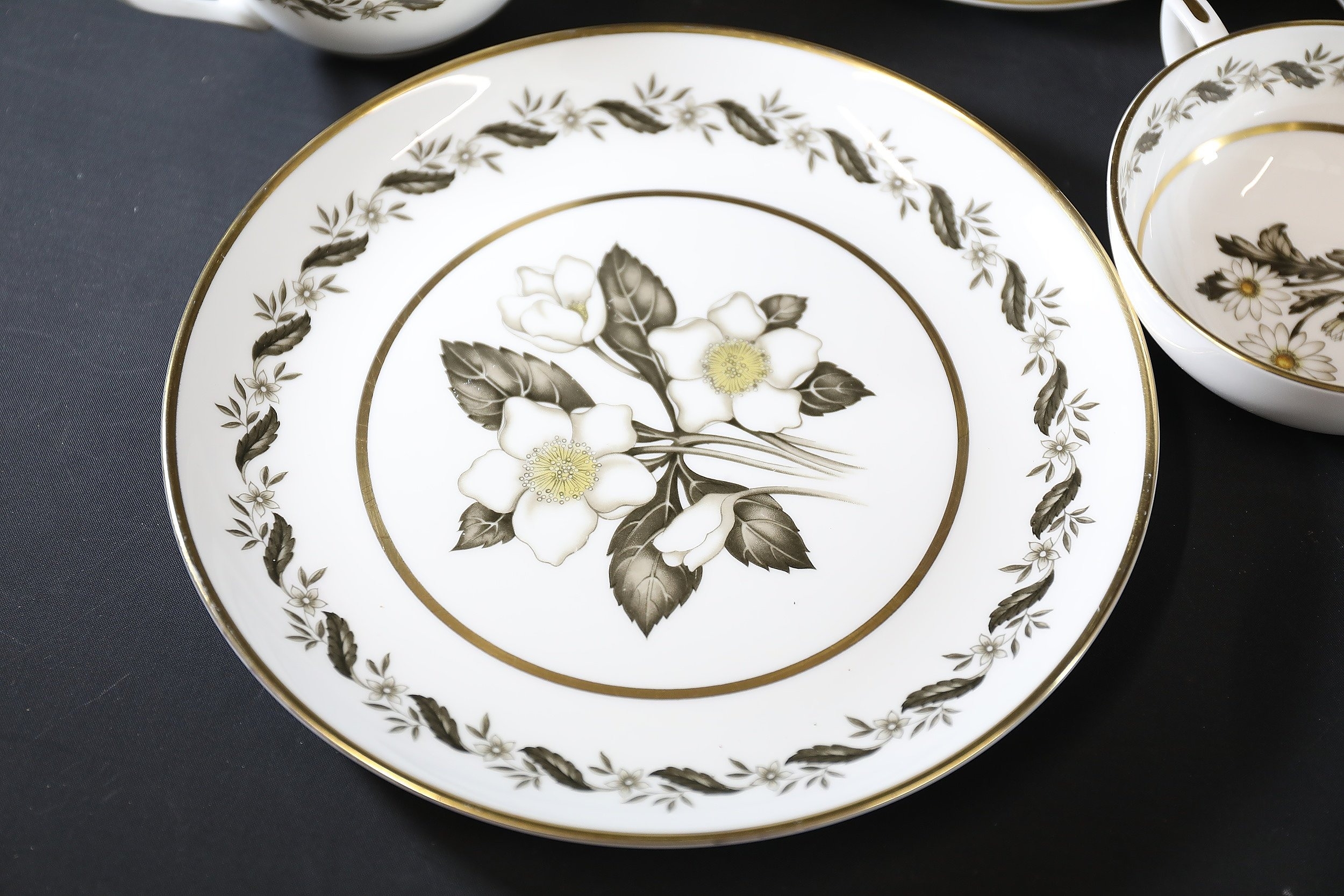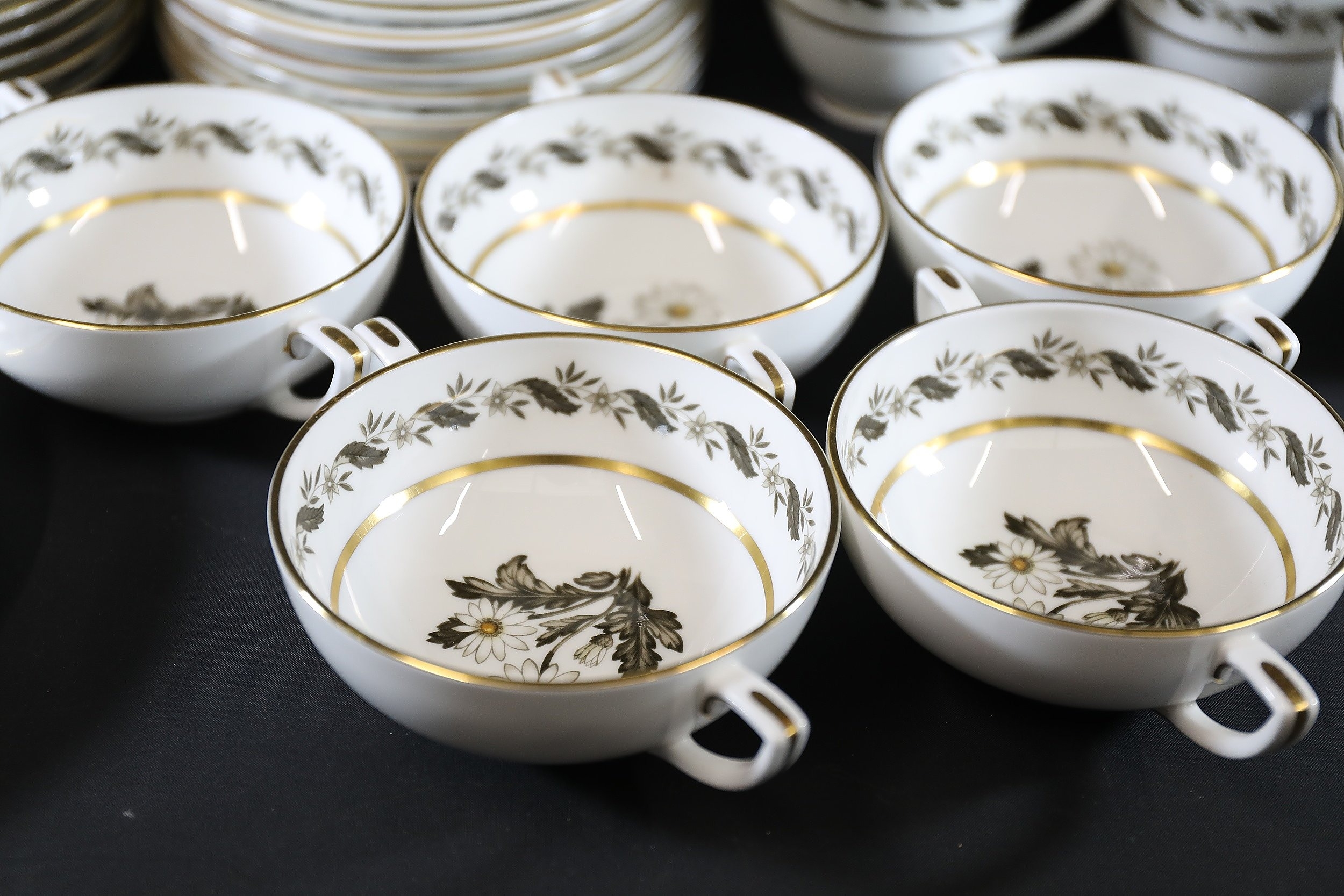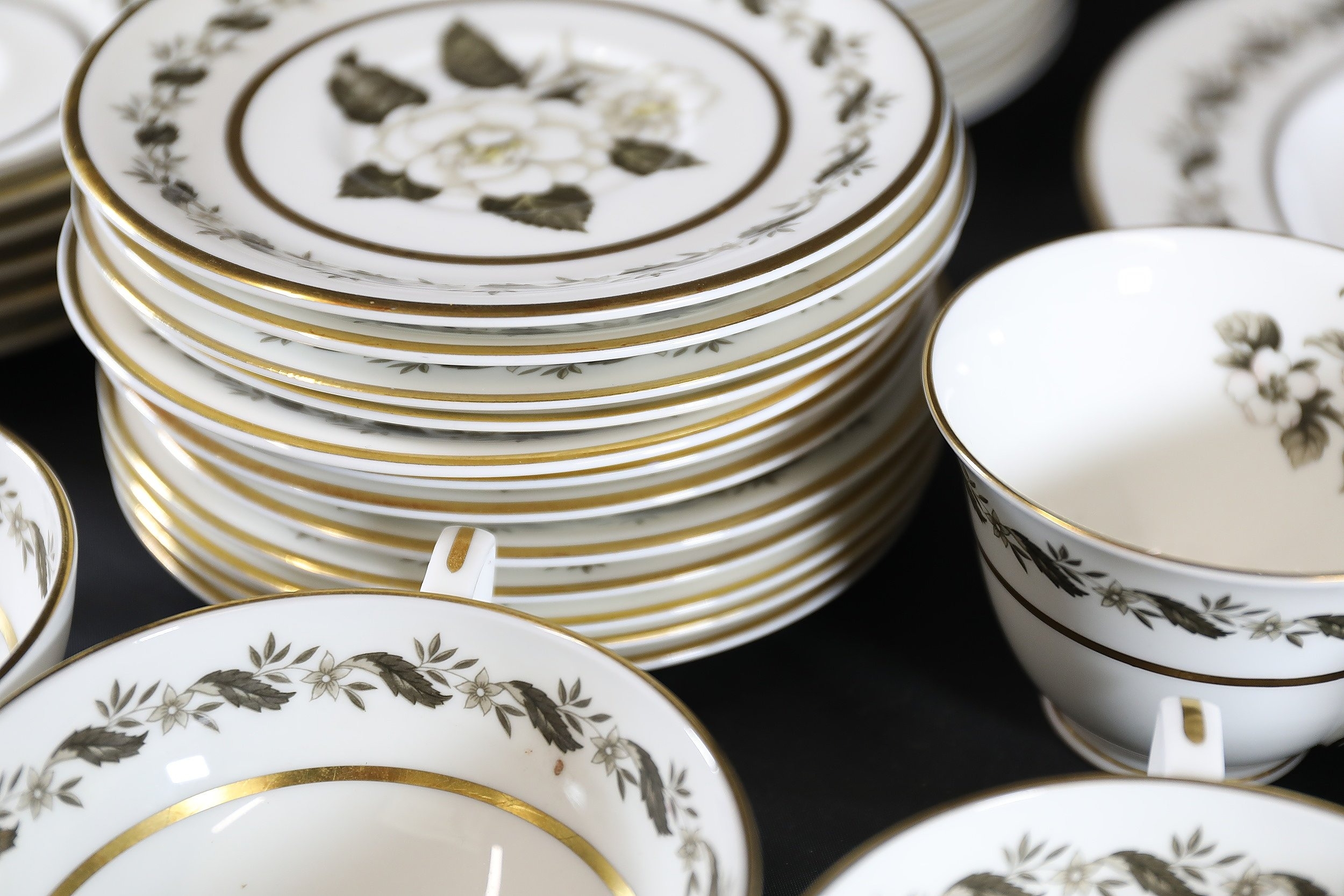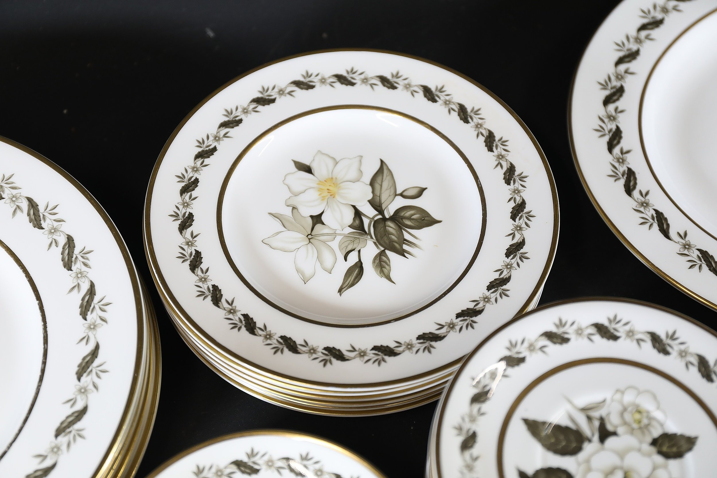 - **Plates:** Dinner plates, side plates, and dessert plates with central floral motifs and gold-edged borders.