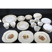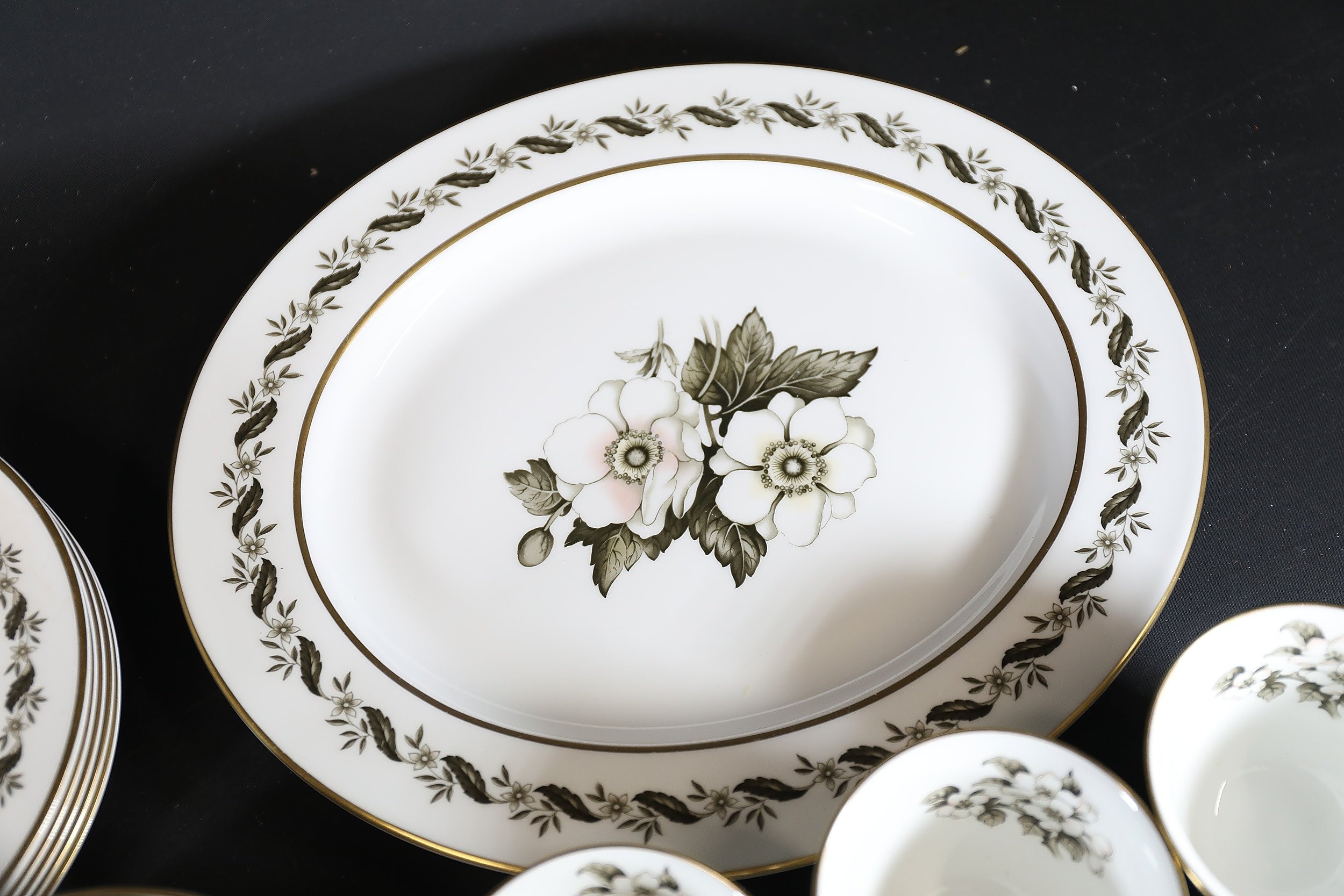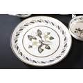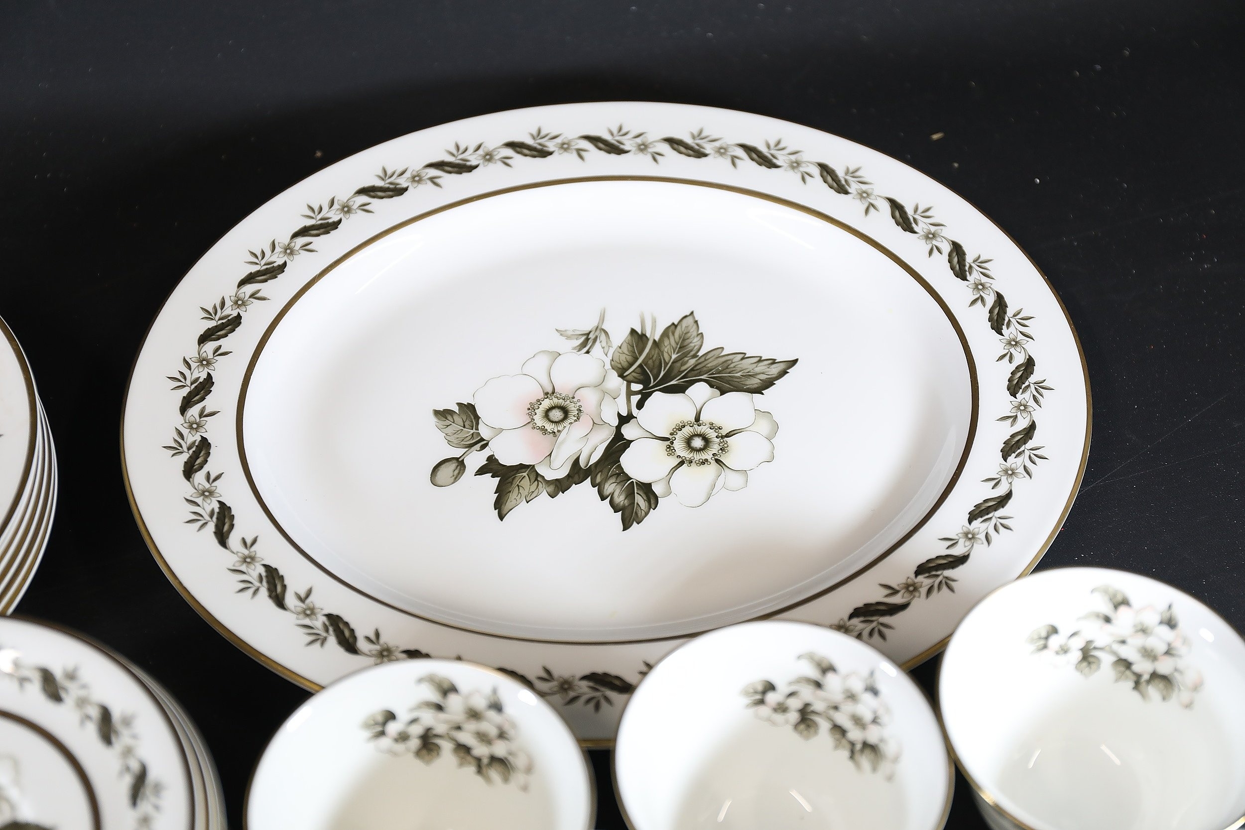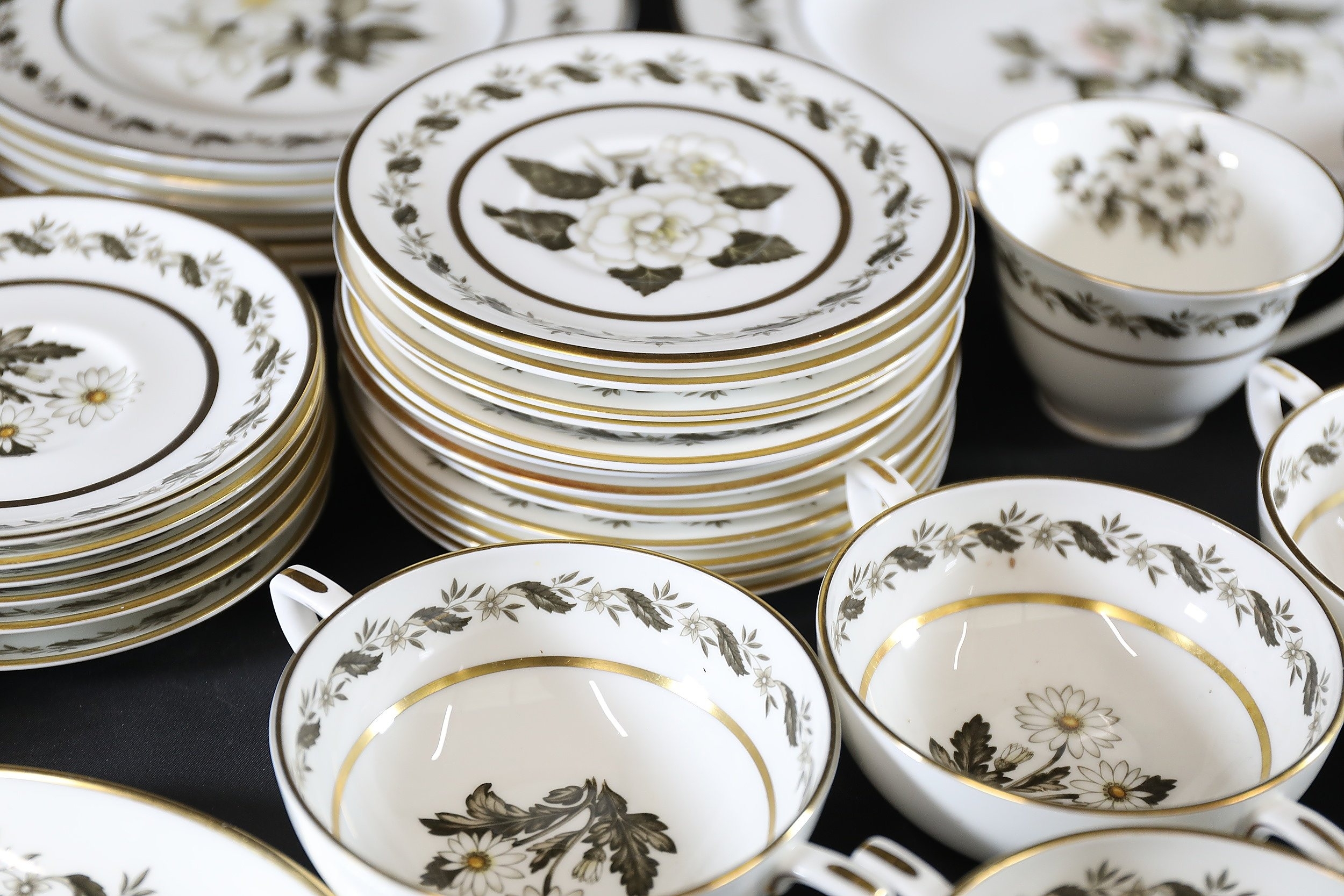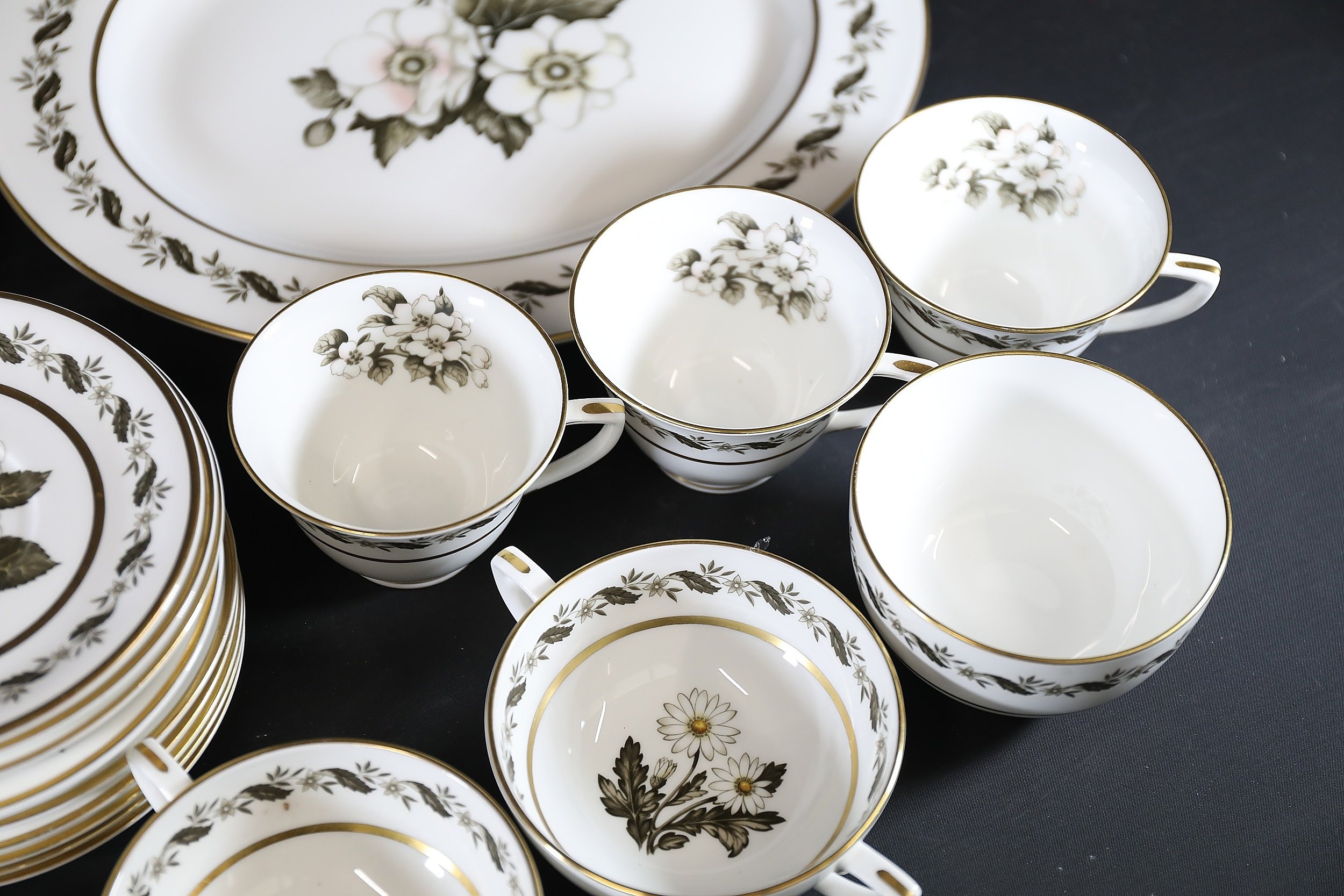 - **Plates:** Dinner plates, side plates, and dessert plates with central floral motifs and gold-edged borders.