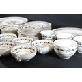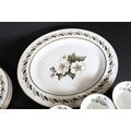 A mid-20th century Royal Worcester fine bone china dinner and tea set in the "Bernina" pattern. The set is crafted from high-quality porcelain featuring a crisp white finish adorned with muted green floral motifs, wreath-like leafy garlands, and thin gold trim on rims and edges.