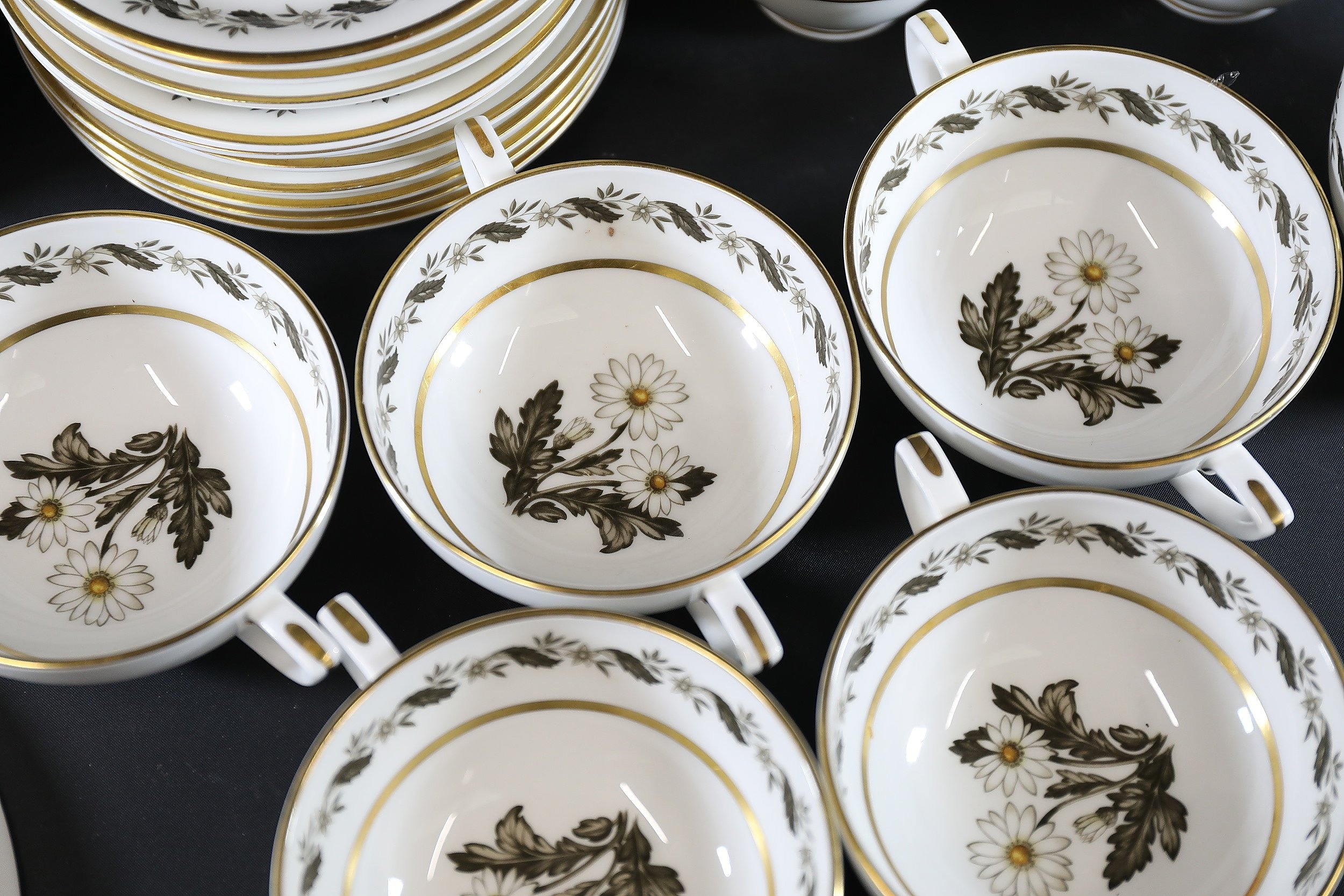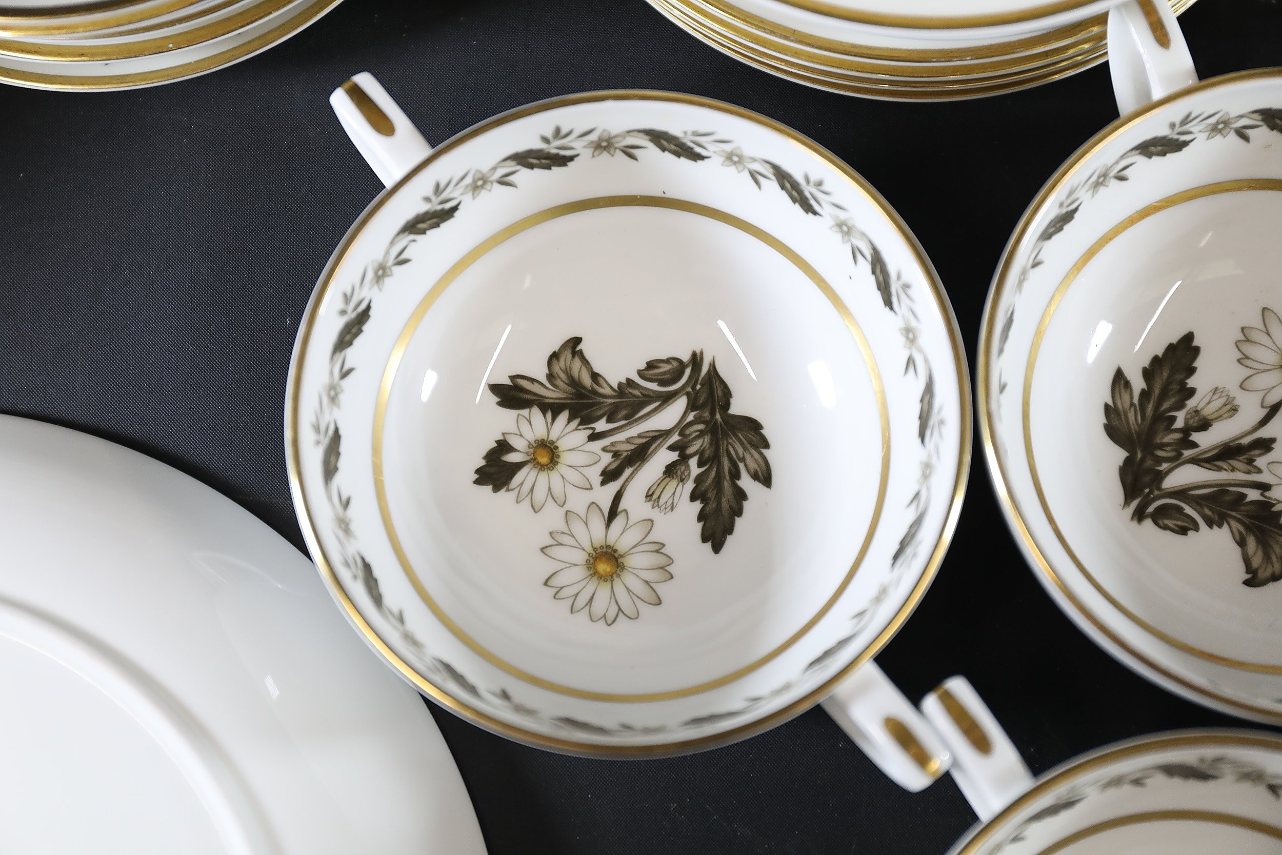 - **Design Elements:** Central botanical illustrations, repetitive garlands near edges, and polished gold trim, indicative of 1950s-1970s European formal tableware trends.