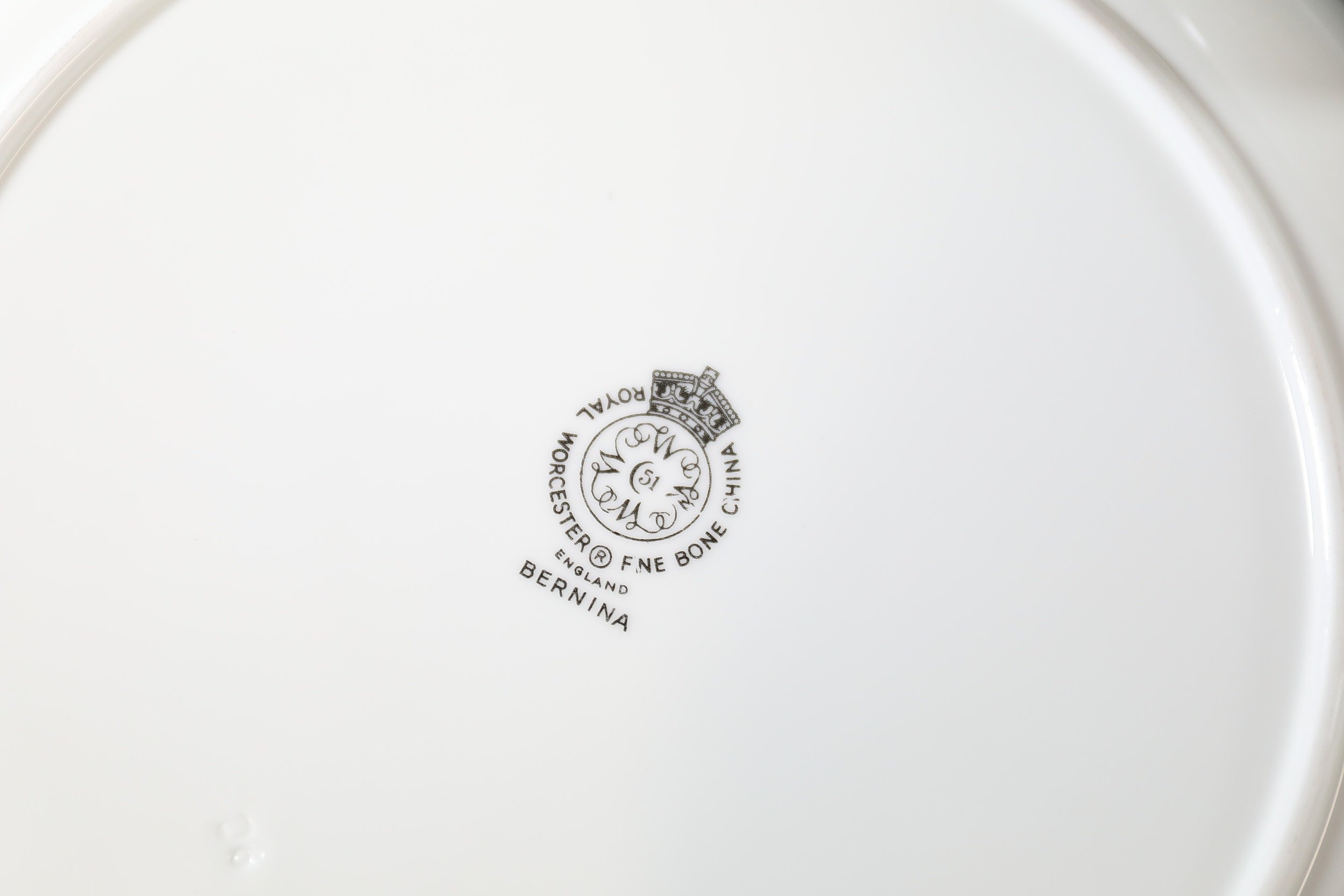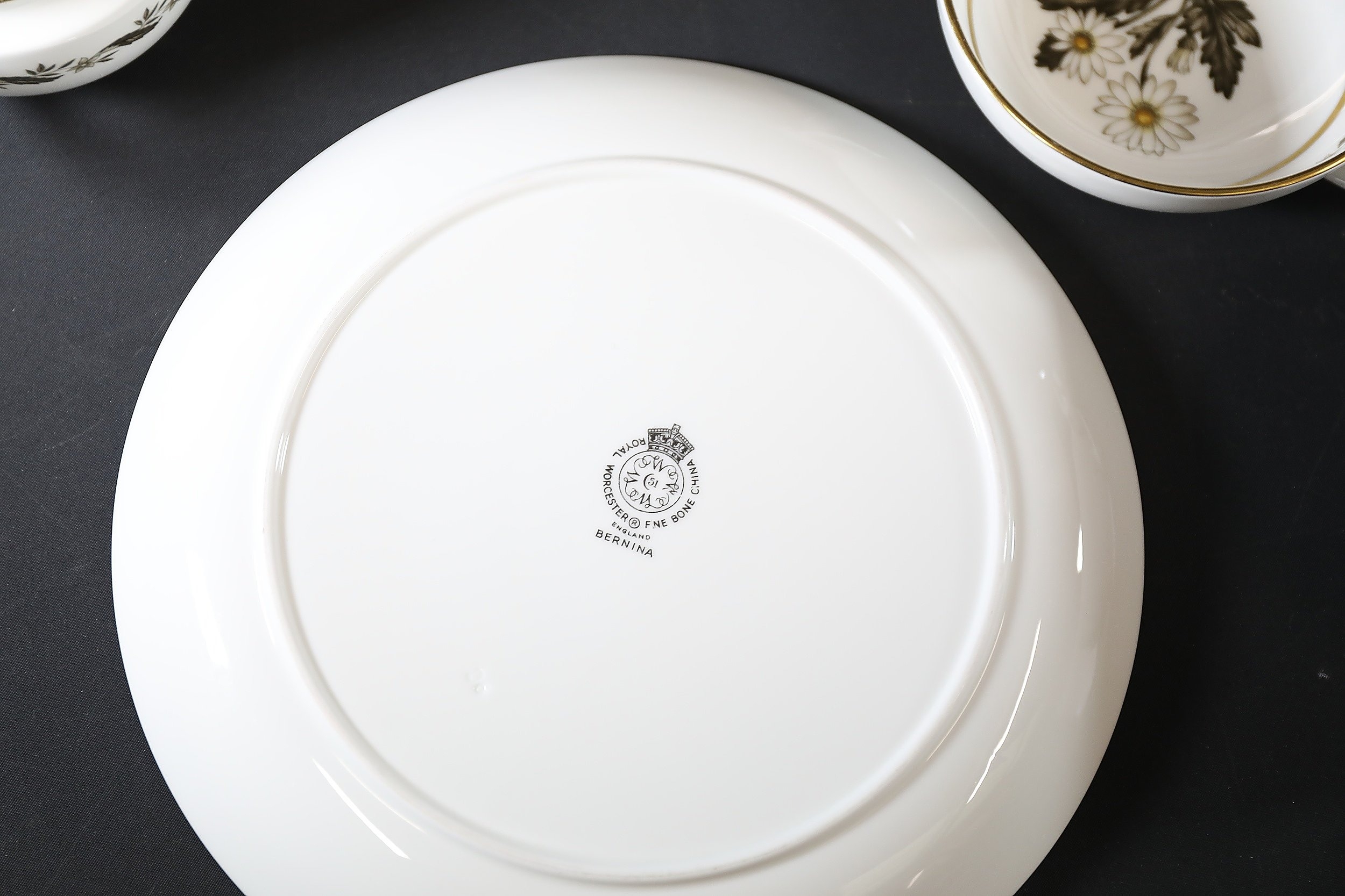 - **Markings:** Plates and other pieces bear the hallmark: "ROYAL WORCESTER FINE BONE CHINA, ENGLAND BERNINA," accompanied by the Royal Worcester crown and RW insignia, confirming authenticity and provenance.