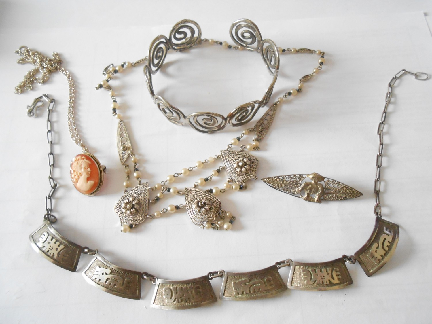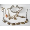 A carved shell cameo as a brooch/pendant, on a silver chain, a silver bangle of scroll form, a silver coloured metal necklace with Chinese panels, an Eastern silver brooch, the front decorated elephant and a silver coloured metal and simulated pearl fringed necklace