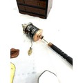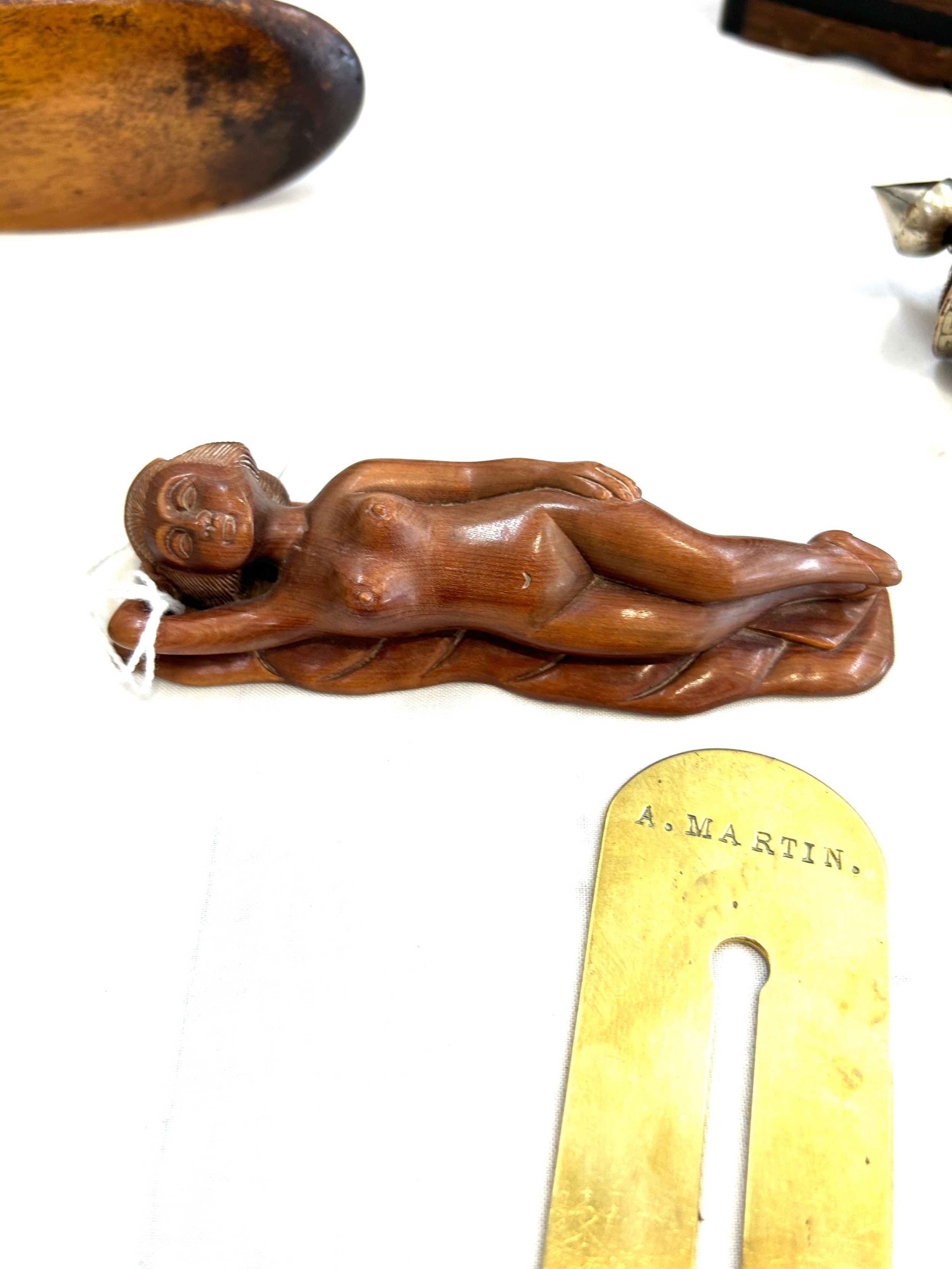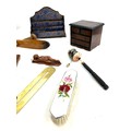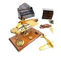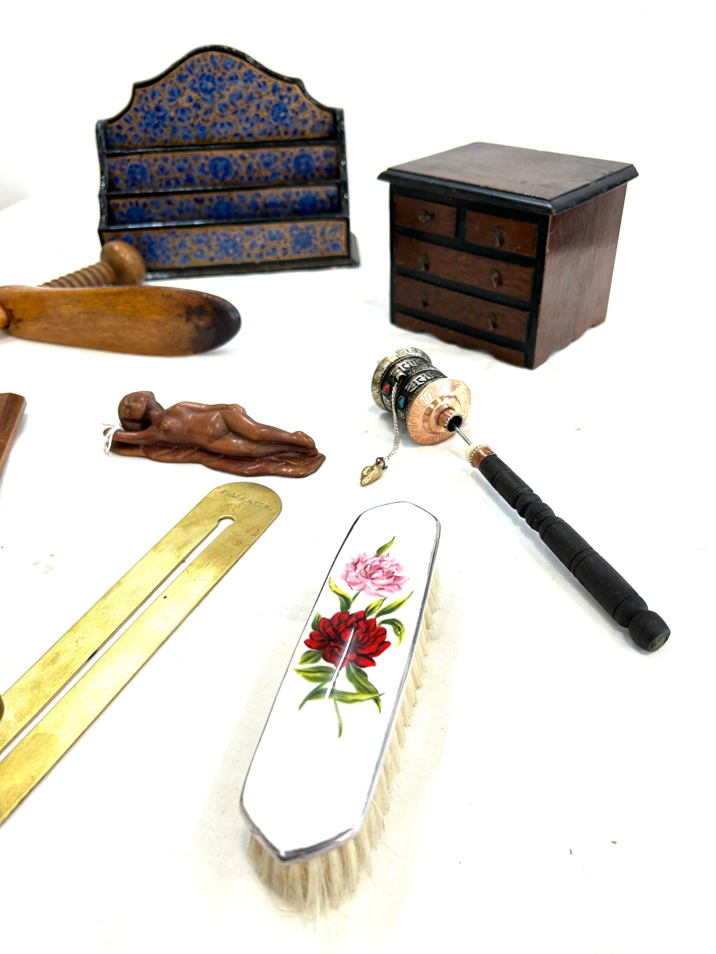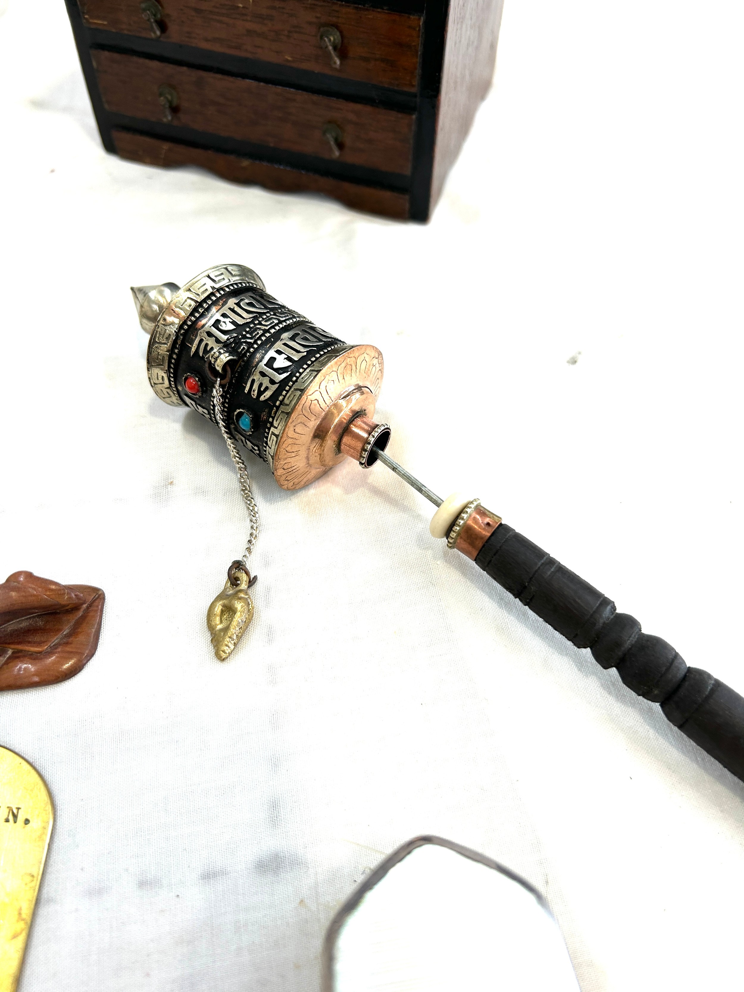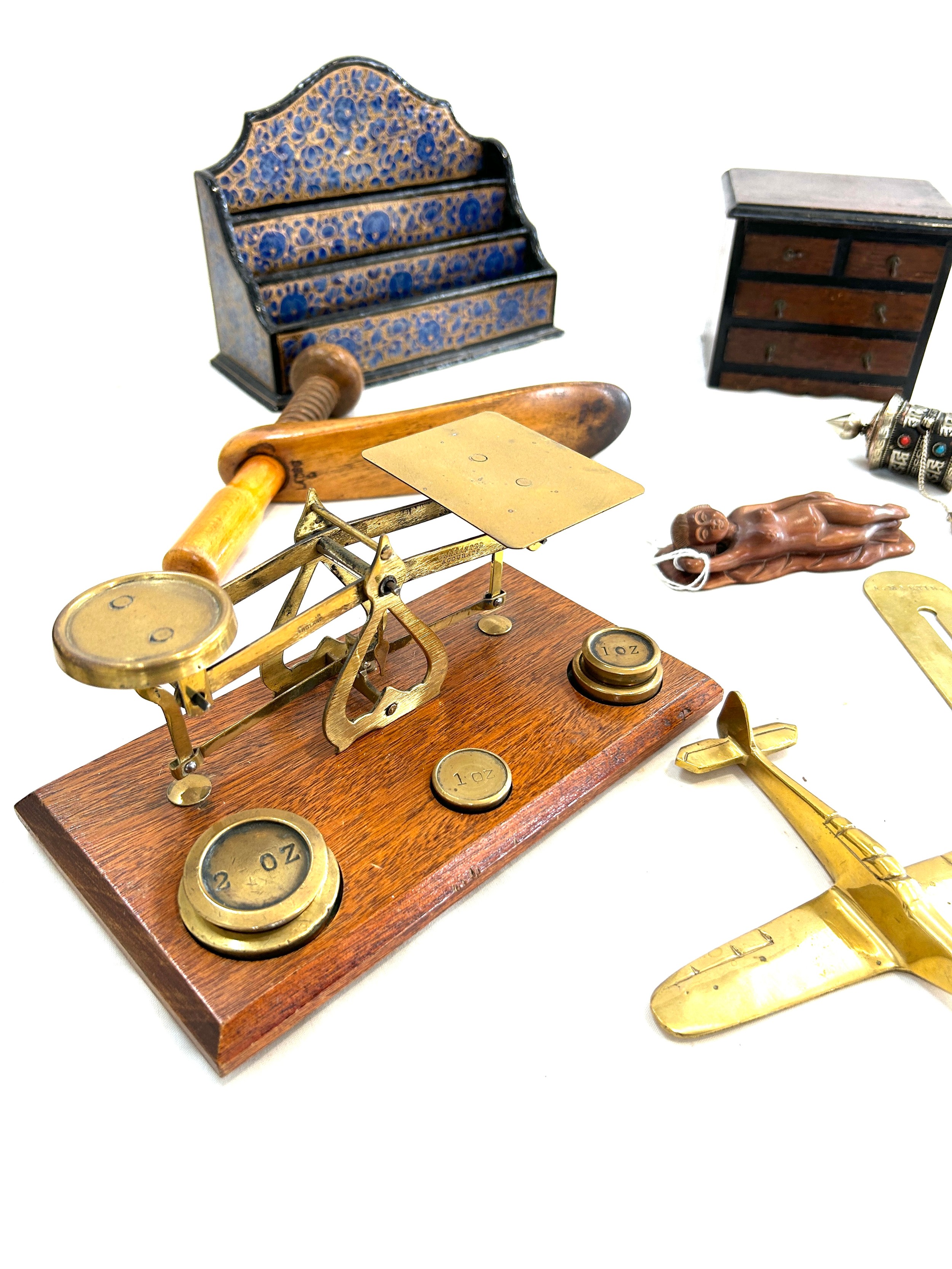 Selection of collectable items to include a Jewish pray wheel, vintage small scales, shoe last, musical wooden box