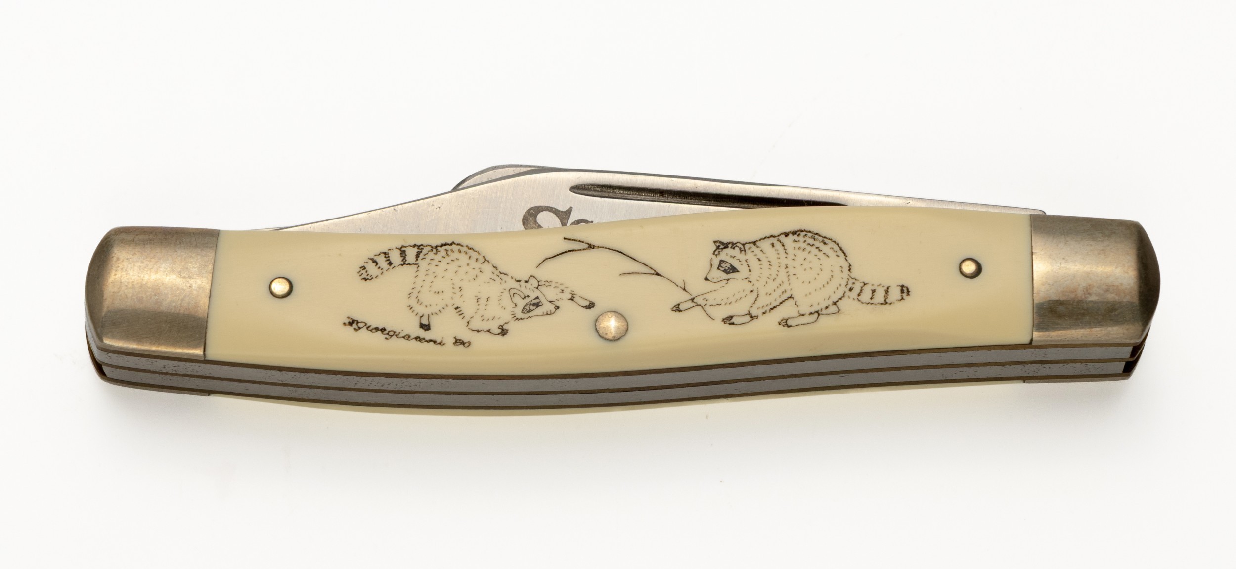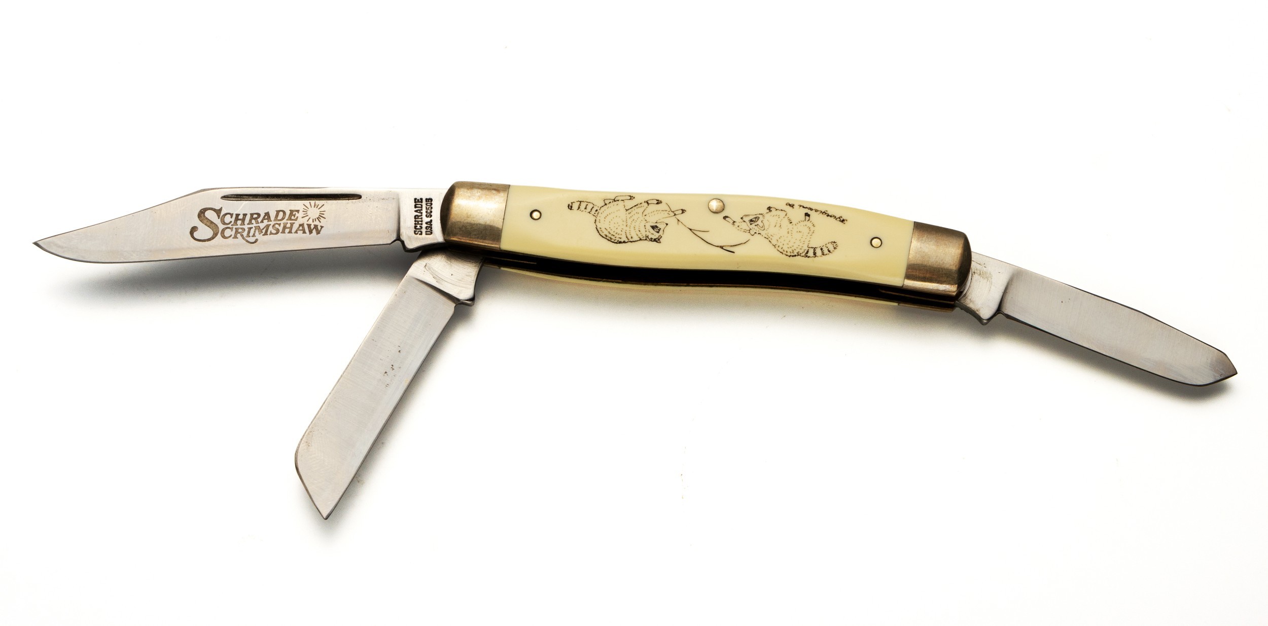 The engraved bone handle depicting two raccoons, three fold out blades, the handle 10cm long, the longest blade 7cm long