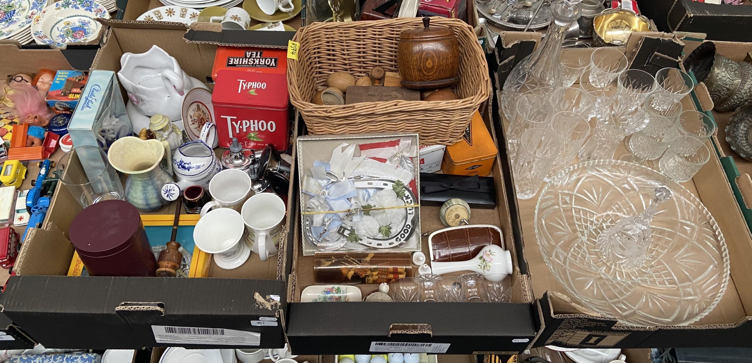 3 Boxes containing glassware, Sylvac and a cut glass decanter