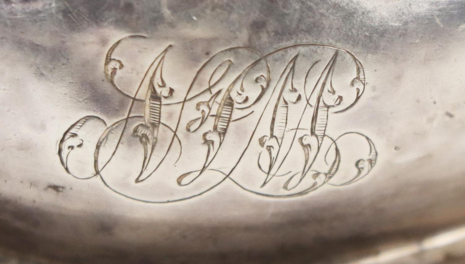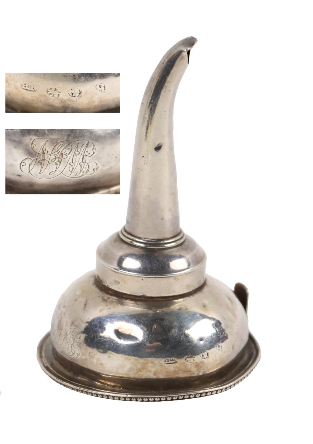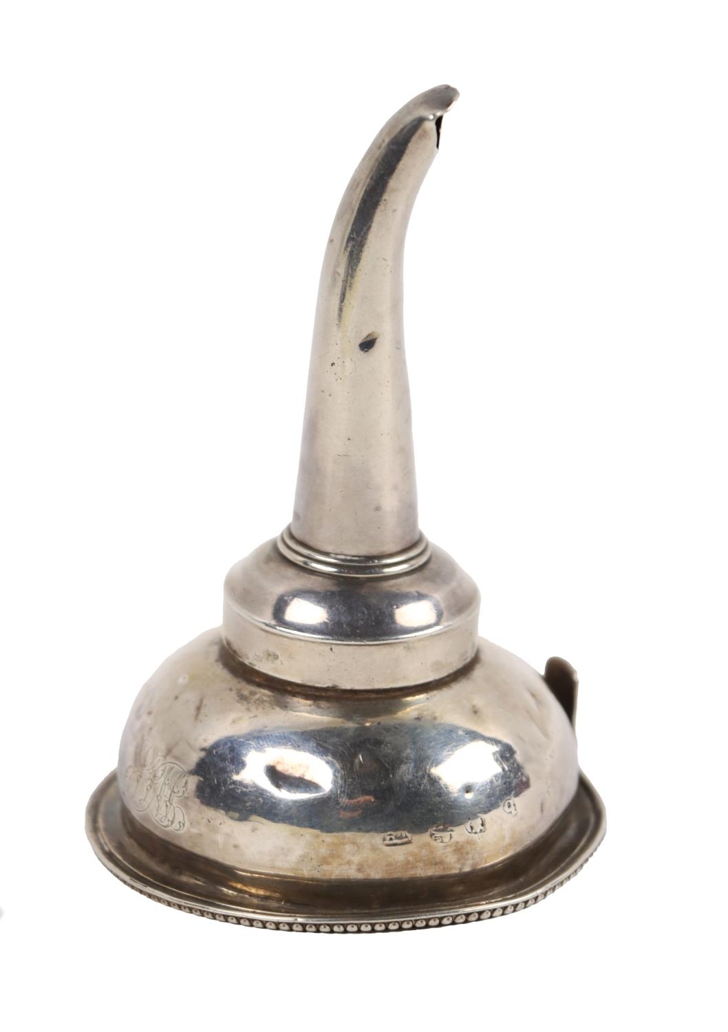 A Georgian period silver Wine Funnel, (two parts) with engraved monogram, hallmarked London, Benjamin Norton, c. 1831, approx. 2.4 ounces. (1)