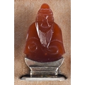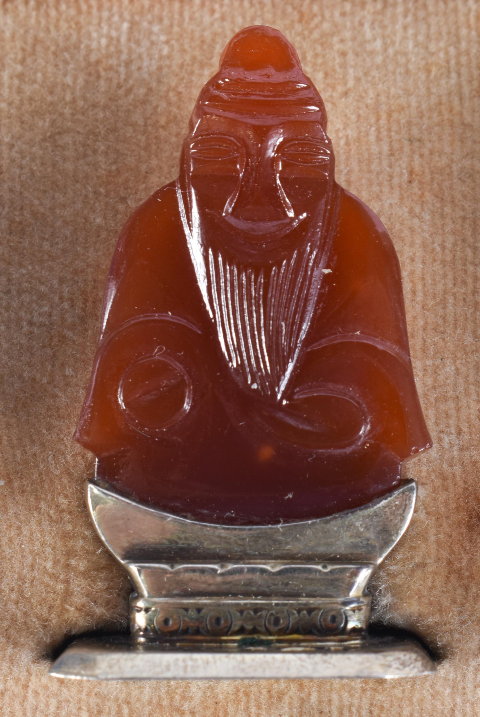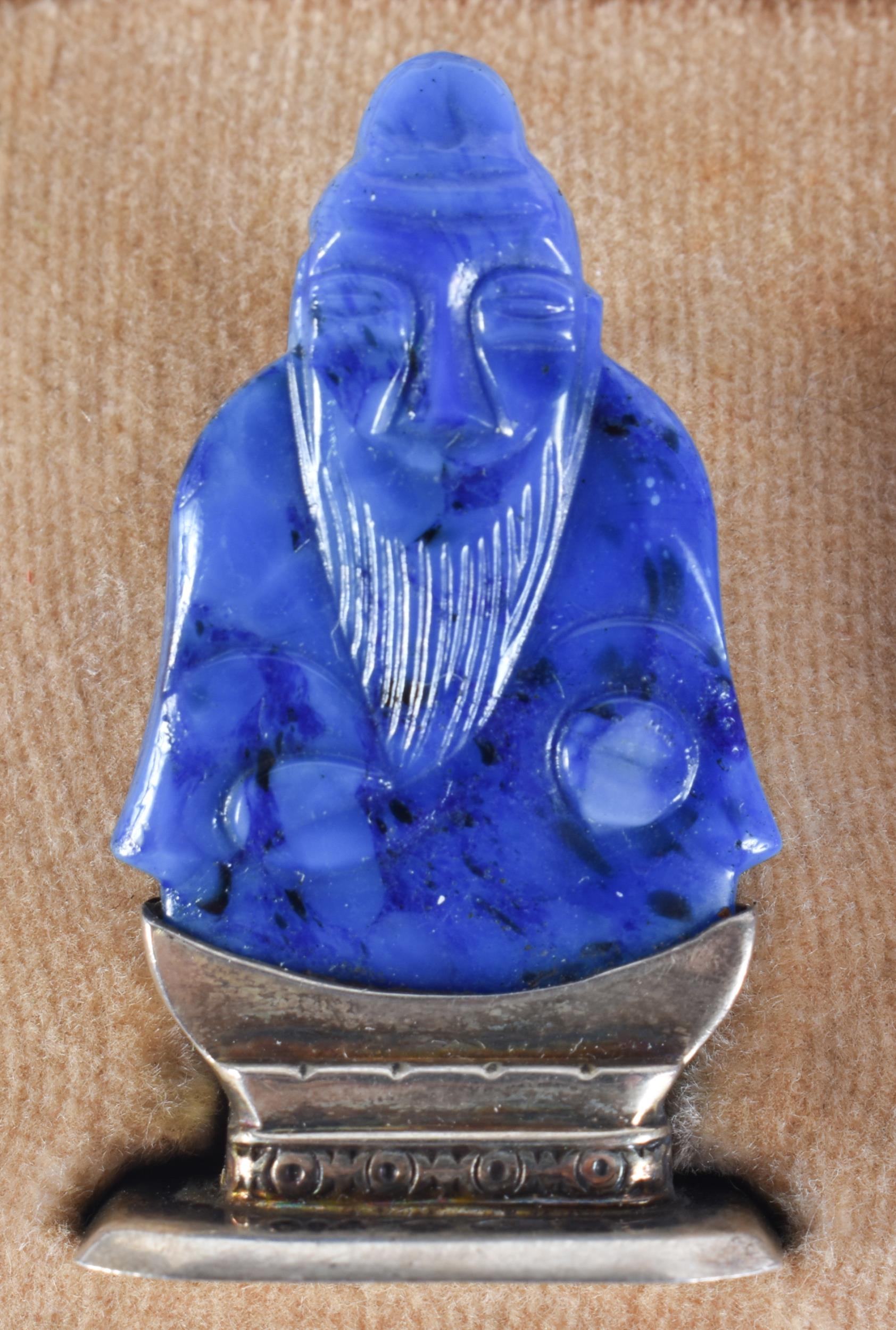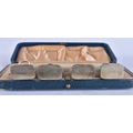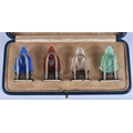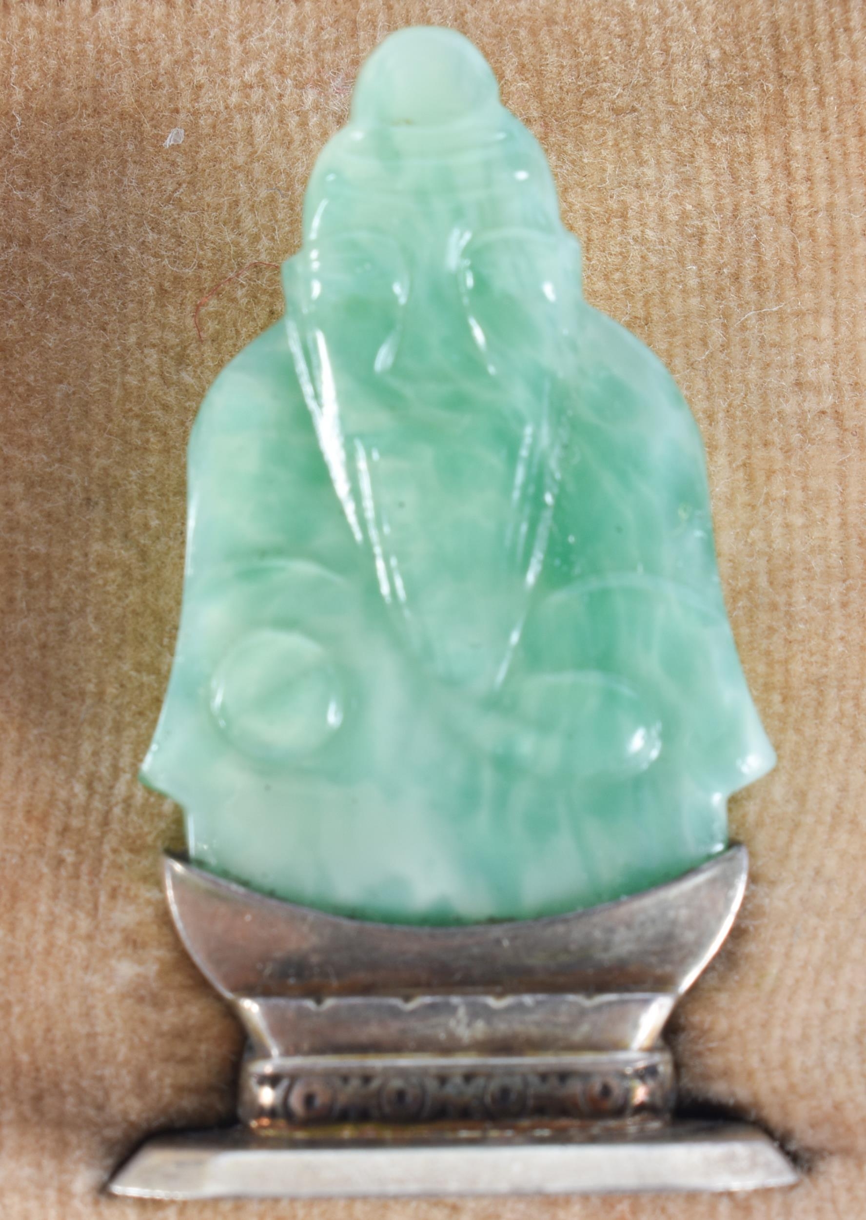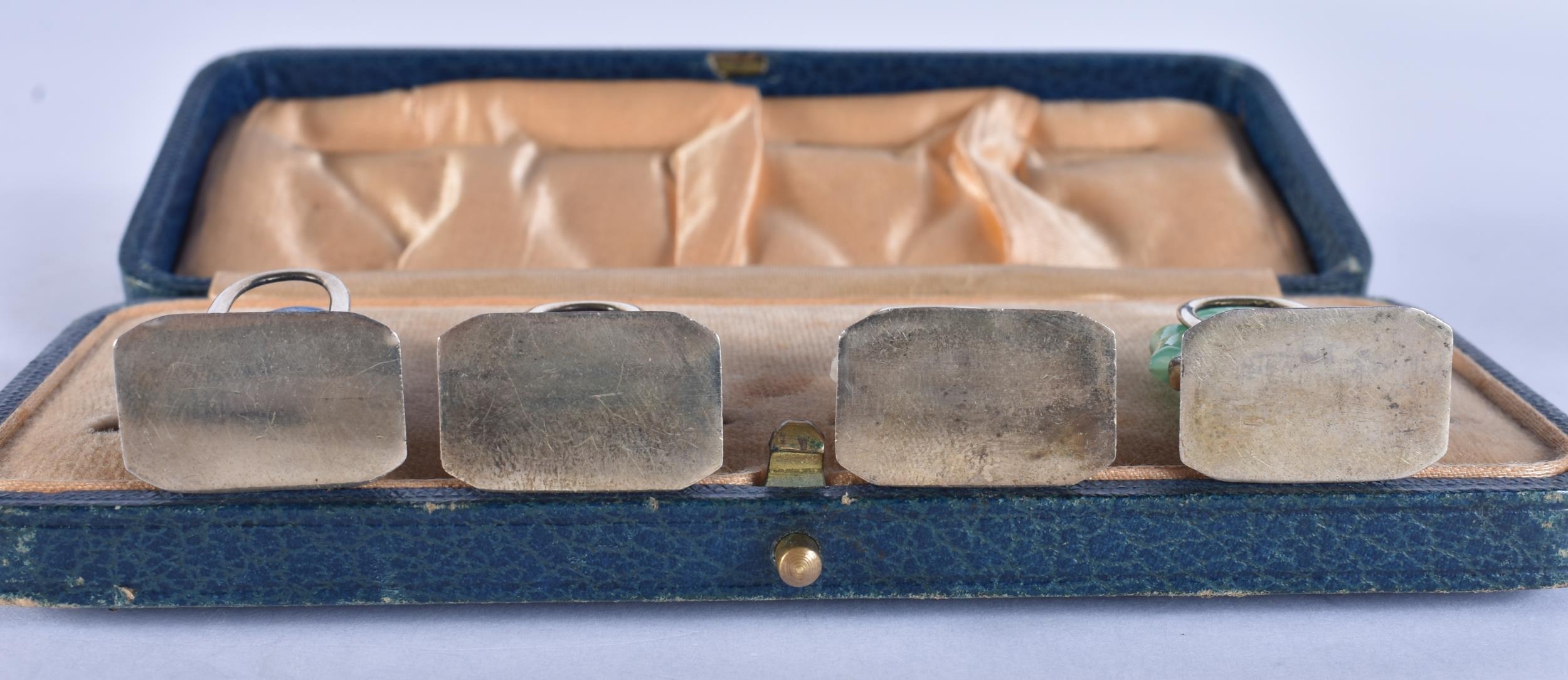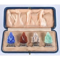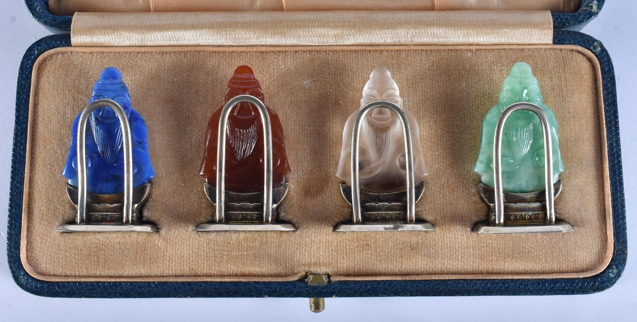 A LOVELY SET OF 19TH CENTURY CHINESE JADE, AGATE AND HARDSTONE SILVER MENU HOLDERS. 4 cm high.