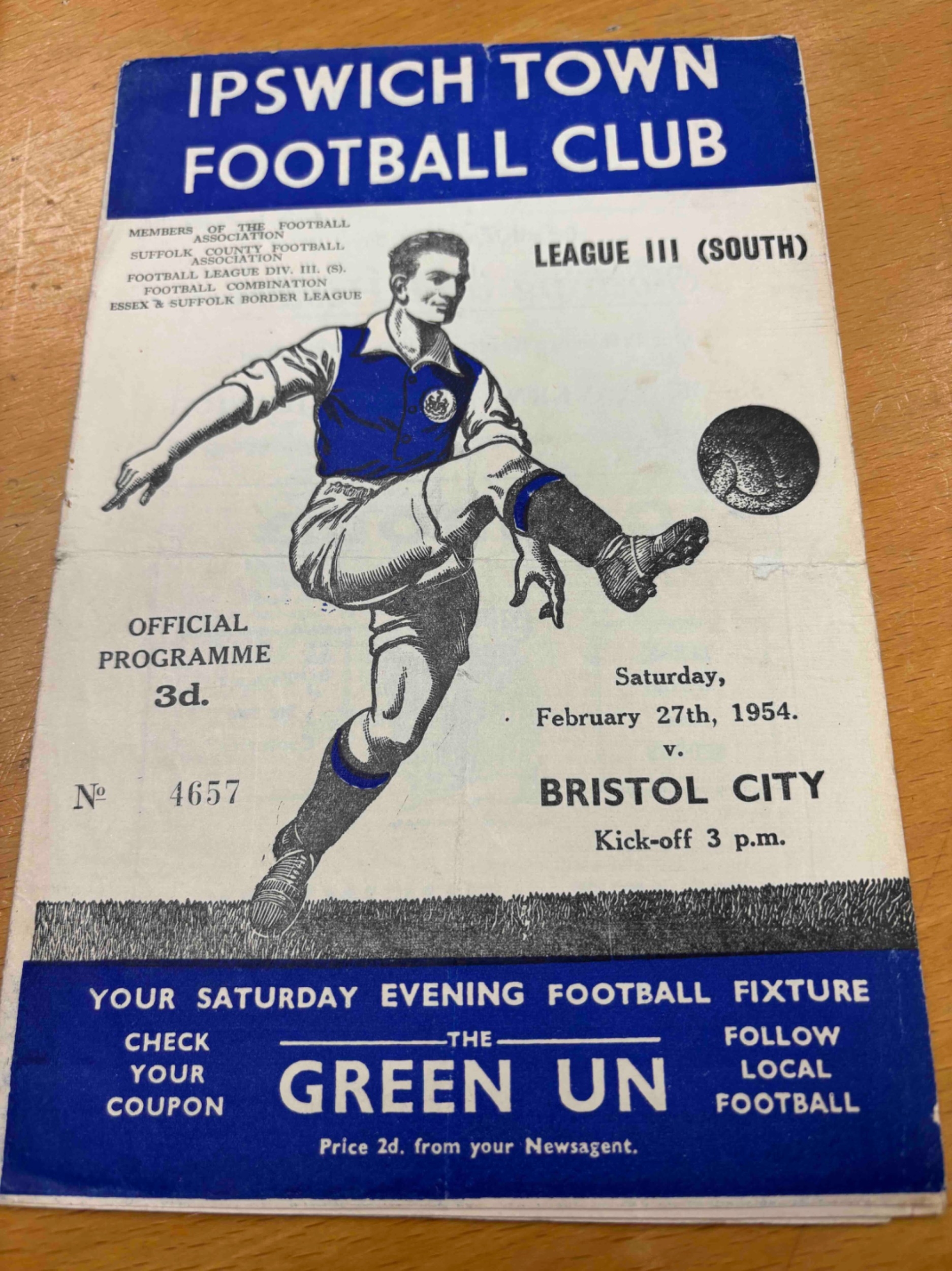 1953/54 Ipswich Town v Bristol City. Tear on middle fold. .