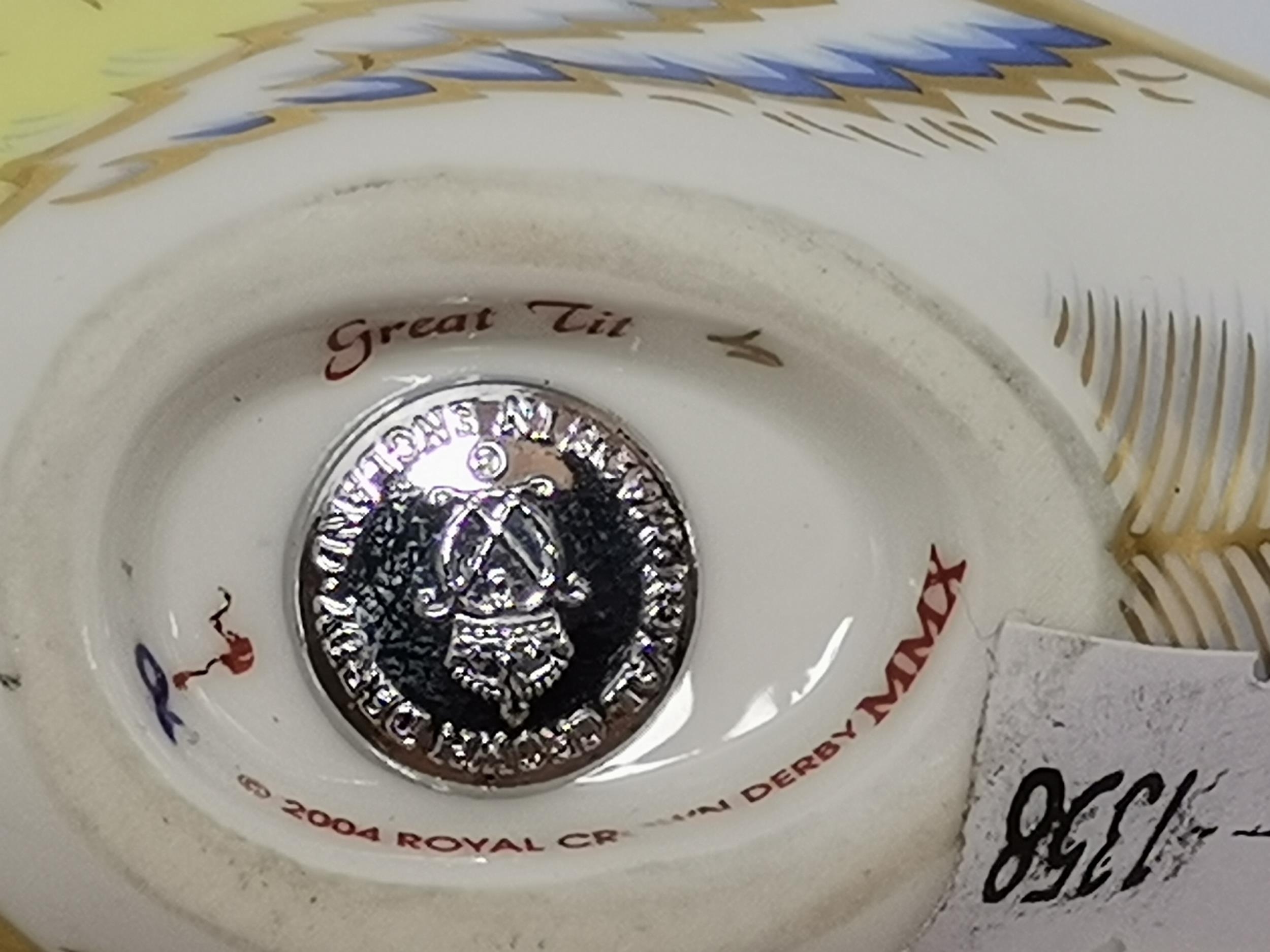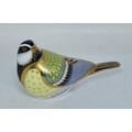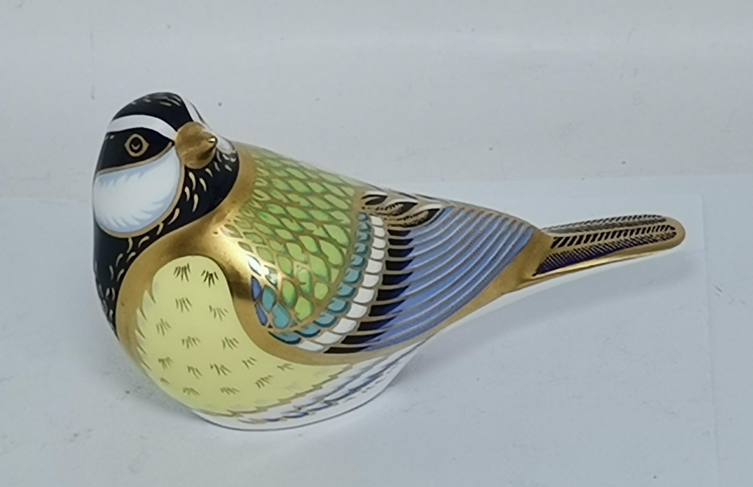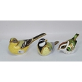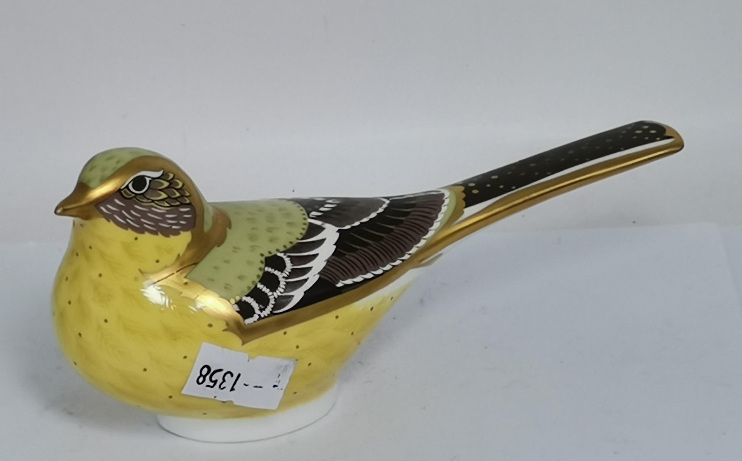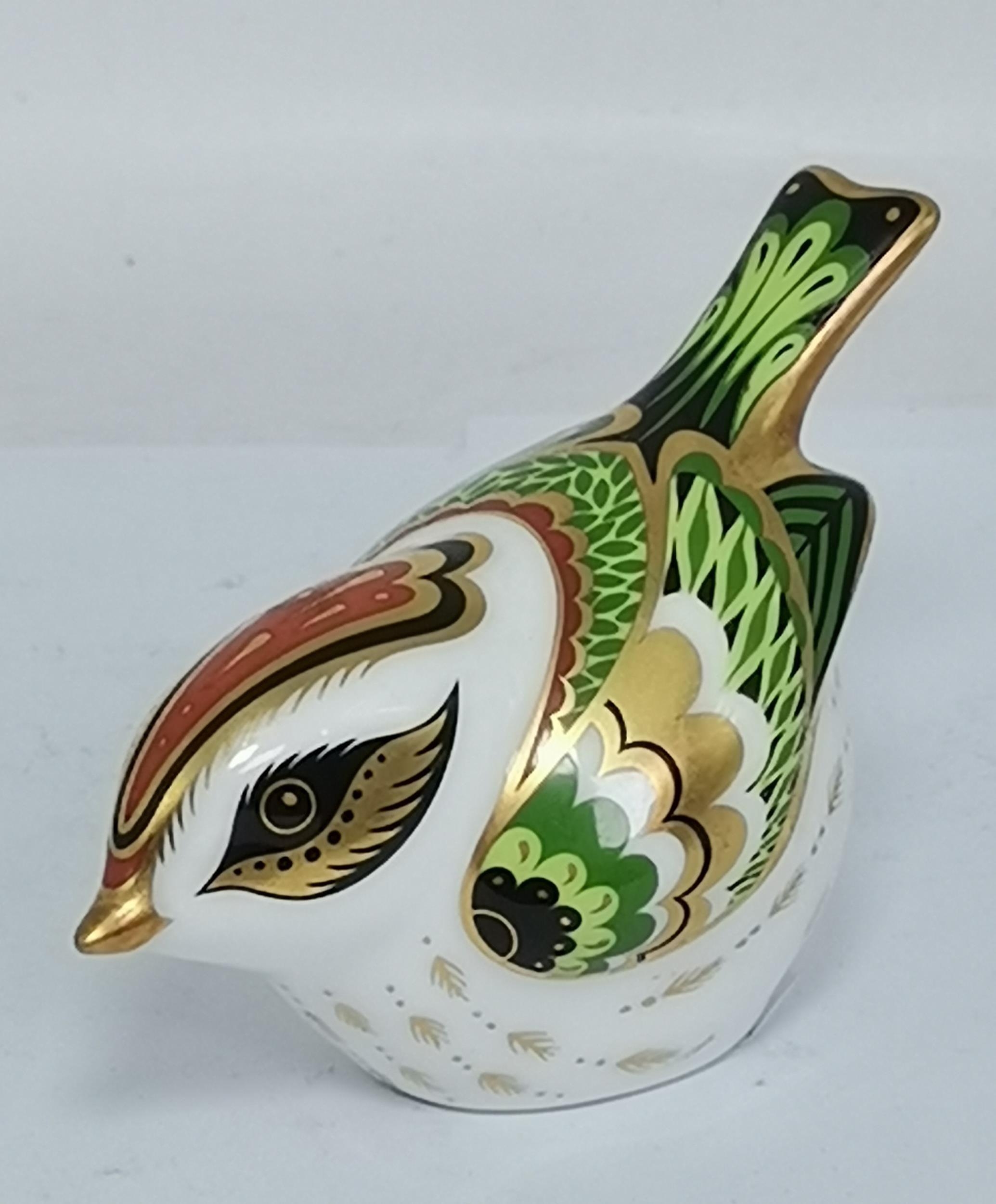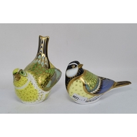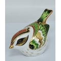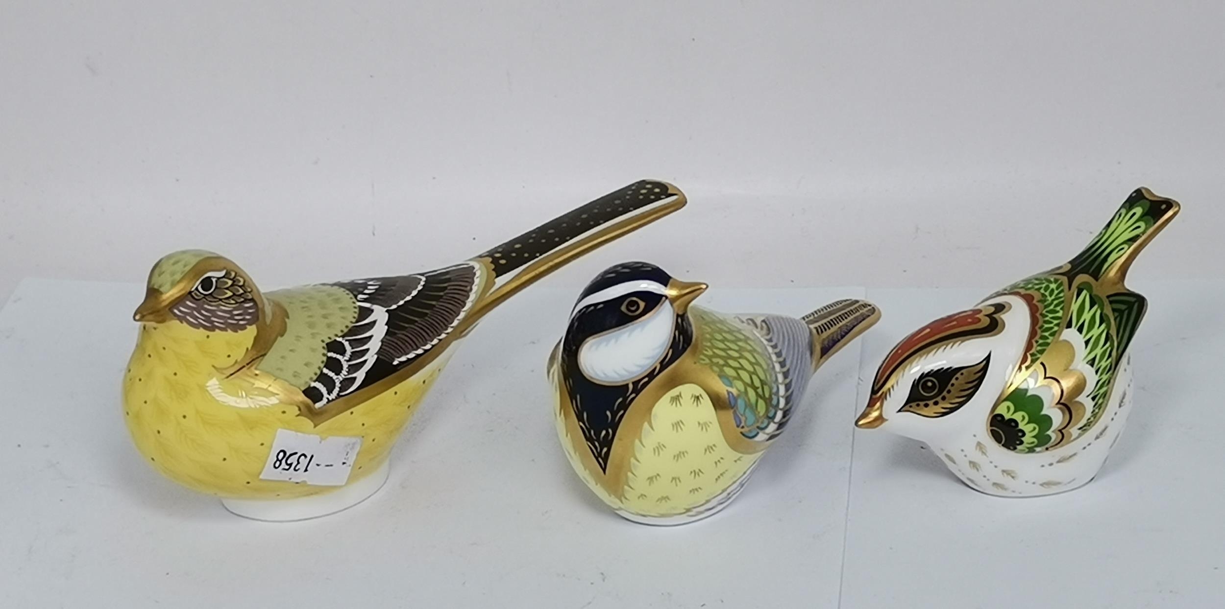 Crown Derby Yellow Wagtail, Great Tit and Firecrest paperweights, all with silver stoppers