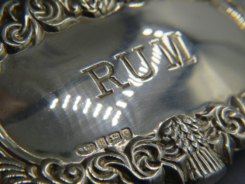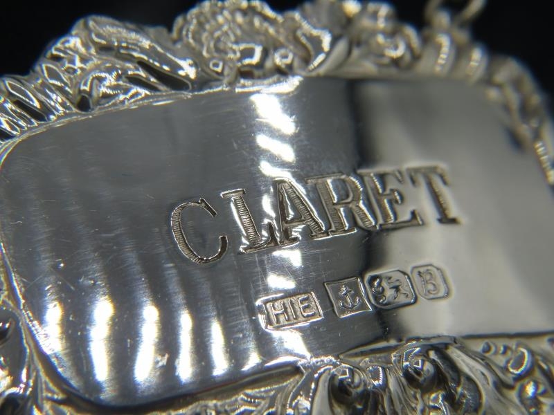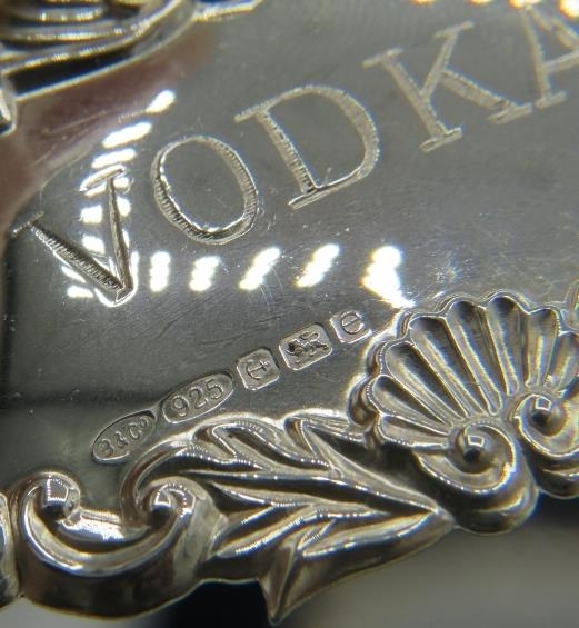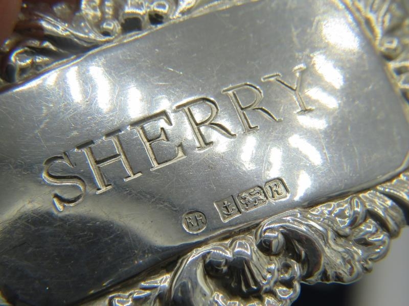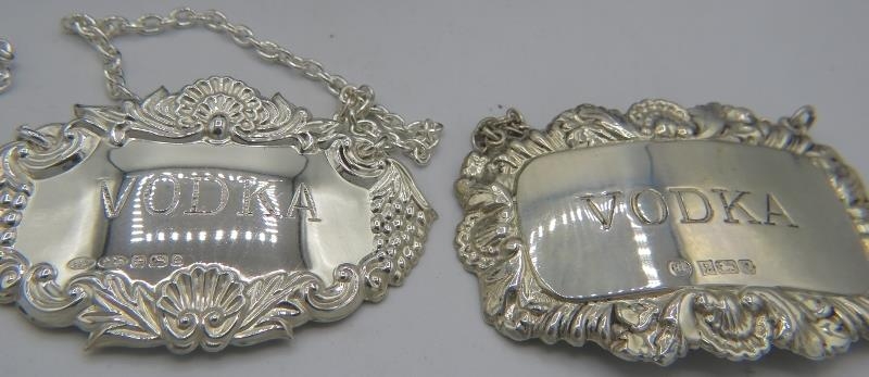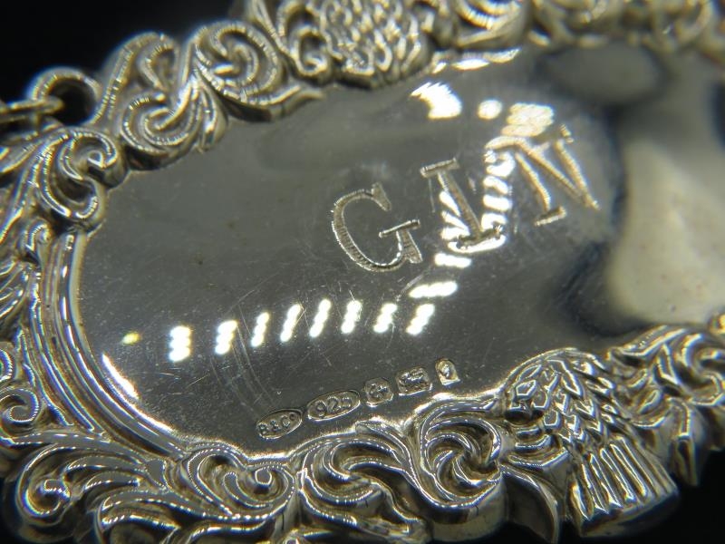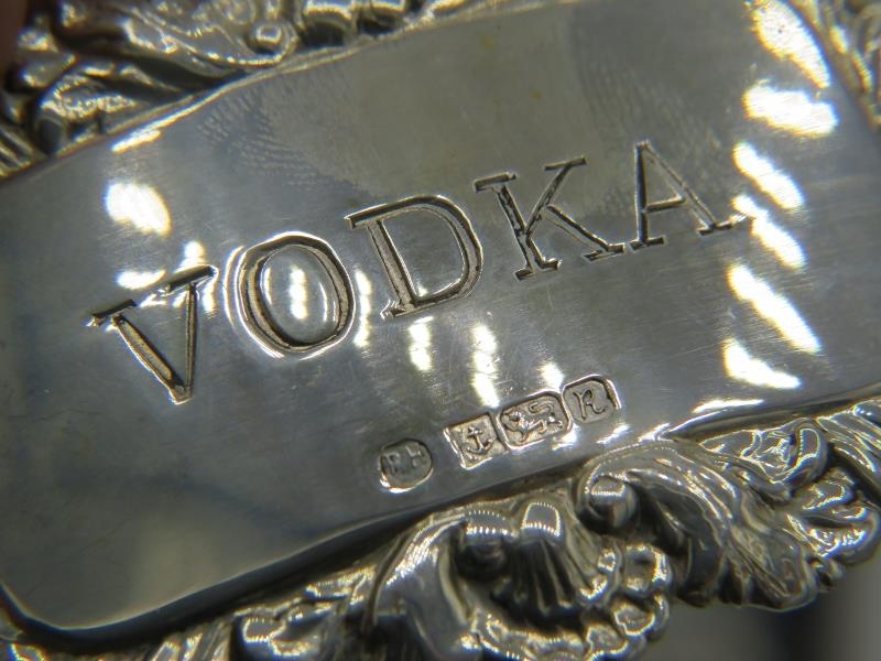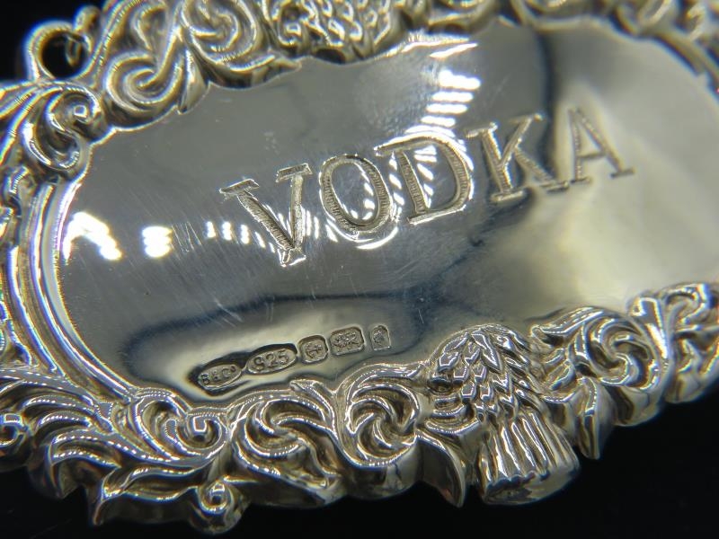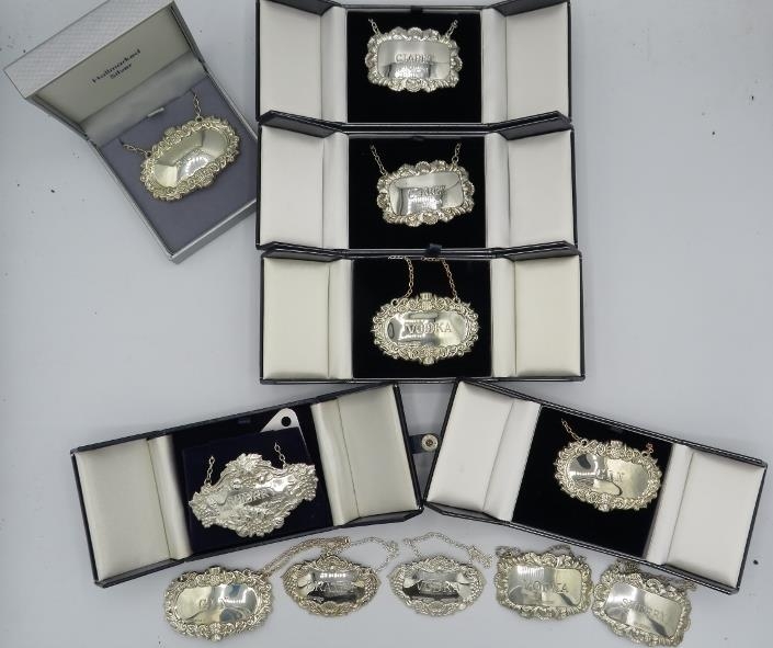 Eleven brand new Georgian style silver decanter labels for Claret, Sherry, Vodka, Brandy, Rum & Gin, all fully hallmarked, six boxed (11). Gross weight approx 139 grams/4.46 troy oz.