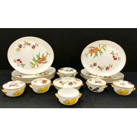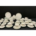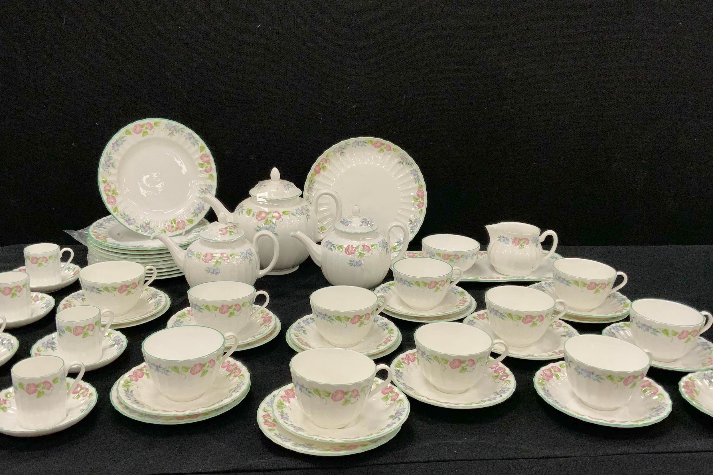 Royal Worcester English garden pattern comprised of, a tea pot, two smaller tea pots, milk jug, sugar bowl, twelve tea cups and saucers, ten dessert plates, eight tea plates, seven coffee cans and saucers, sandwich plate, a picnic plate.