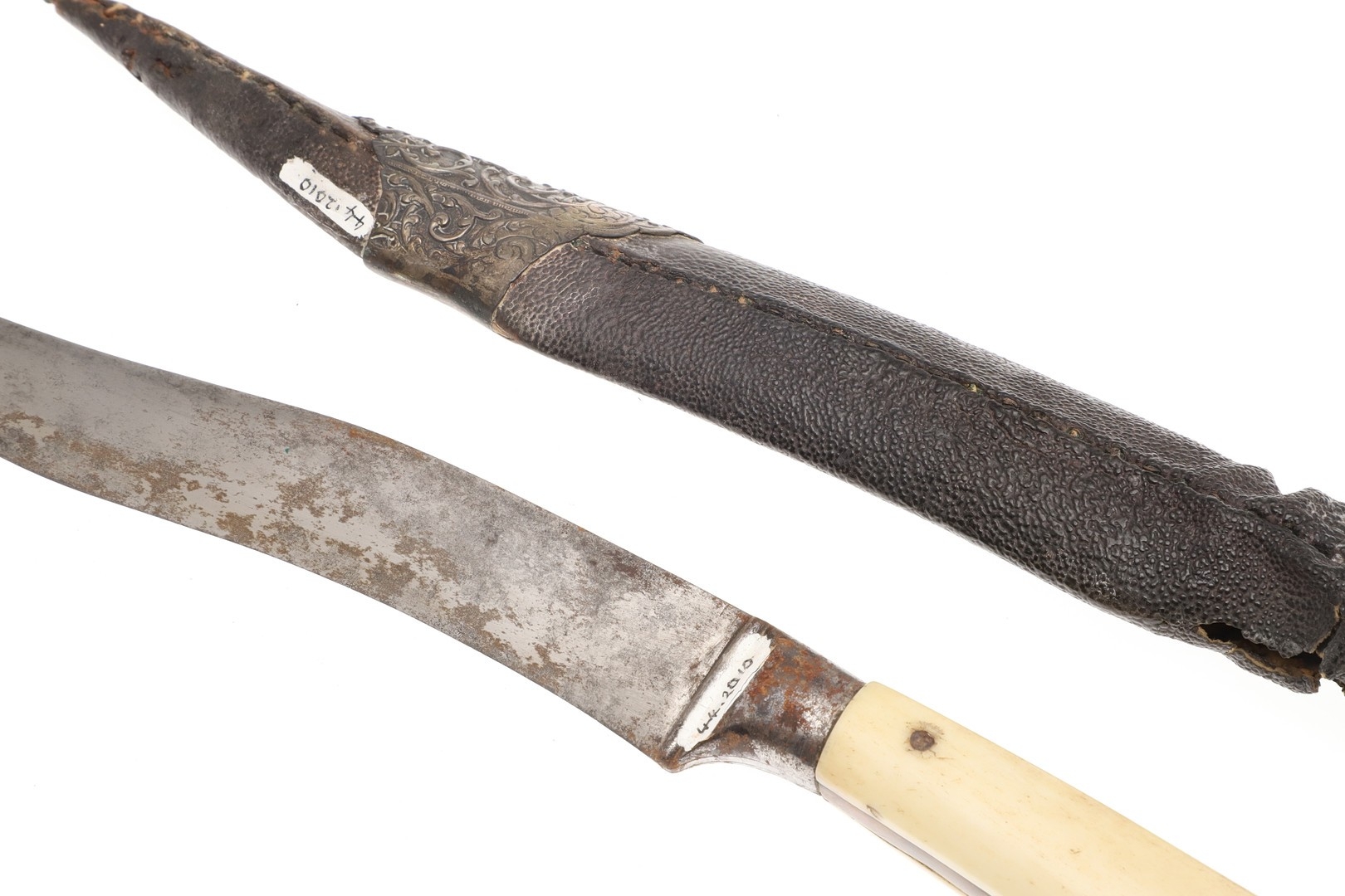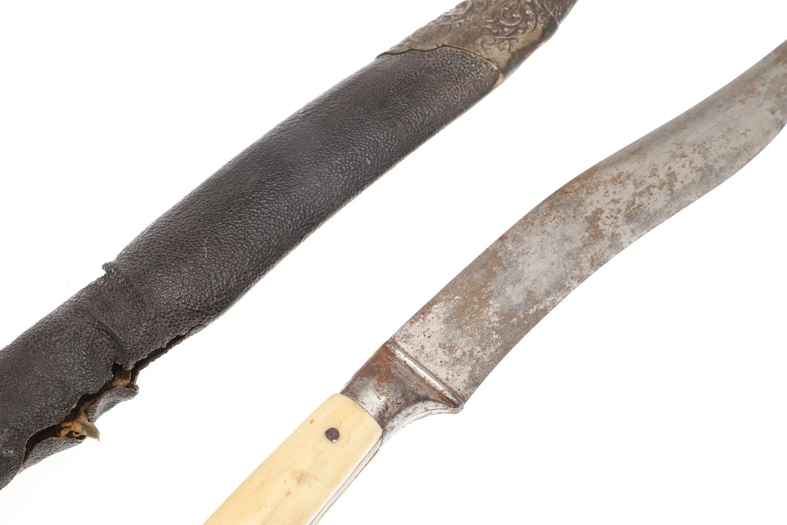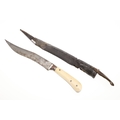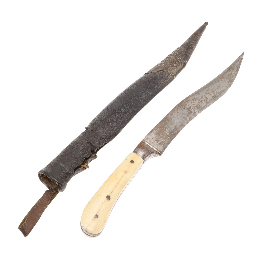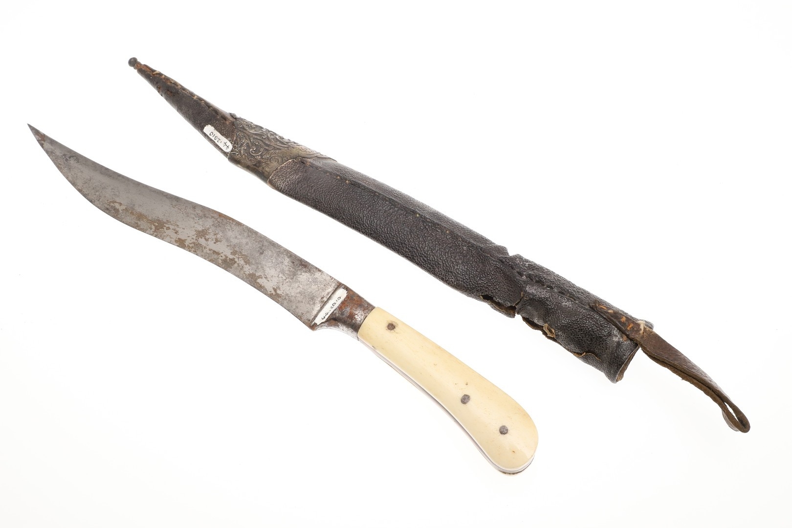 A PERSIAN ZIRAH BOUK ARMOUR PIERCING DAGGER. The dagger having a 20 cm curved blade with reinforced tip and sharpened point. Mounted on a bone mounted grip. In a black leather scabbard with decorative silver mount. 38 cm long.