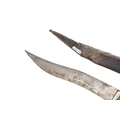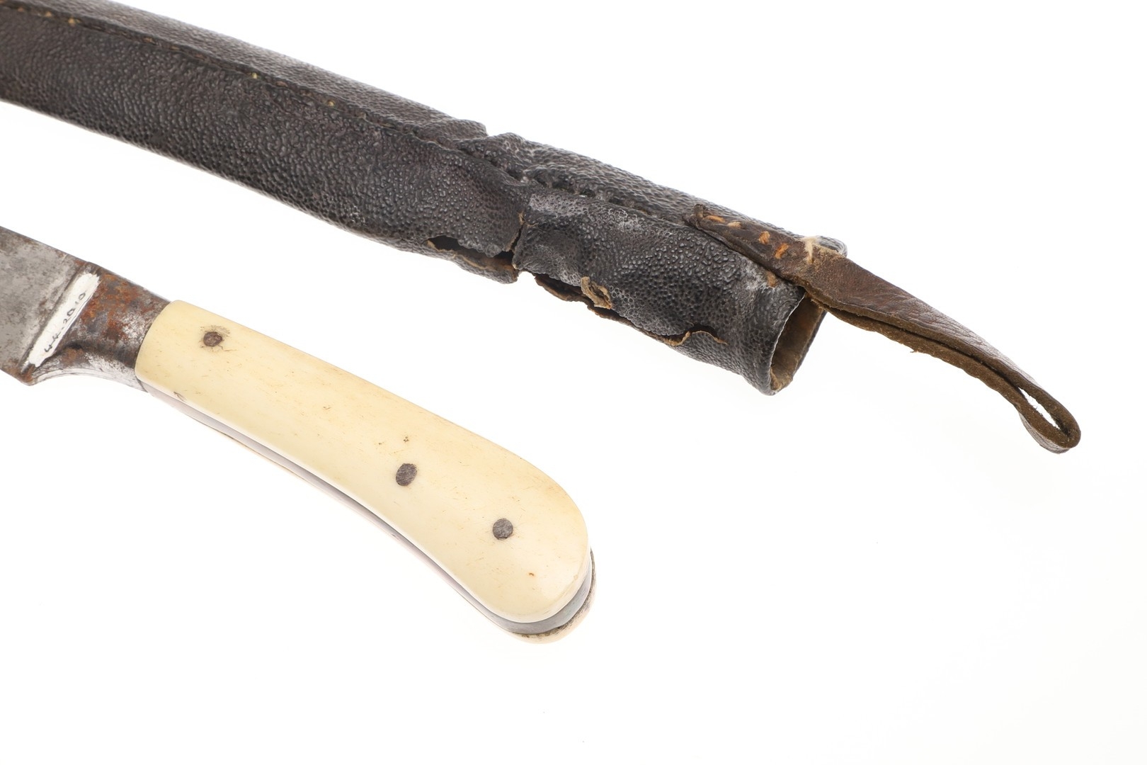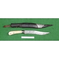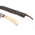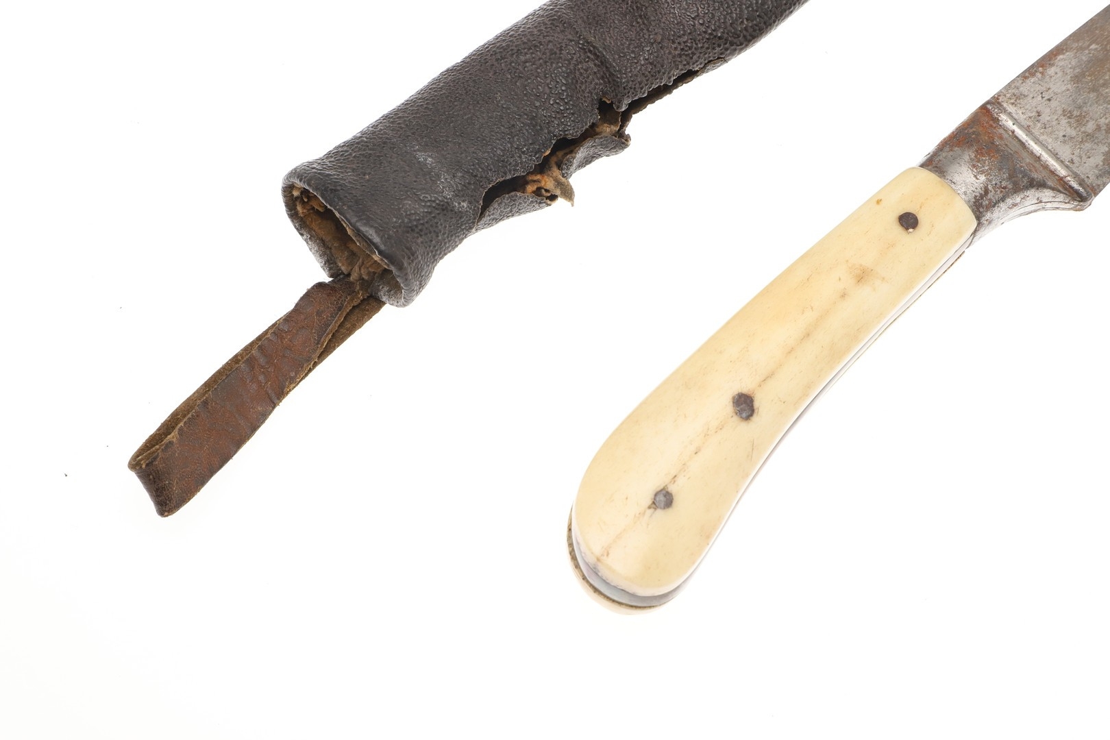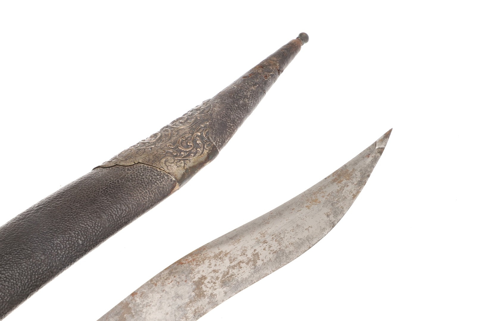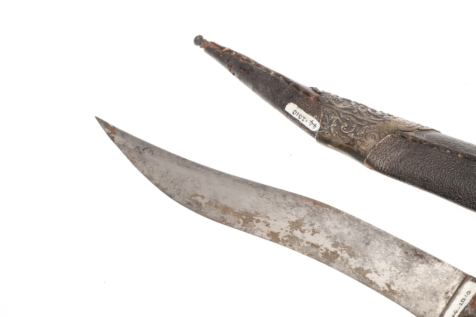 A PERSIAN ZIRAH BOUK ARMOUR PIERCING DAGGER. The dagger having a 20 cm curved blade with reinforced tip and sharpened point. Mounted on a bone mounted grip. In a black leather scabbard with decorative silver mount. 38 cm long.