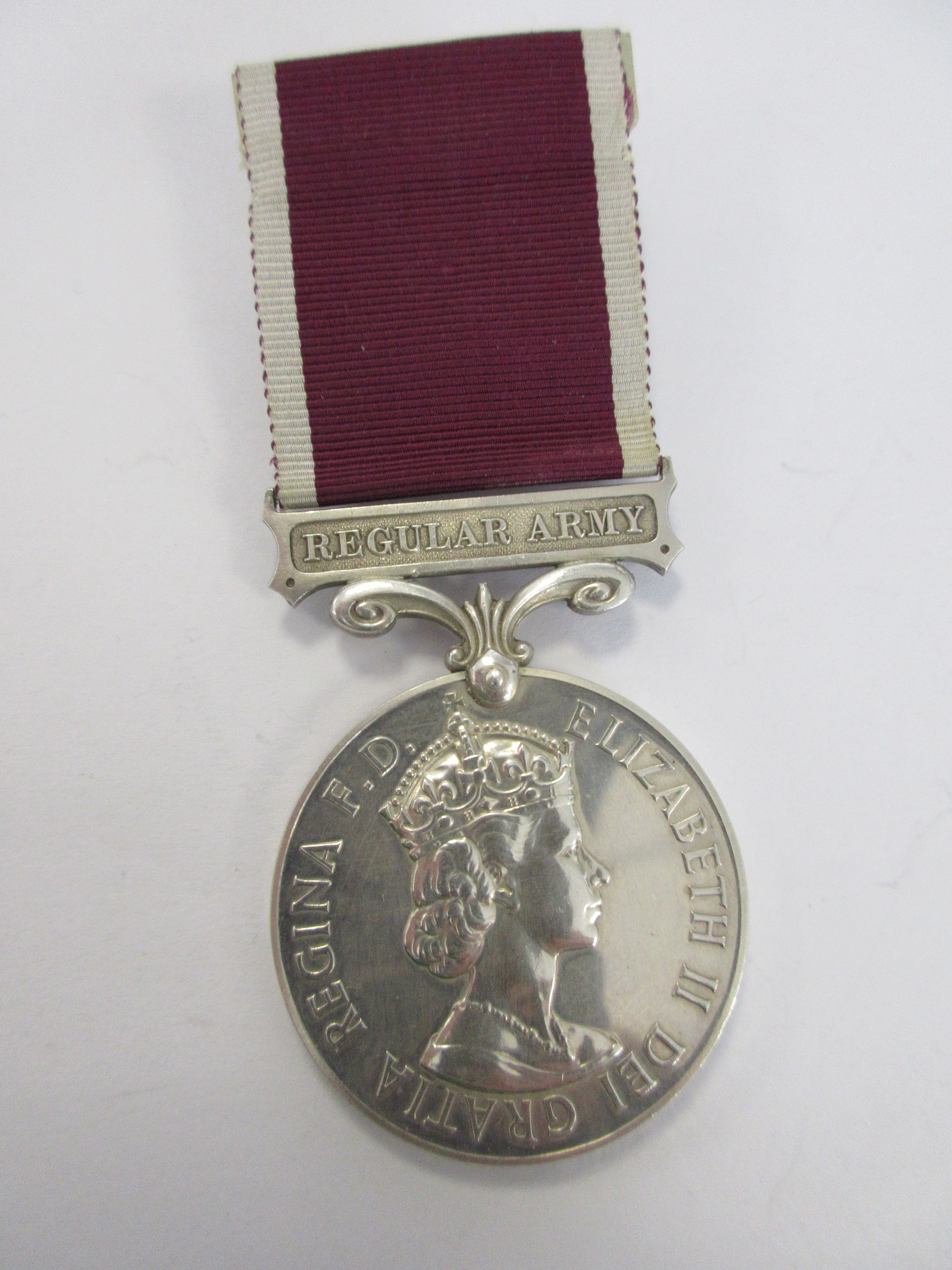 A Queen Elizabeth II Army Long Service & Good Conduct Medal with 'Regular Army' clasp named to 23534658 S.Sgt R D Keller REME, mounted for wear, with ribbon, in good order. (See Lots 1 & 2 for family medals)