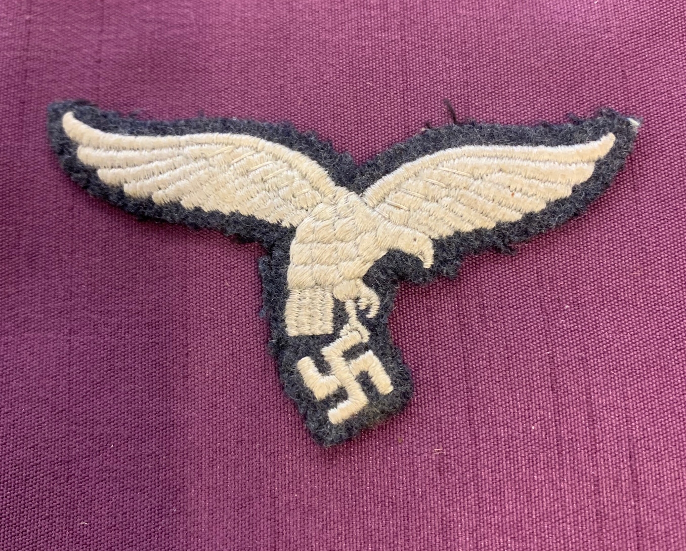 German WWII Luftwaffe Enlisted Ranks cap eagle. A very fine quality machine embroidered silver grey thread on Luftwaffe blue grey backing cloth eagle for the overseas cap or the M.43 cap.
