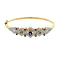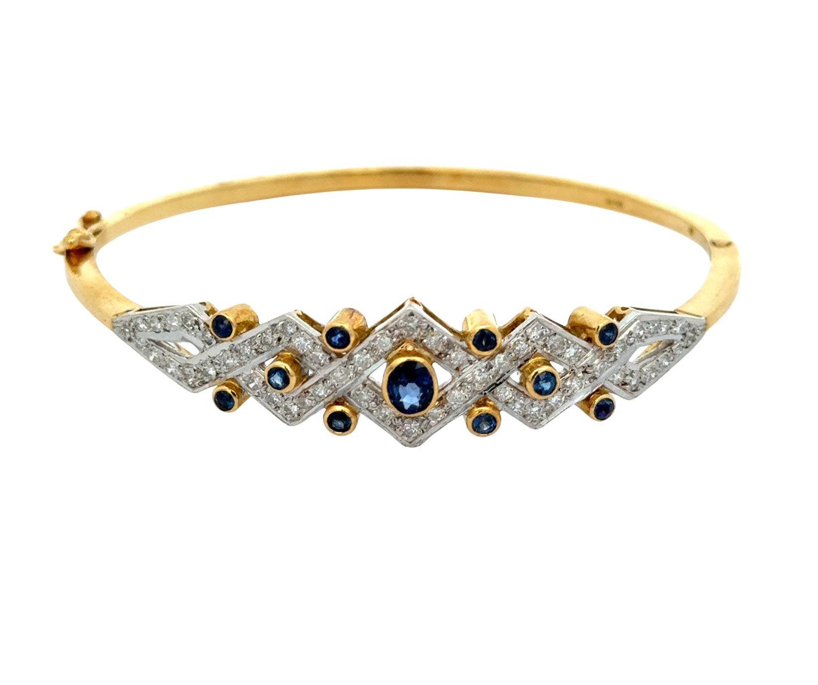18ct Sapphire & Diamond Bangle Set with .90ct of natural blue sapphires, and .87ct of natural diamonds. Set in 18ct yellow gold. Weighing 16.41g. Excellent condition.