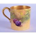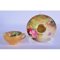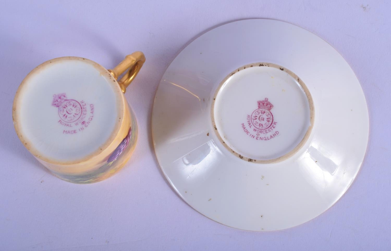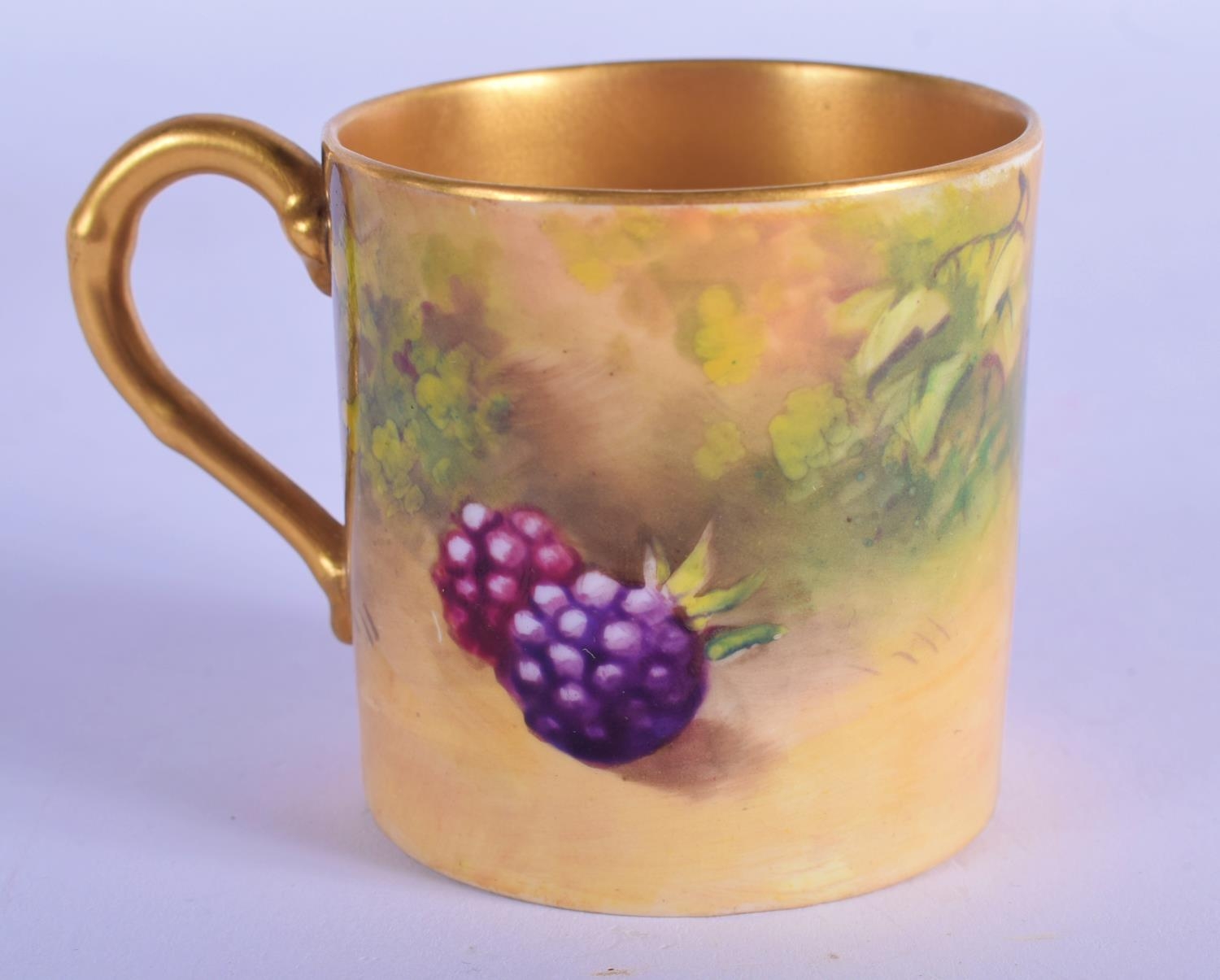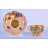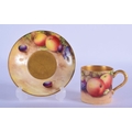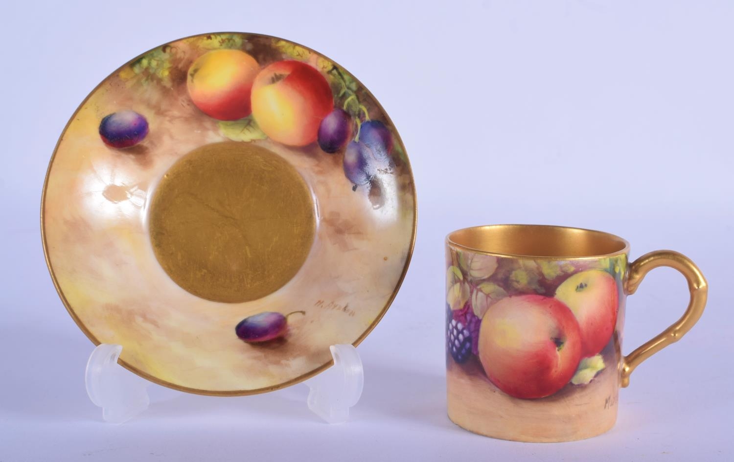 Royal Worcester coffee can and saucer painted with fruit by Ayrton and Moseley, signed, date code 1932. Cup 5.5cm High, Saucer 11cm Diameter (2)