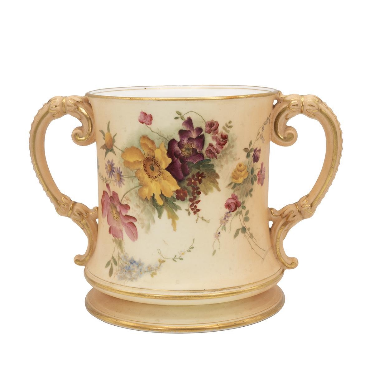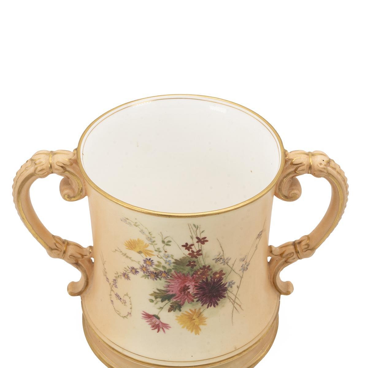 Royal Worcester loving cup, hand painted in the manner of Edward Raby - wild flowers and parcel gilt on a blush ivory ground. Good Royal Worcester mark for 1908 to base. H 15.2cm, diameter 13.5cm.