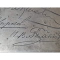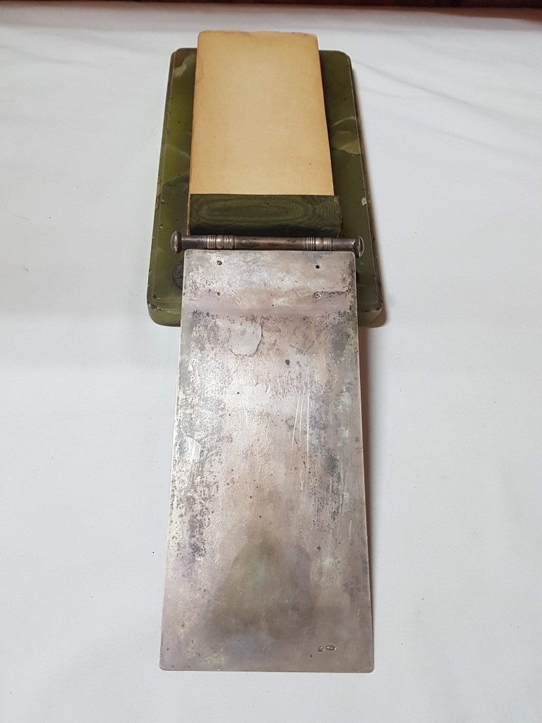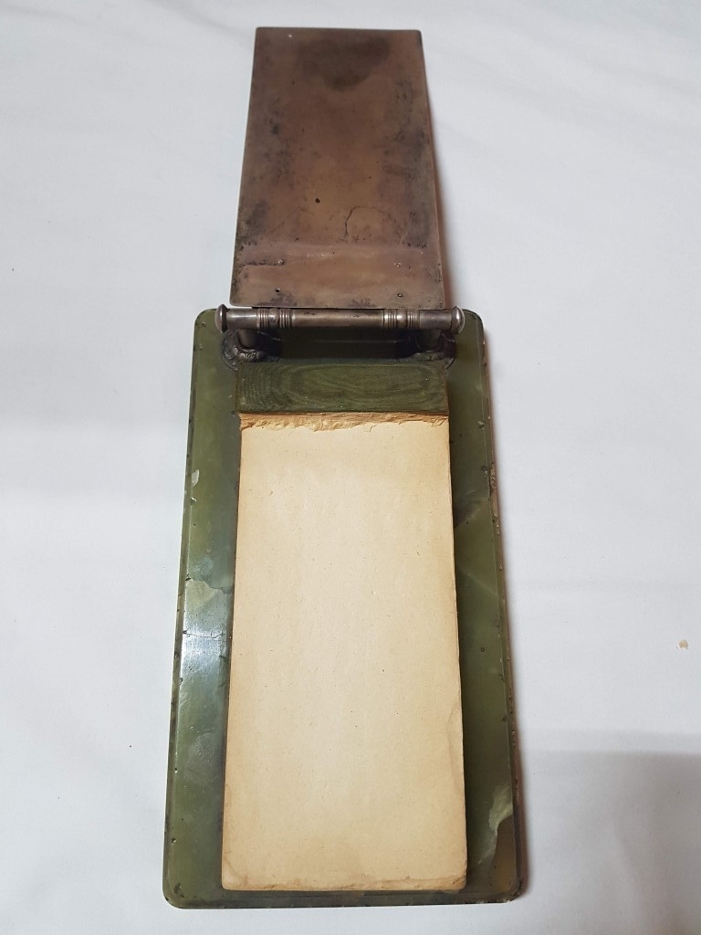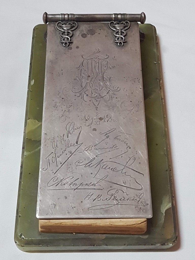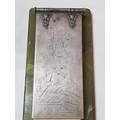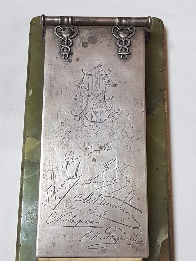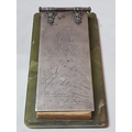 Antique Russian Silver (Circa 1920) Writing Pad Holder with Several Engraved Signatures and a Monogram on Green Onyx Base (Approx. 24cm x 13cm)/Antique Onyx Desk Notebook.