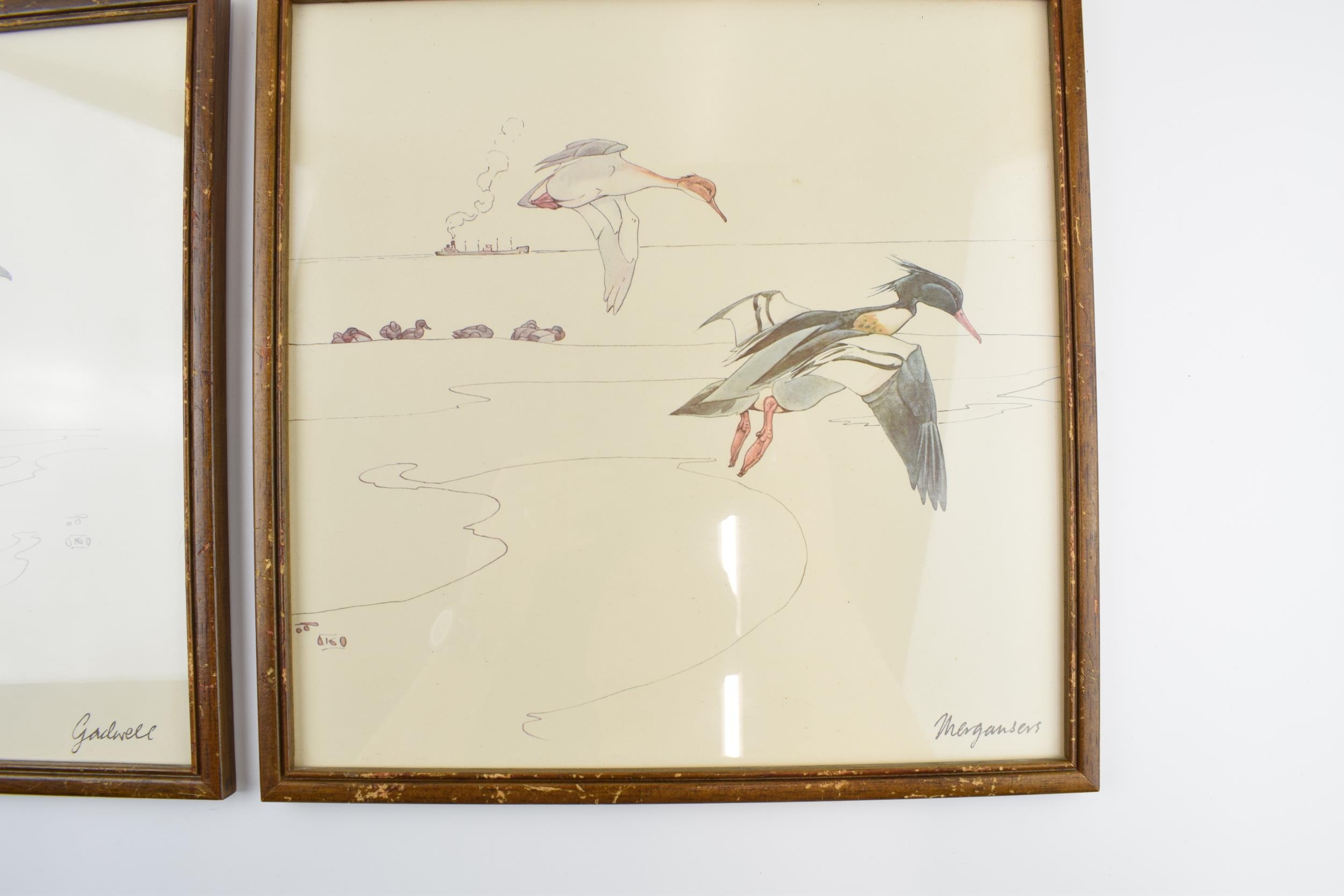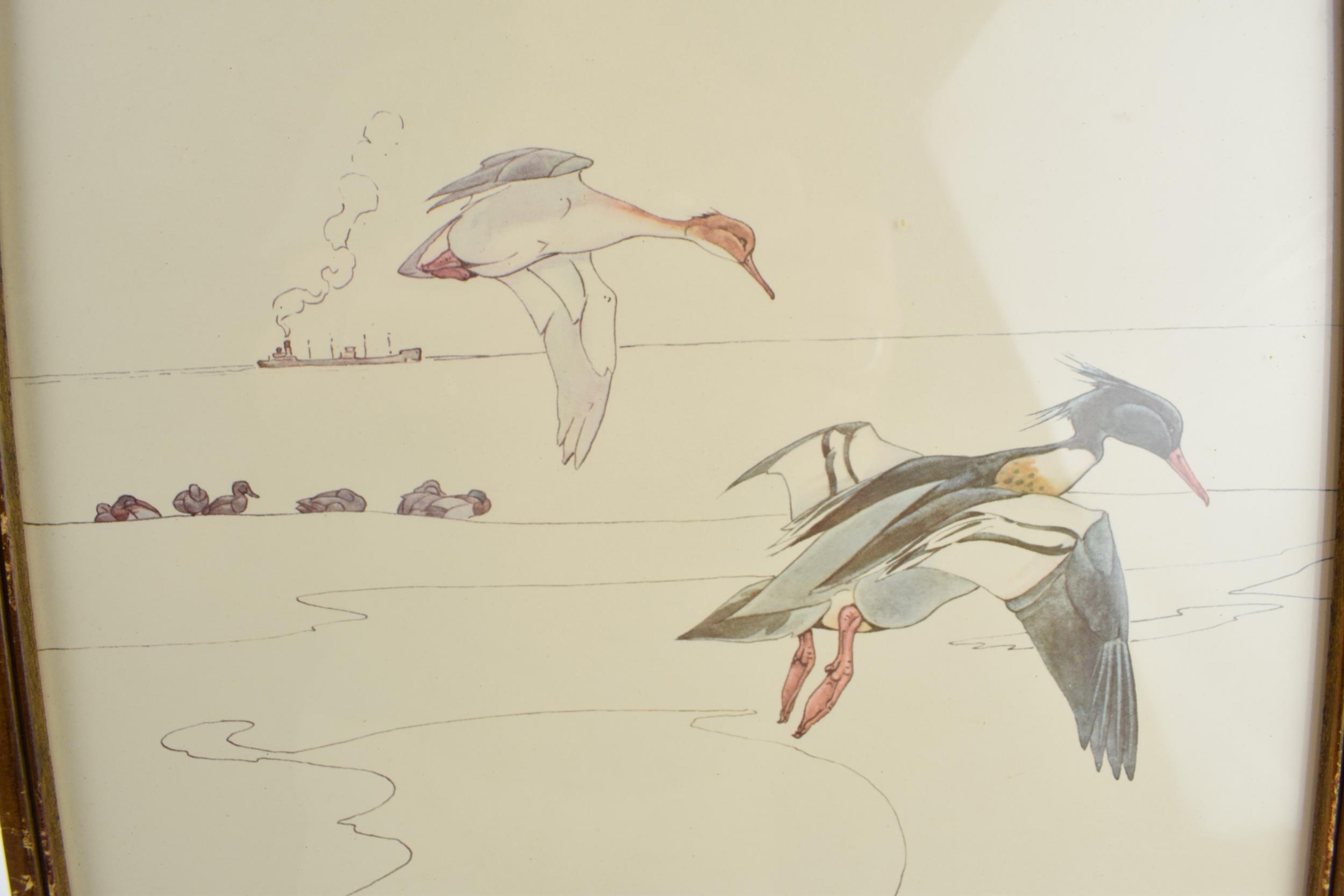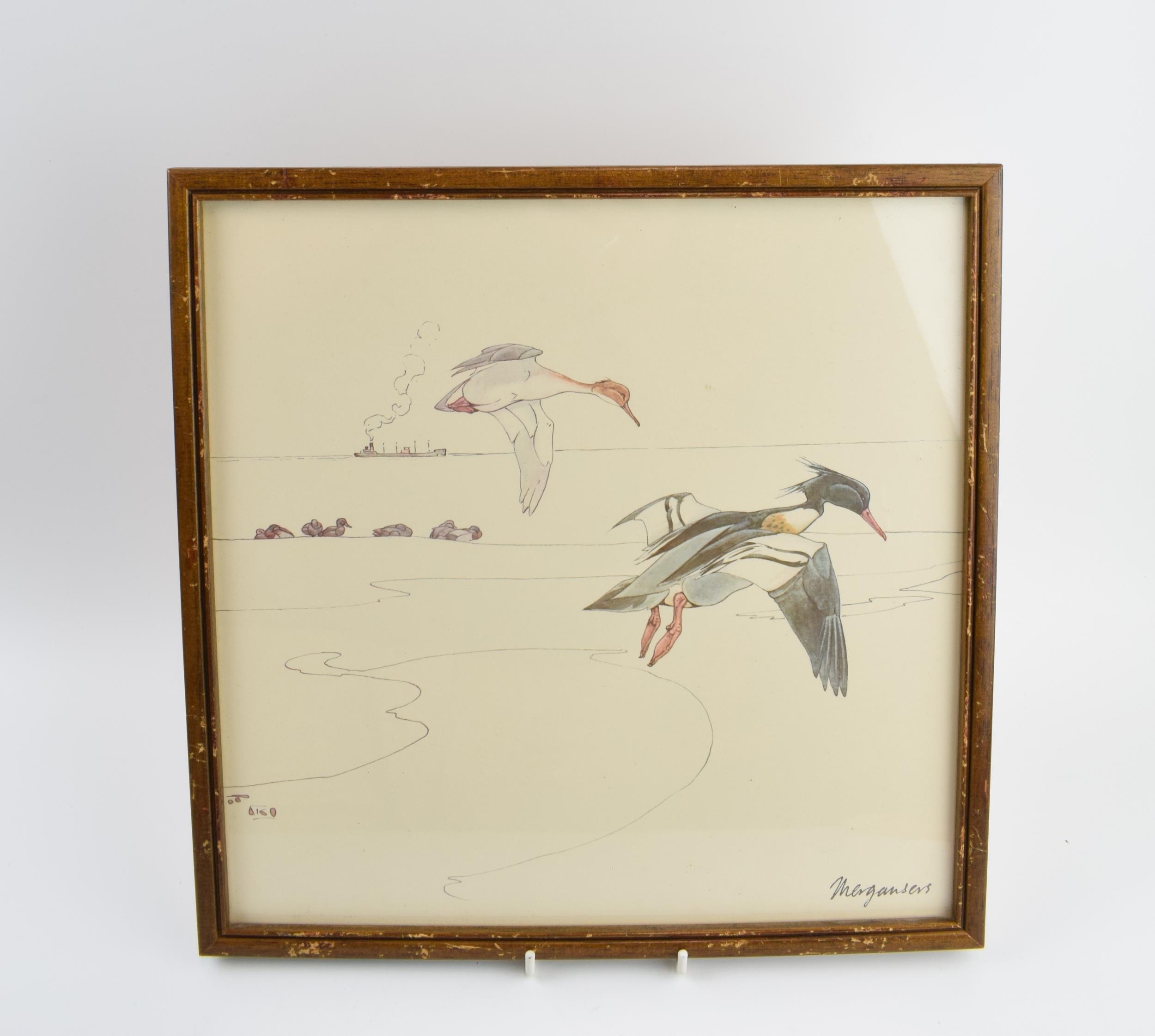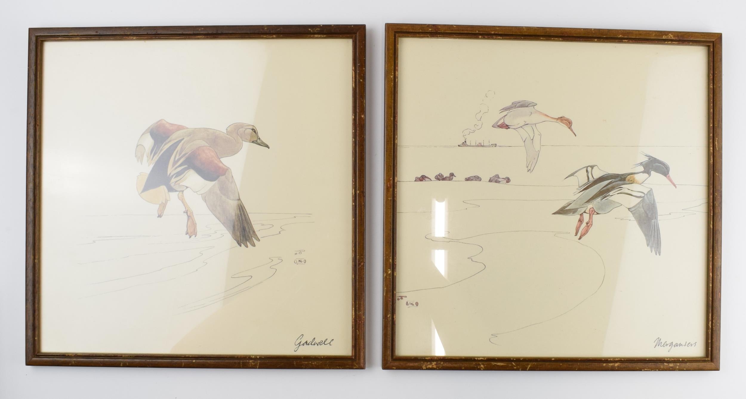 Pair of early 20th century prints of Mergansers ducks and a Gadwell duck. 31cm x 31cm including frame.