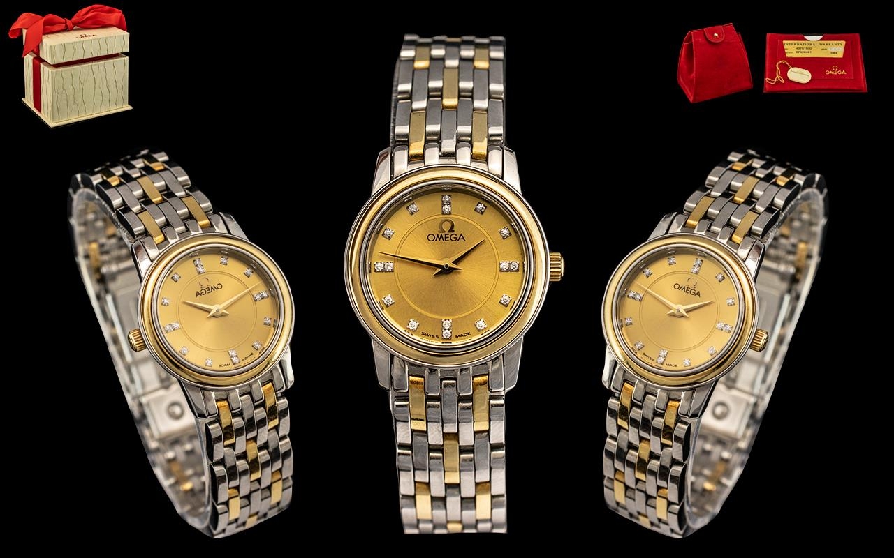 Omega - Ladies 18ct Gold and Steel Diamond Set Wrist Watch. Features a Champagne Dial, Set with Diamond Markers + A 18ct Gold Bezel and Spacers, The Watch Bracelet of 18ct Gold and Steel. Watch No 57826461. In as New Condition / Working at time of Cataloging. Comes with Omega Warranty Card, Leather Wallet, Omega Tag. Display Box and Outer Box. Receipt Dated 8-7-02, Booklets and Instruction Booklet. Cost £3250.00 In 2002.