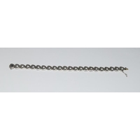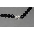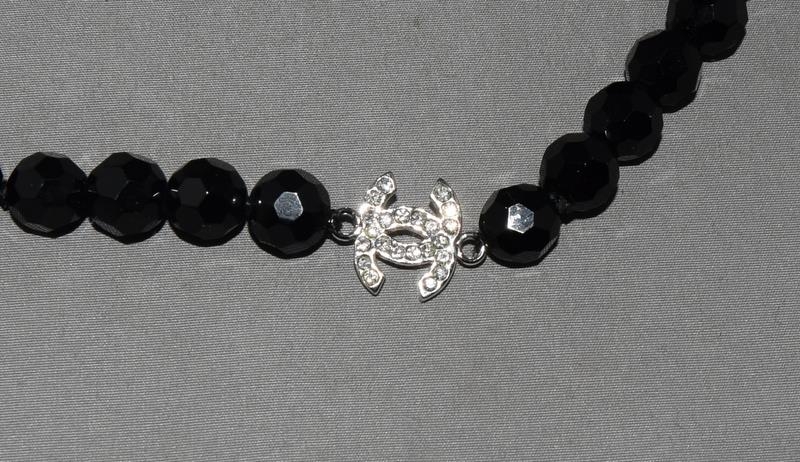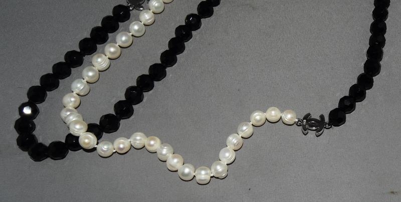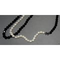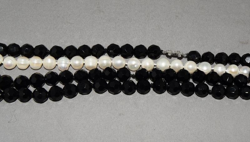 Designer long cultured pearl/onyx silver logo necklace.