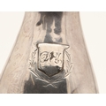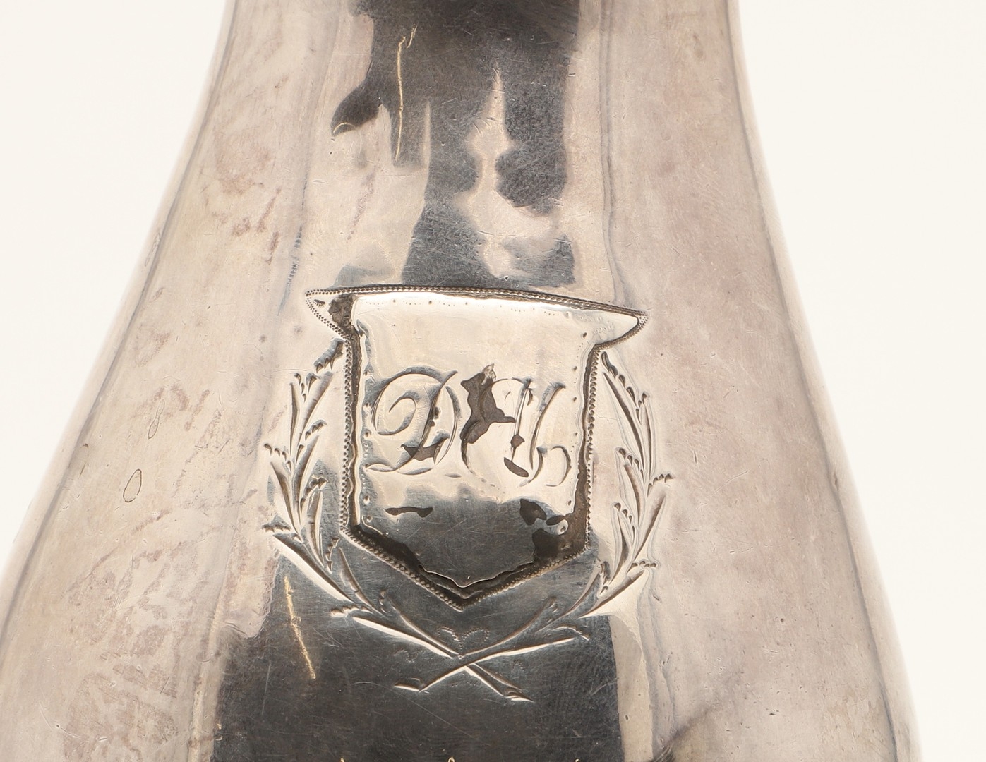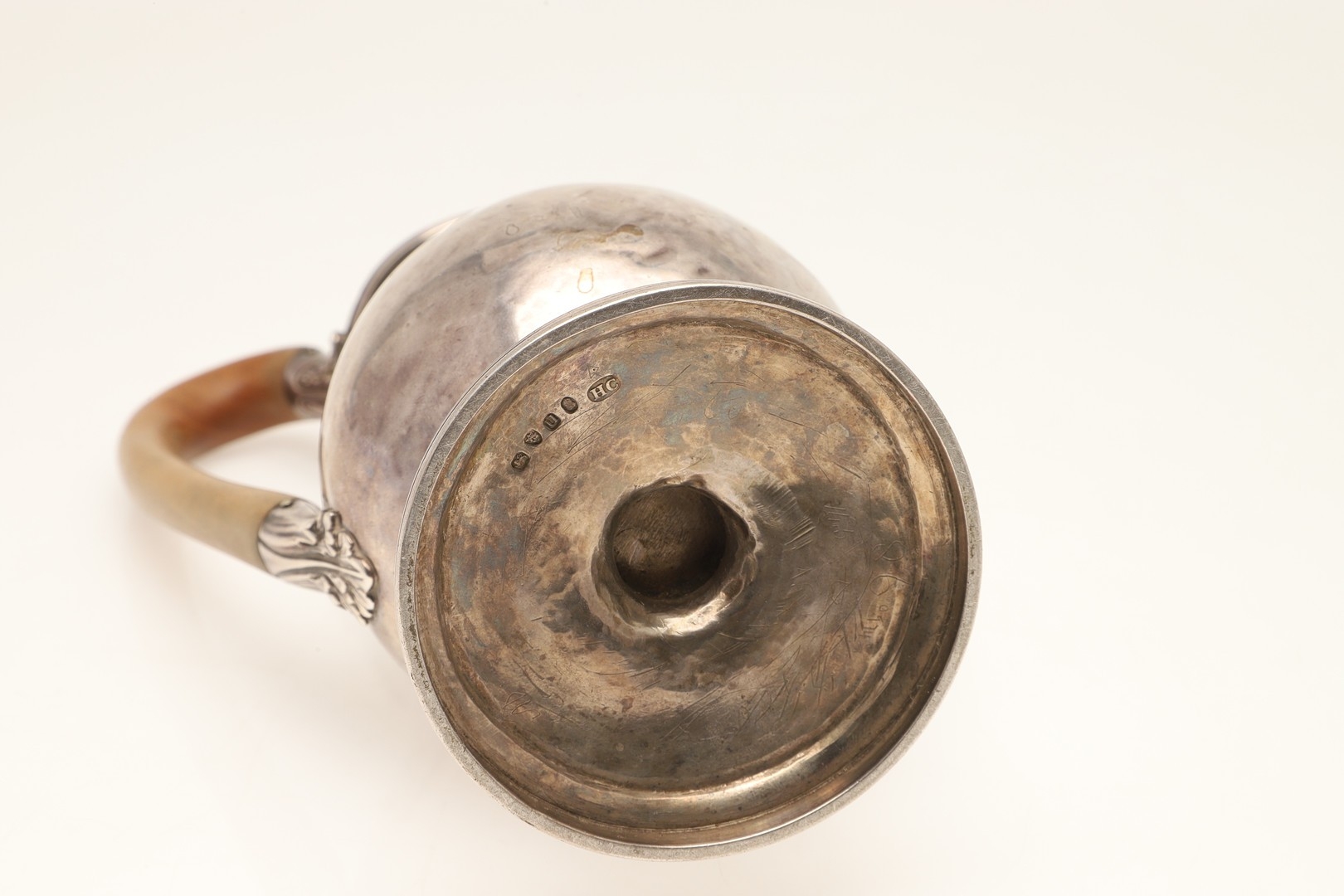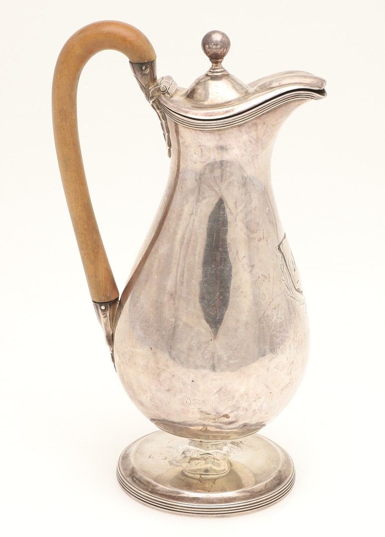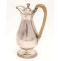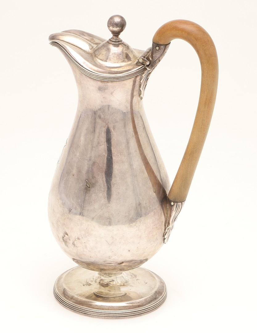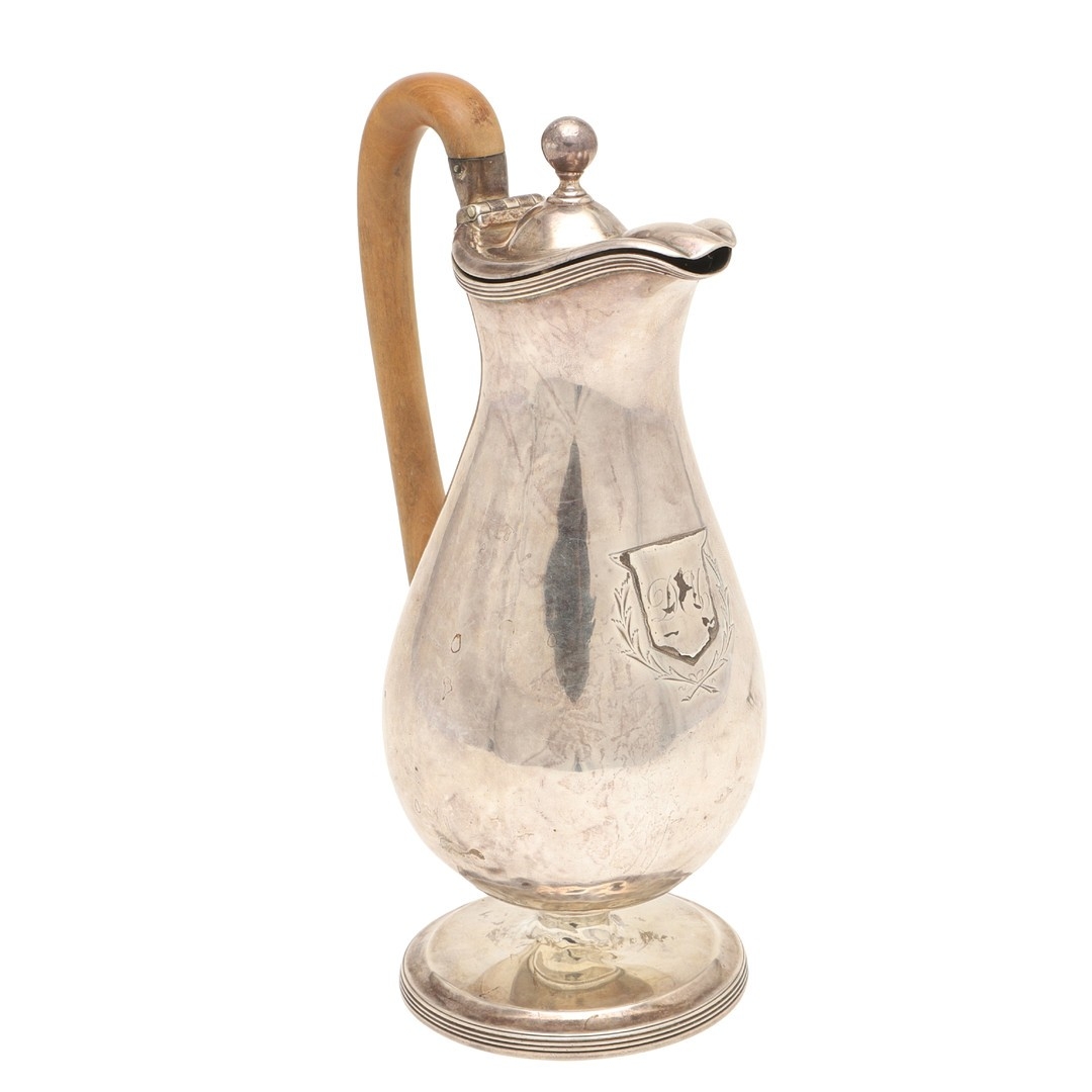 A GEORGE III SILVER HOT WATER JUG. The lid with ball finial, the wooden handle with foliate decorated end mounts and stood on a round pedestal foot. The front with engraved initials. Hallmarked Henry Chawner, London, 1795. Total weight 14.8ozt.
