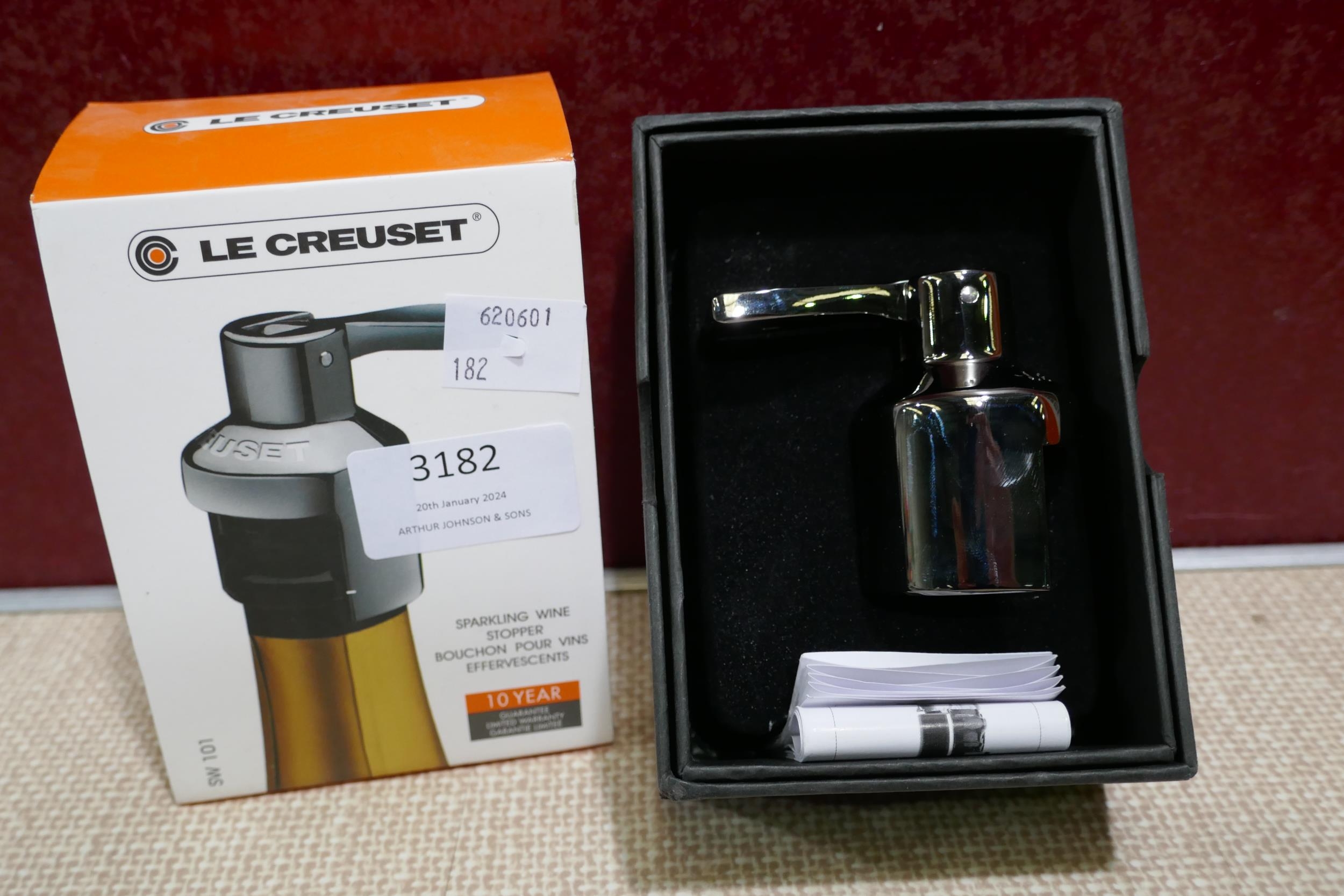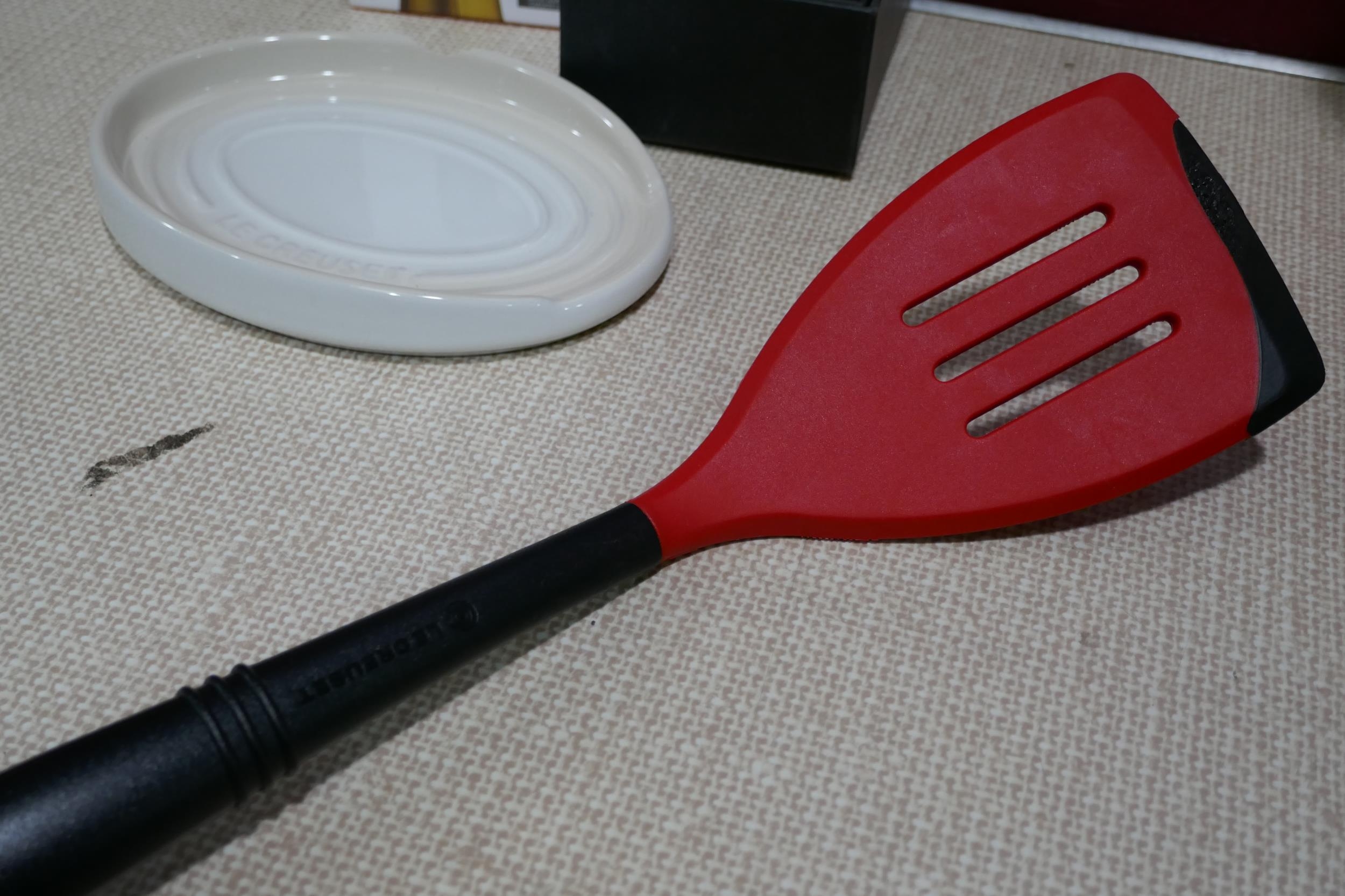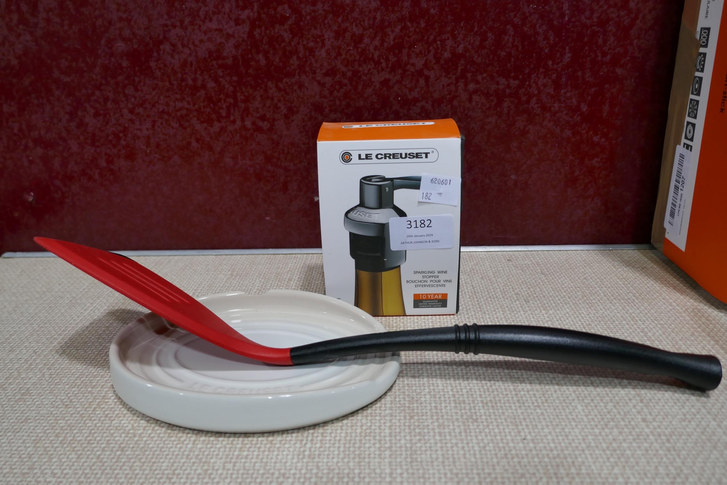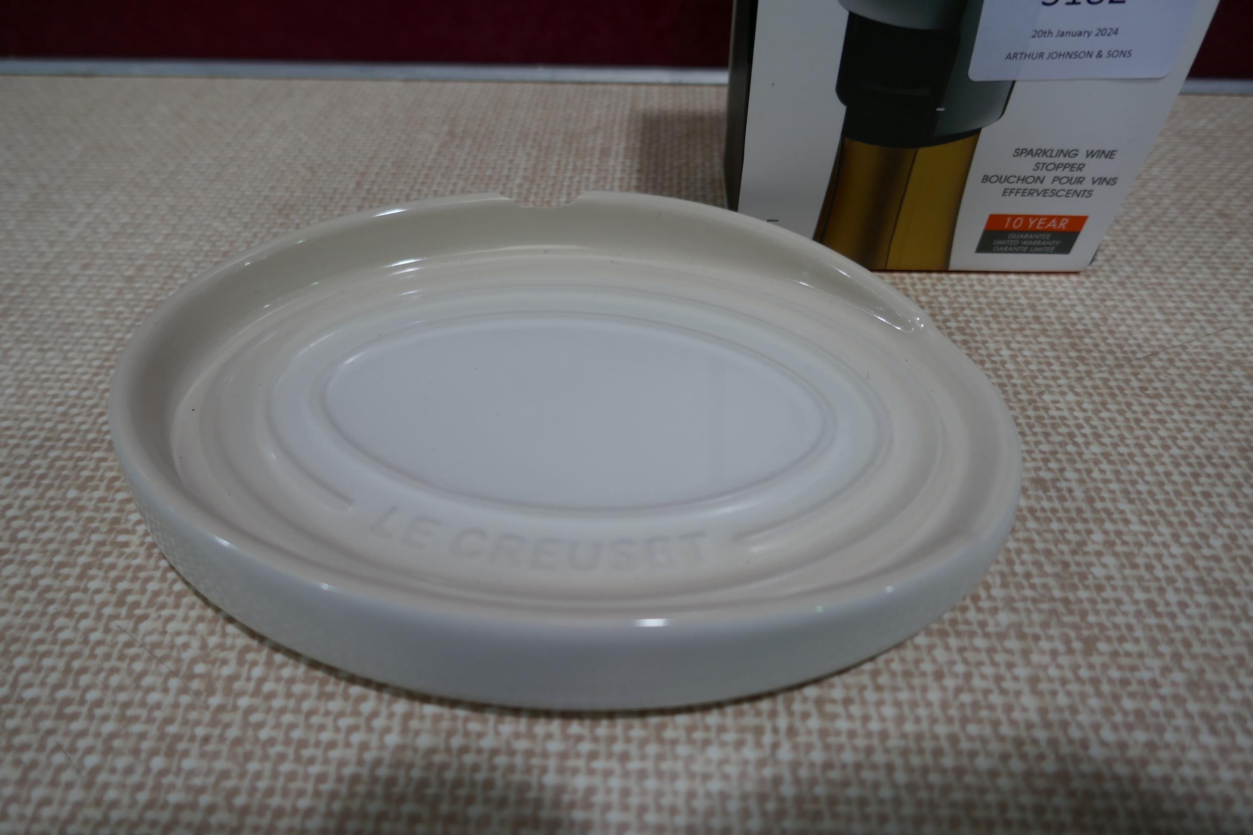 Le Creuset Sparkling wine stopper, spatula and oval spoon rest- colour - meringue - chipped * This lot is subject to vat