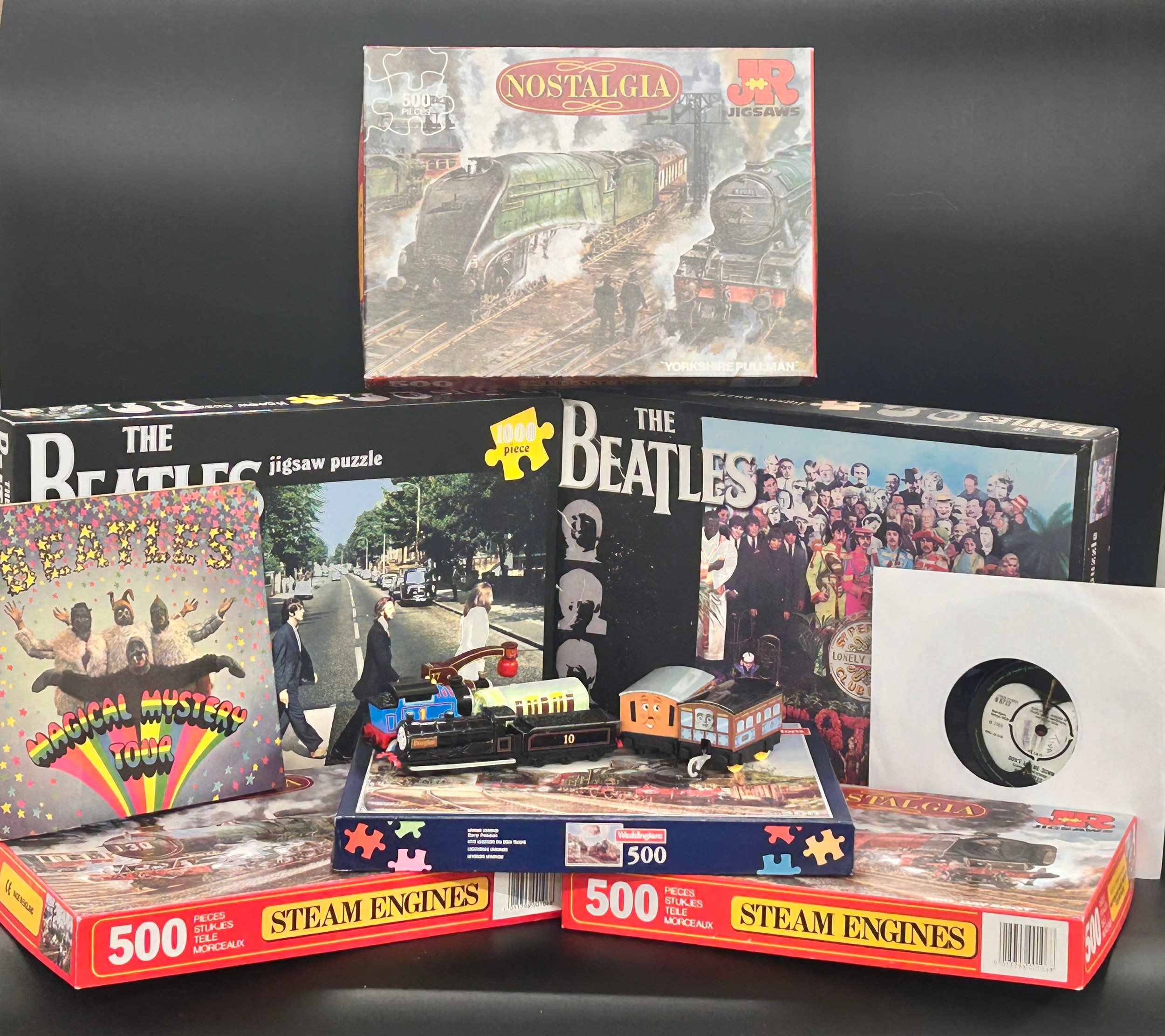 Two The Beatles jigsaw puzzles, a Magical Mystery Tour record, other jigsaws and some toy vehicles