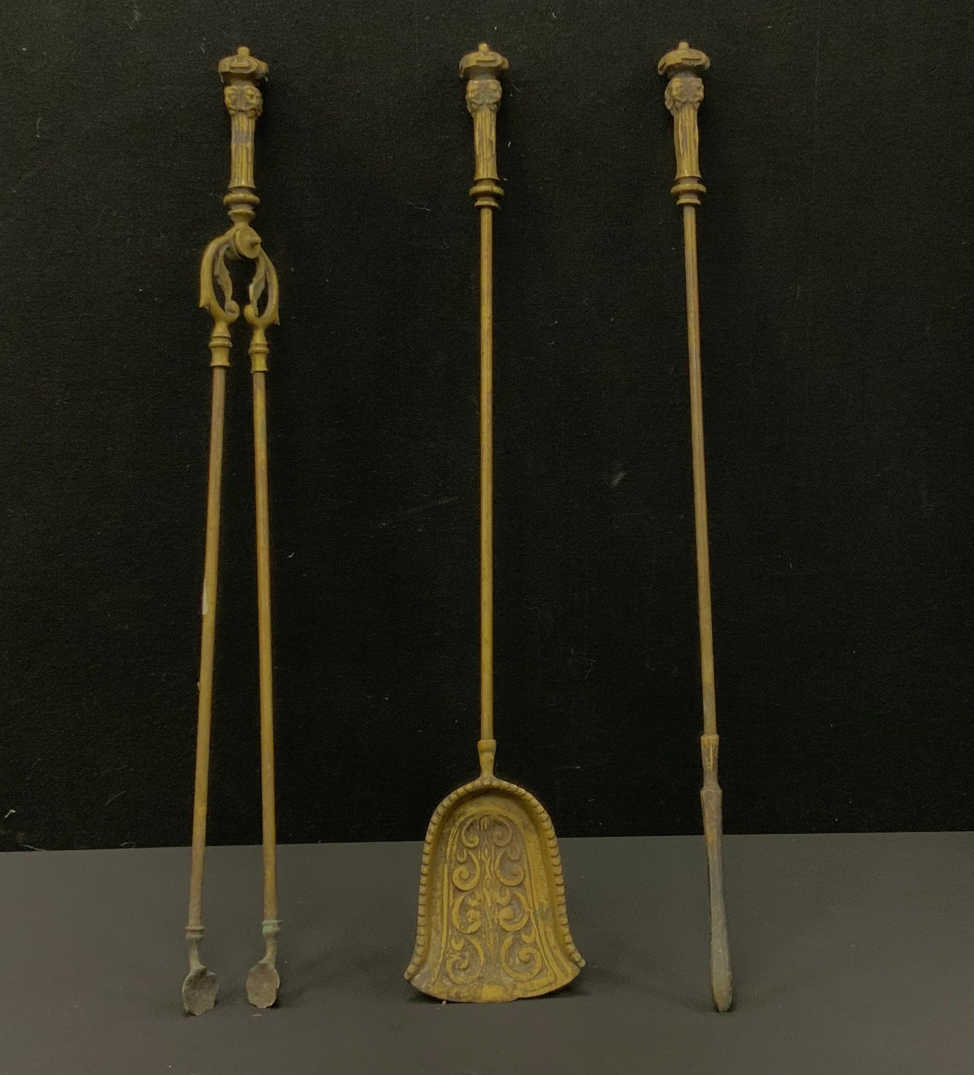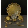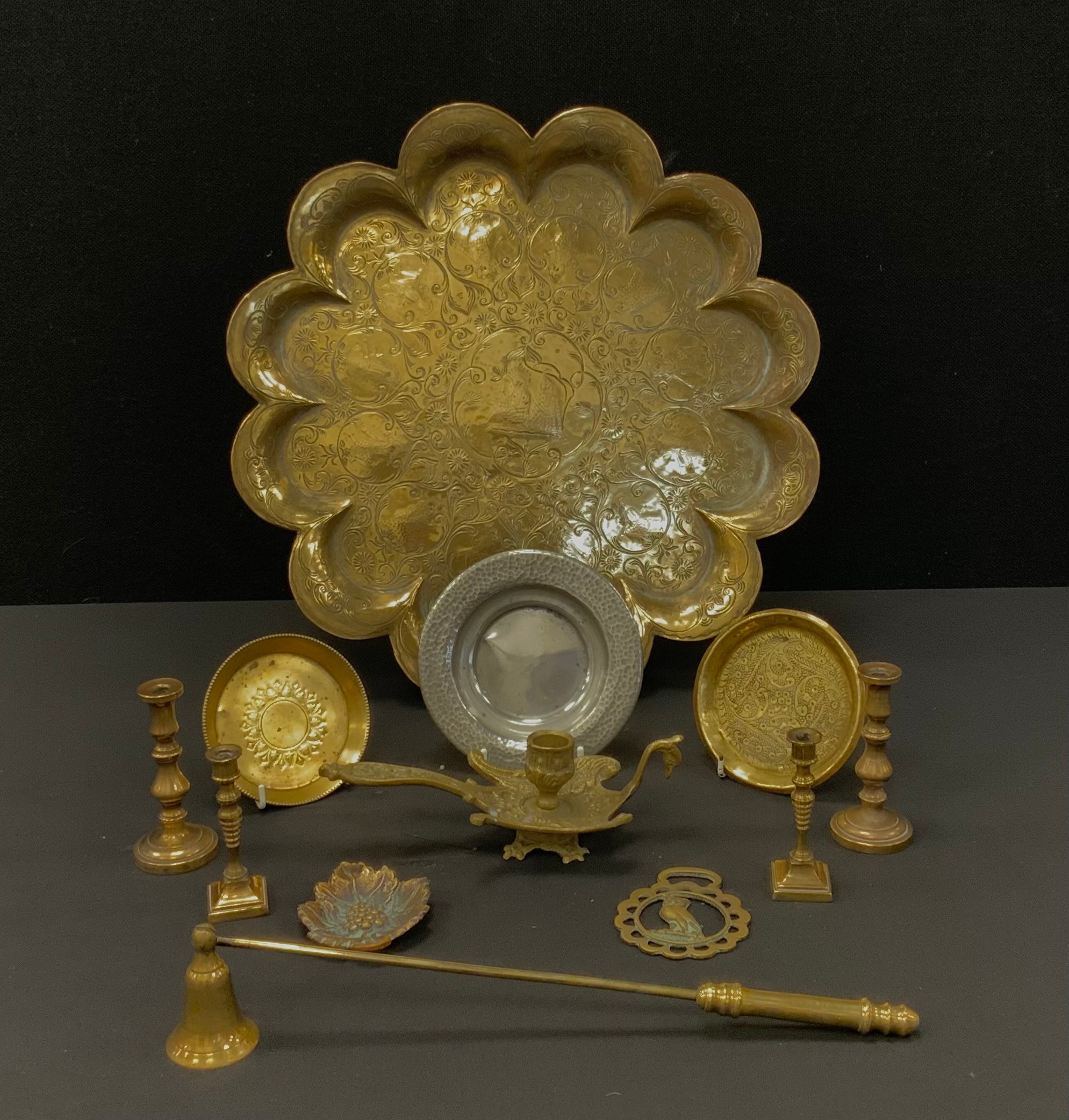 An Indian Brass tray, embossed and incised with Buddhist figures and foliate, shaped rim; two pairs of miniature candlesticks; etc