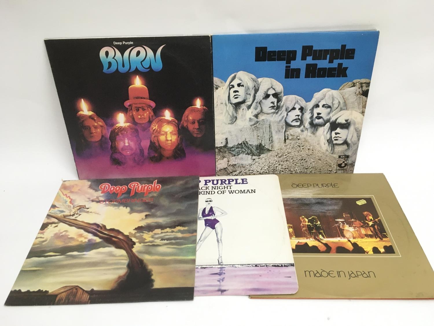 Four Deep Purple LPs comprising 'Stormbringer', 'Made In Japan', 'Burn' and 'In Rock' plus a Deep Purple 12 inch single (5).