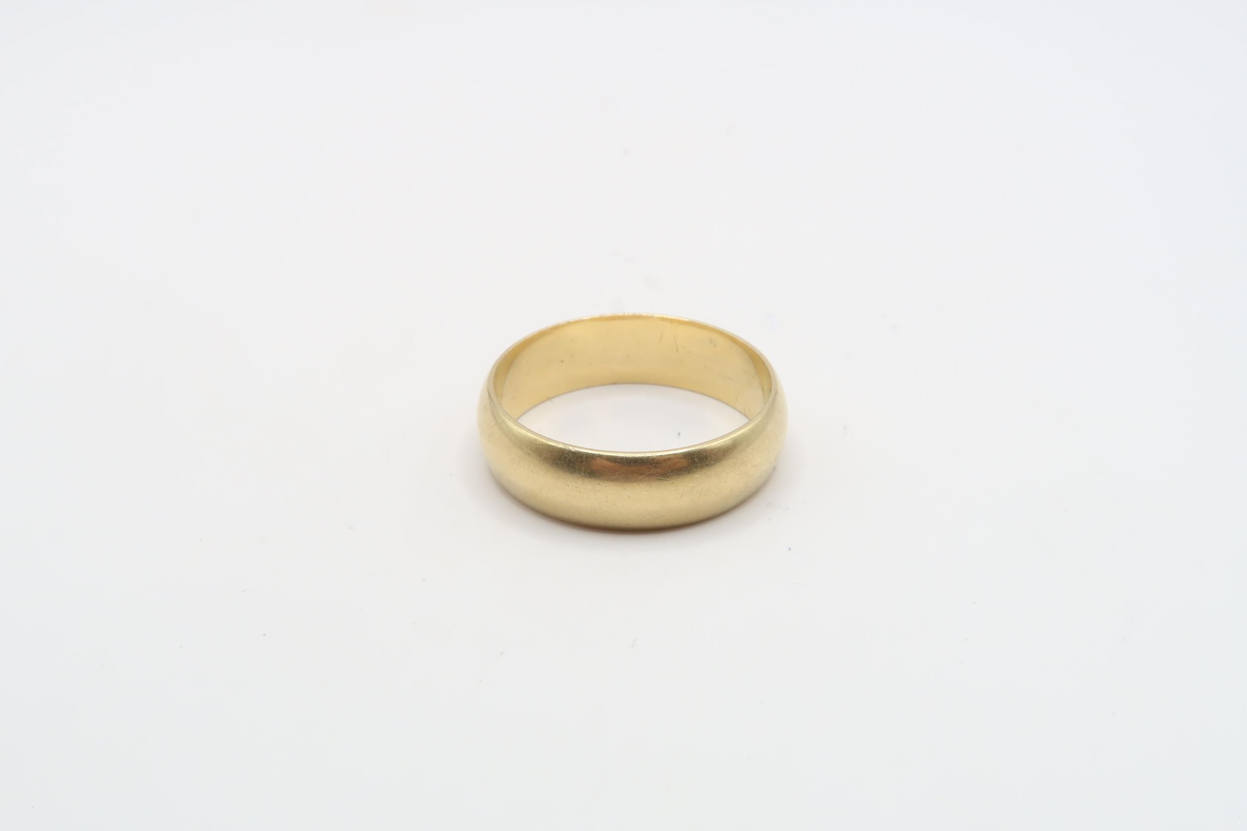 A 6.5mm band ring. Size W. Weight 8.54 grams. Tests gold 18ct