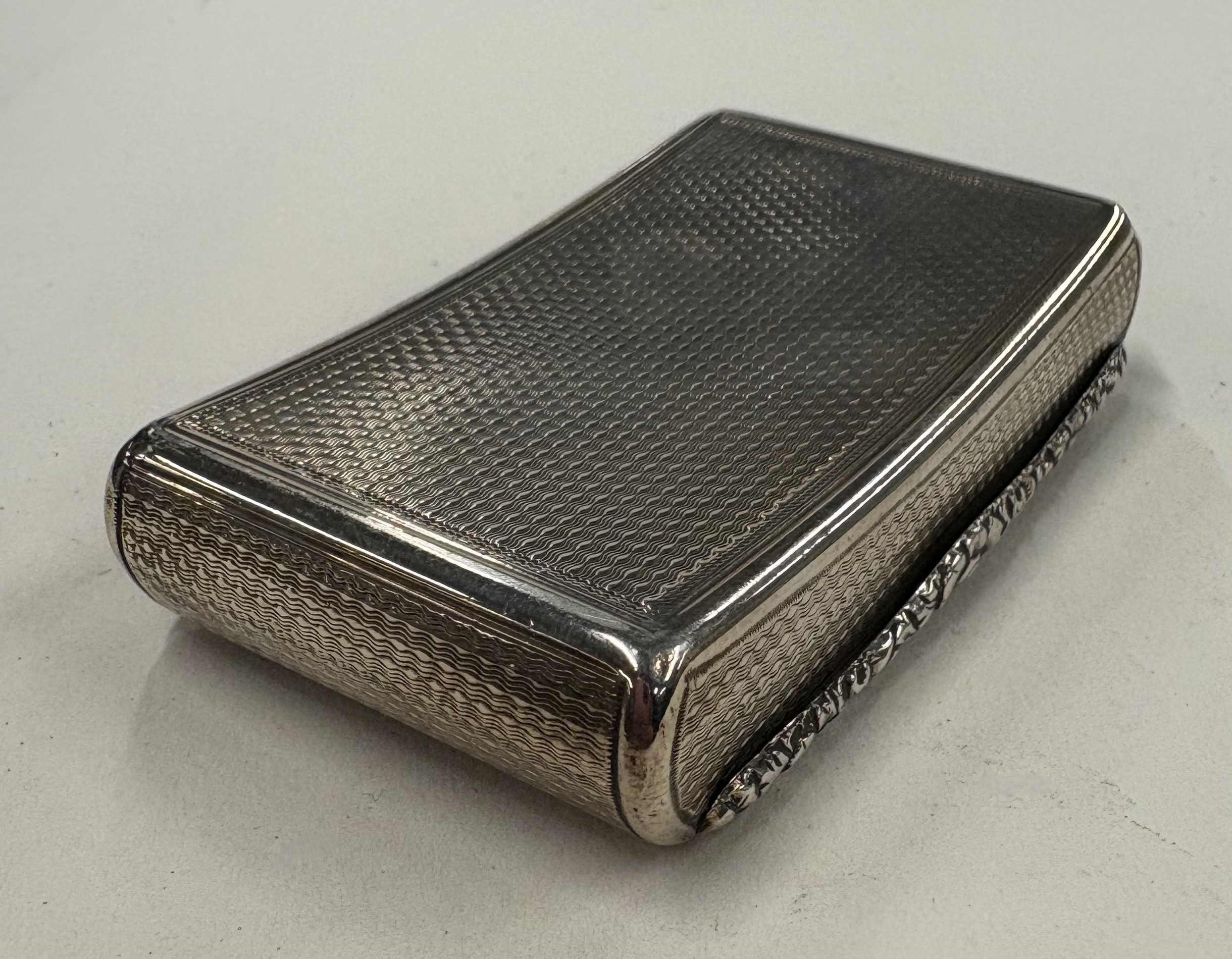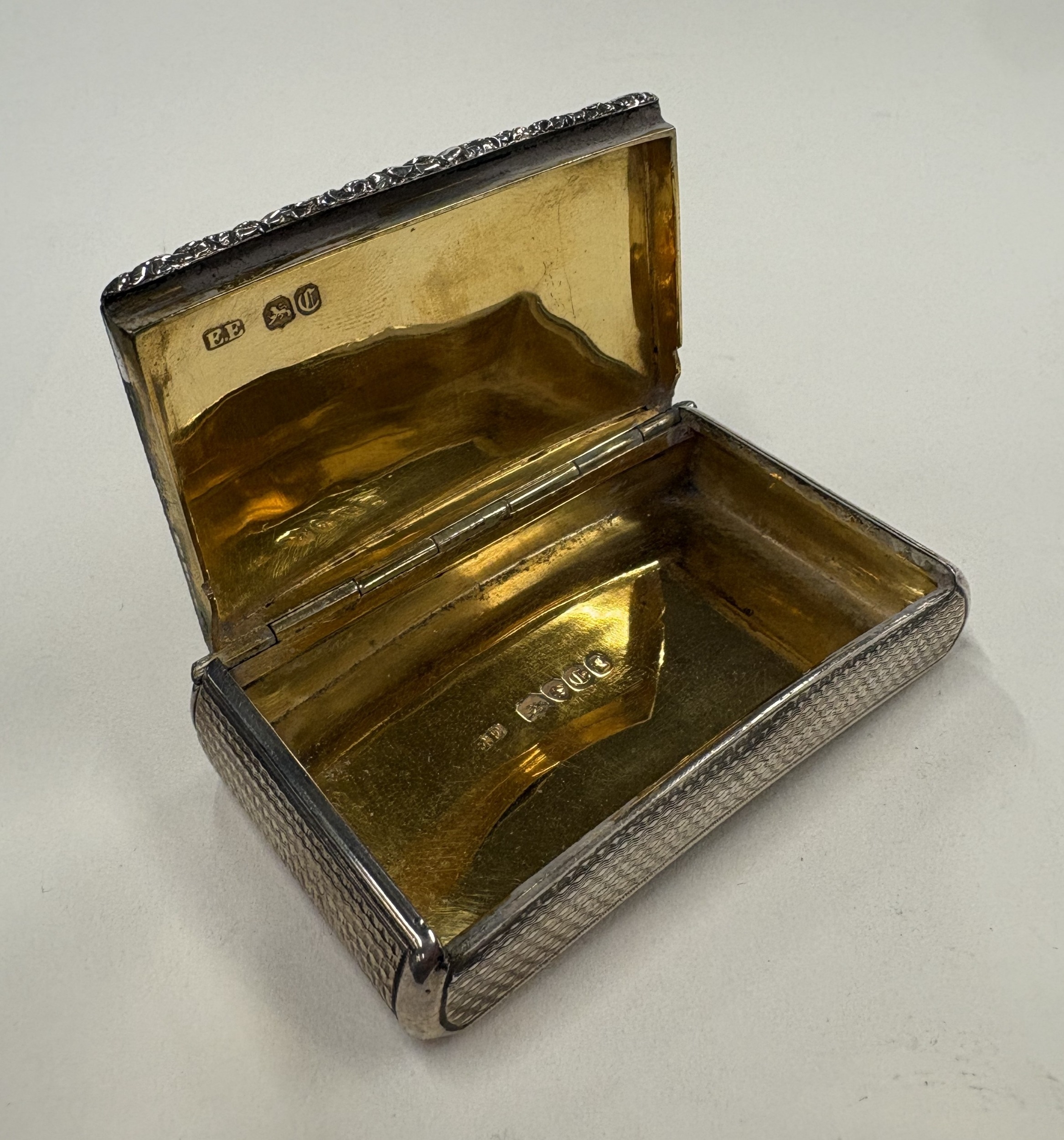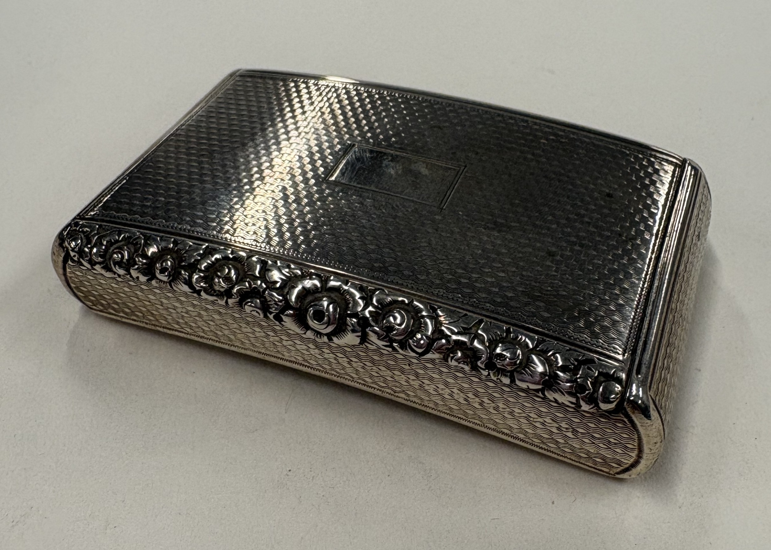 An engine-turned Victorian silver snuff box with chased floral decoration to hinged cover and gilt interior. London 1838. By Edward Edwards II. Approx. 84 grams. Est. £100 - £120.