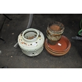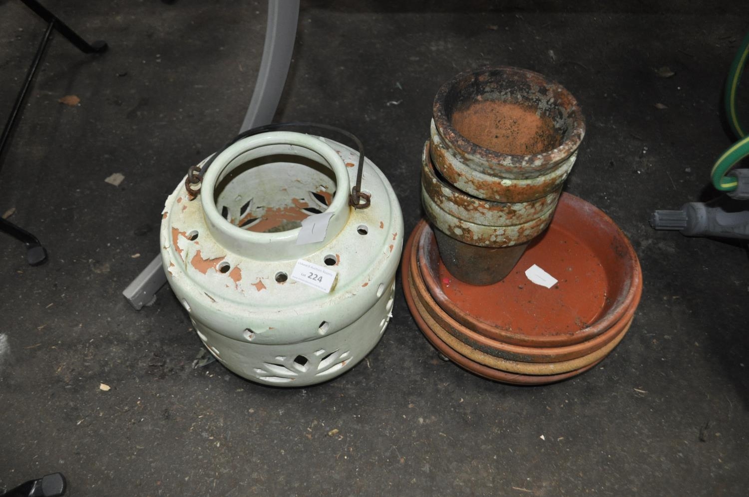 TERRACOTTA LANTERN, POTS AND PLANT POT TRAYS