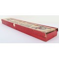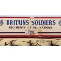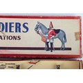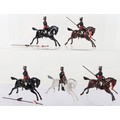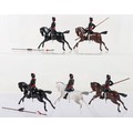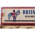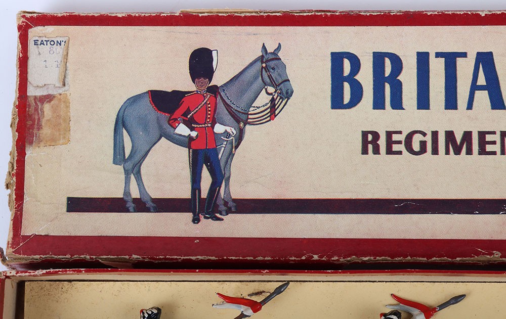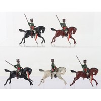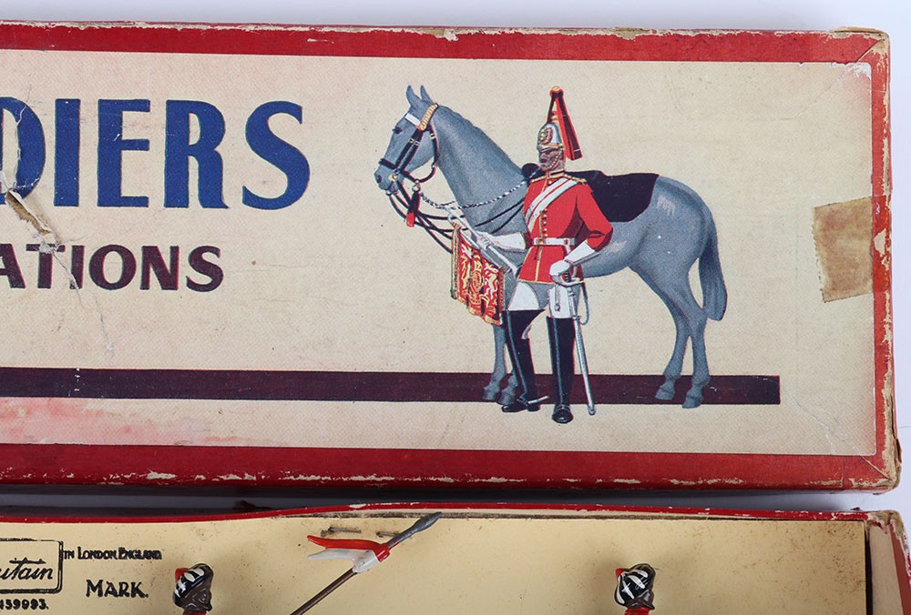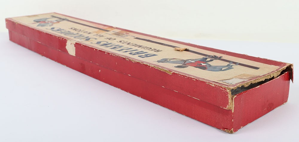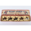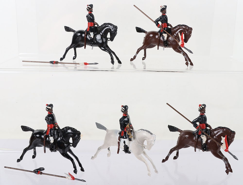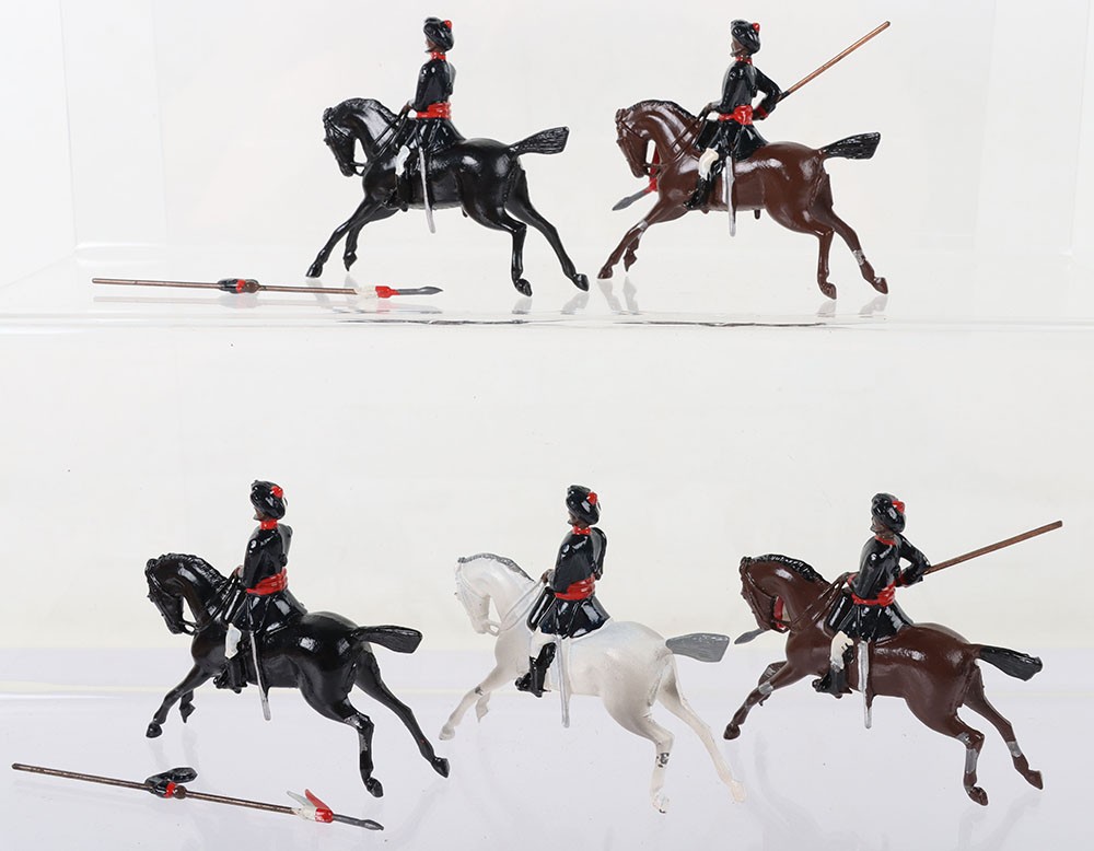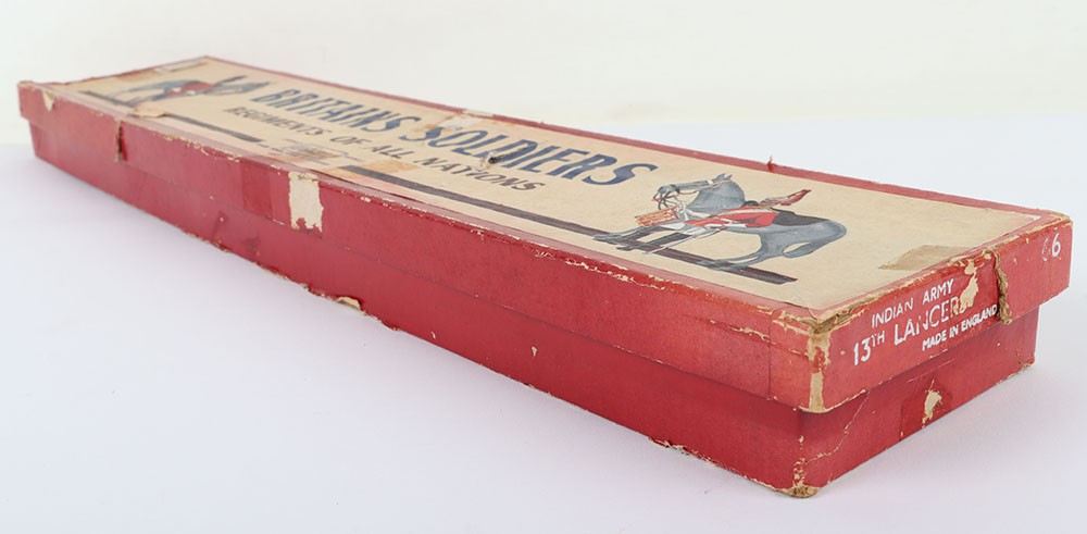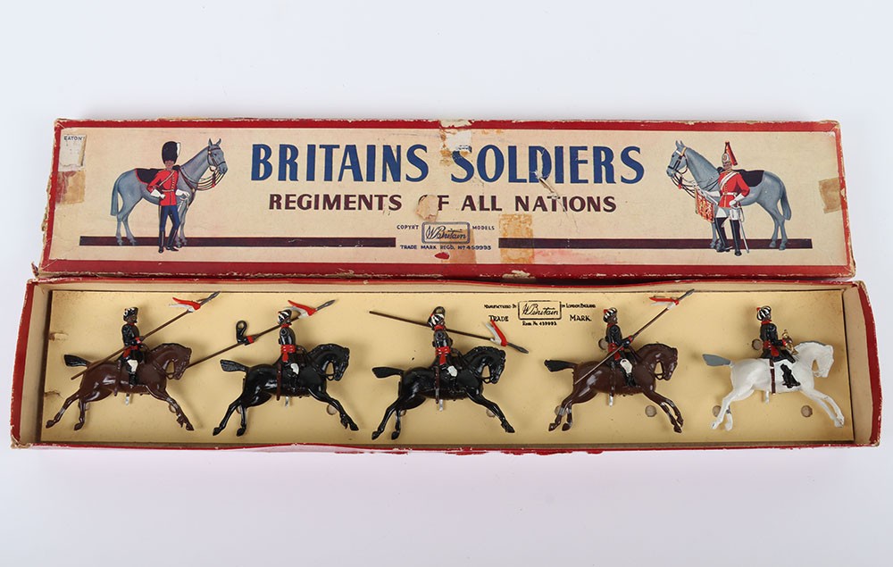 Britains boxed set 66, 13th Duke of Connaught’s Own Lancers, 1950s, dark blue tunics, four mounted troopers and trumpeter on grey, (condition: good, few chips and two arms loose) in ROAN box with backing card, (condition: fair tape marks and surface loss to lid, lacks one end flap).