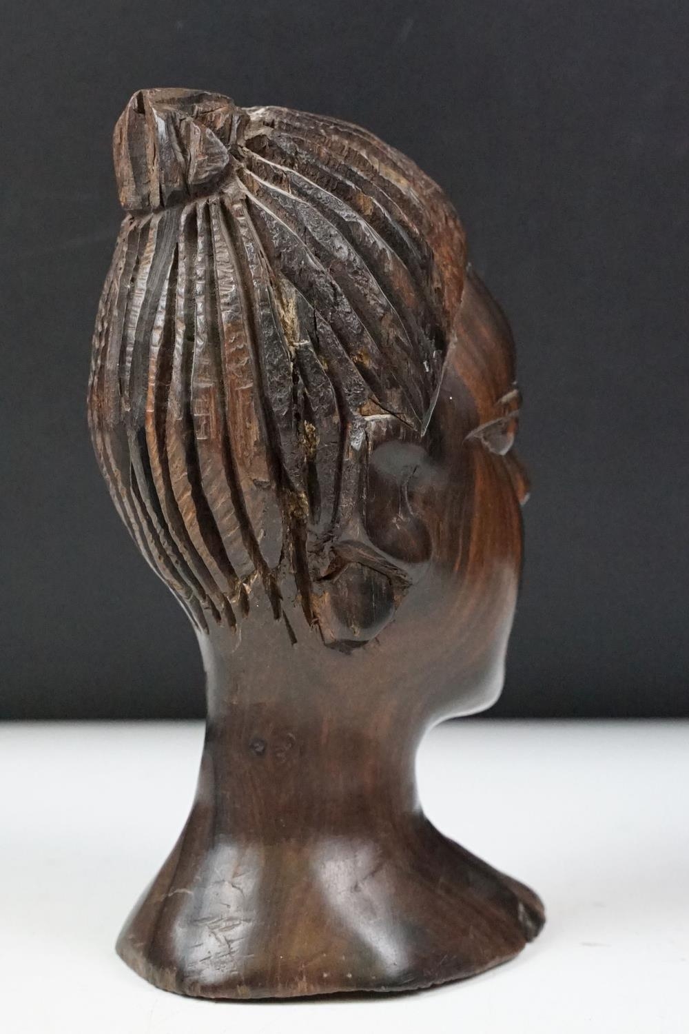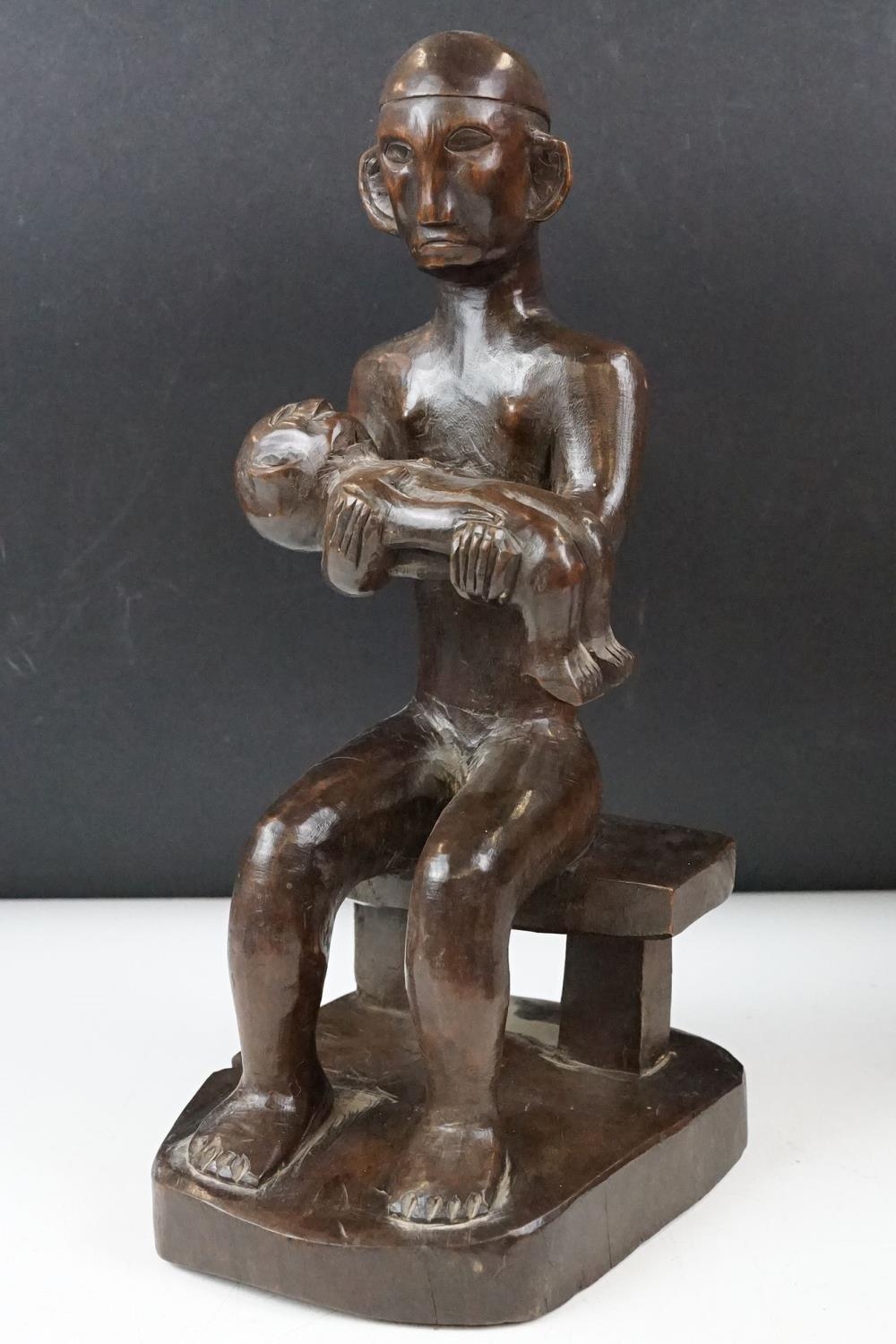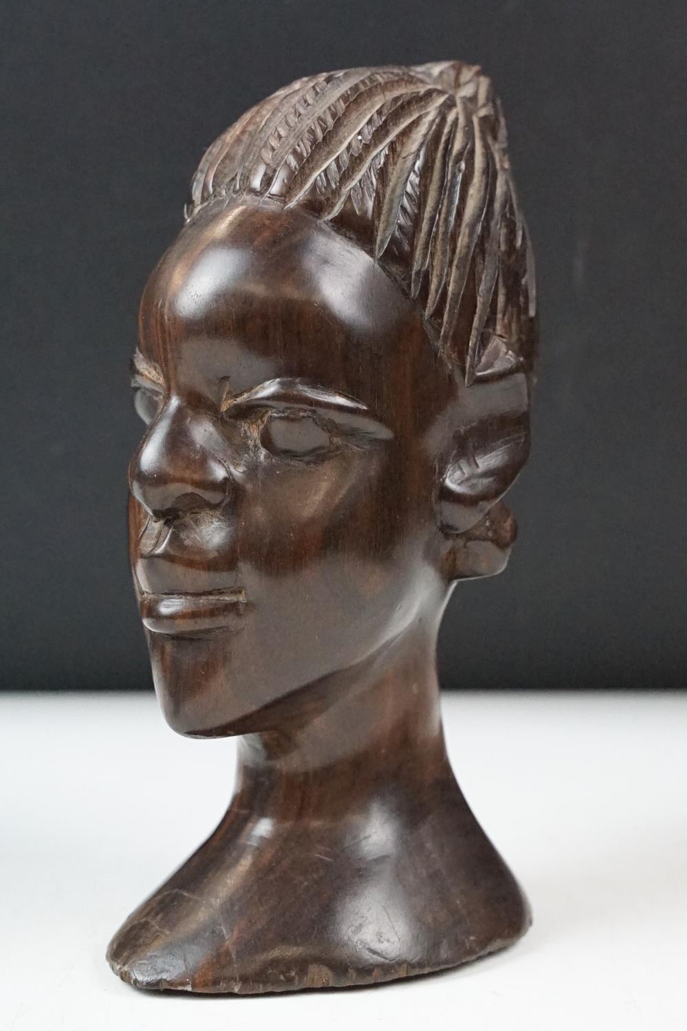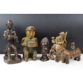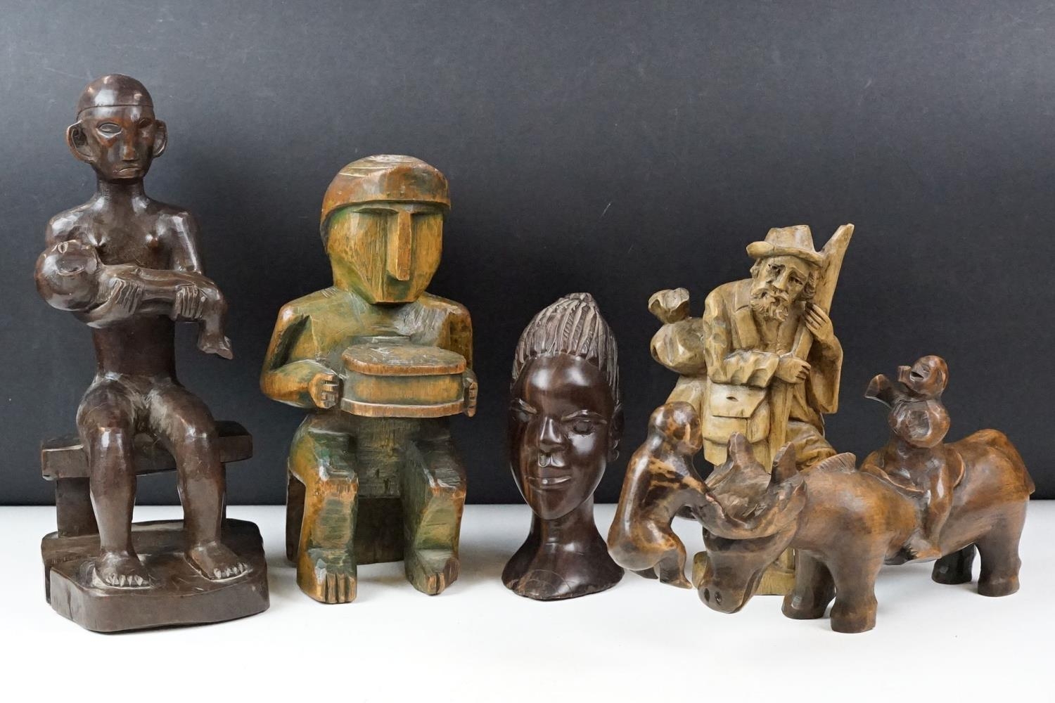 Collection of carved wooden figurines to include some African Tribal examples, a mother and child figure, traveller and female bust. Tallest measures 28cm.