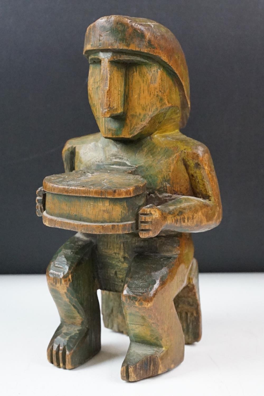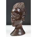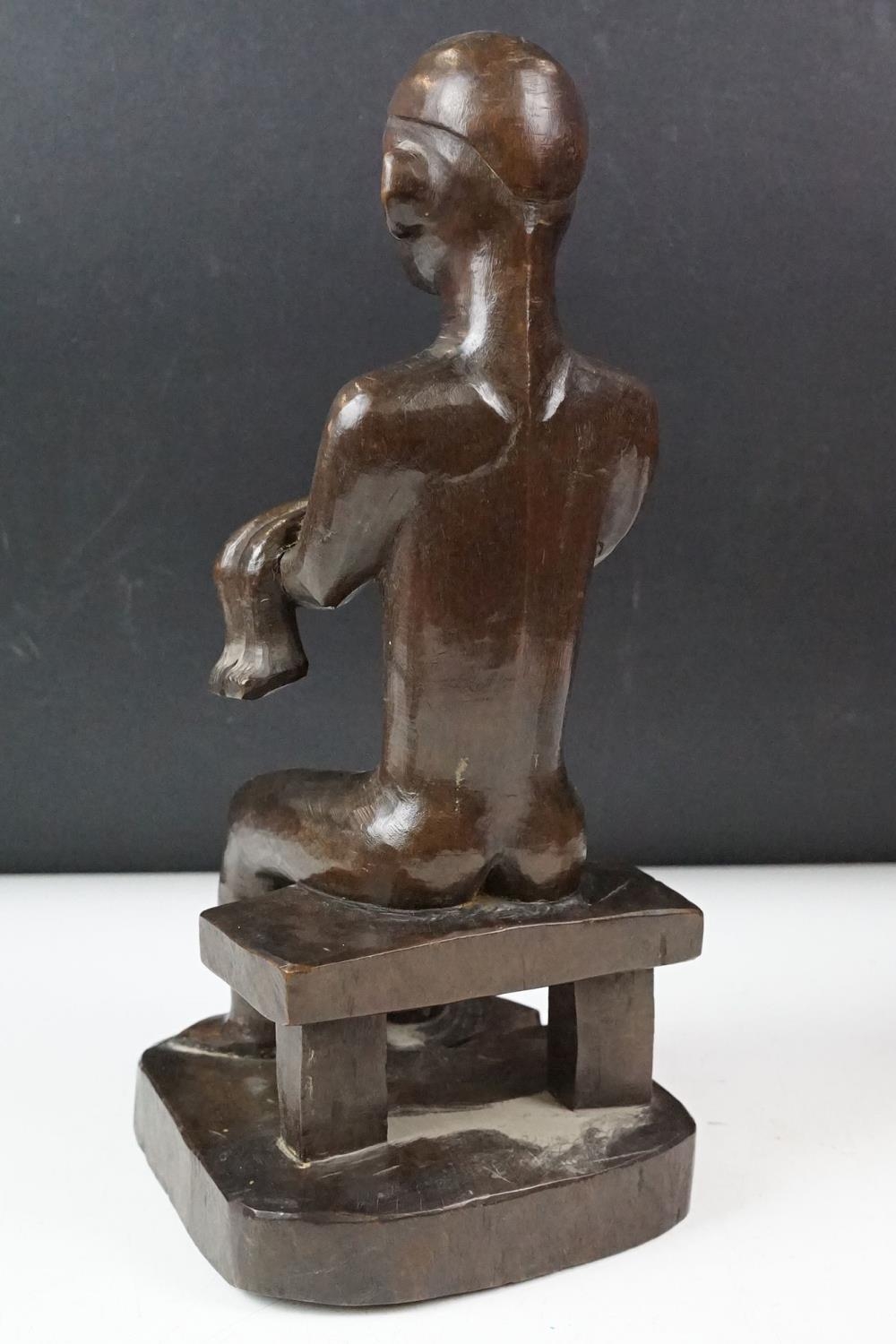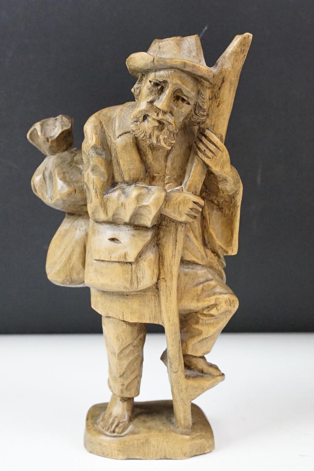 Collection of carved wooden figurines to include some African Tribal examples, a mother and child figure, traveller and female bust. Tallest measures 28cm.