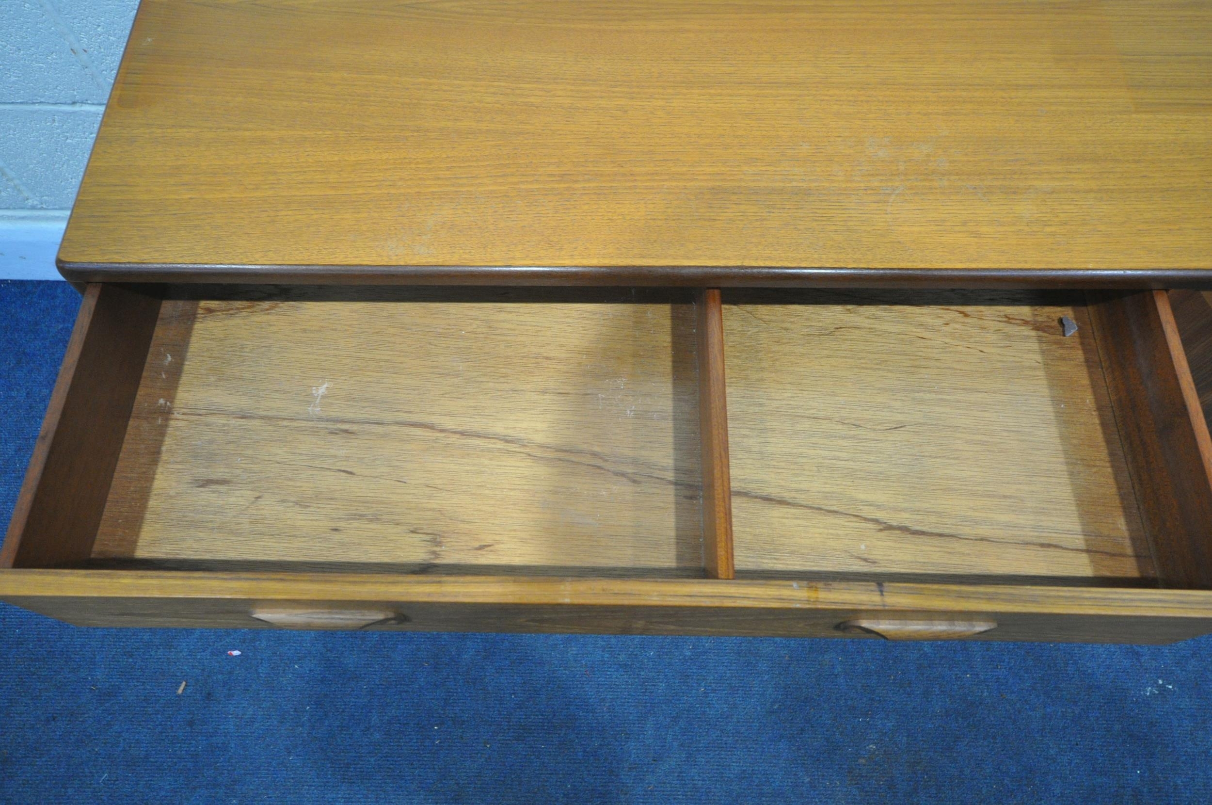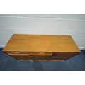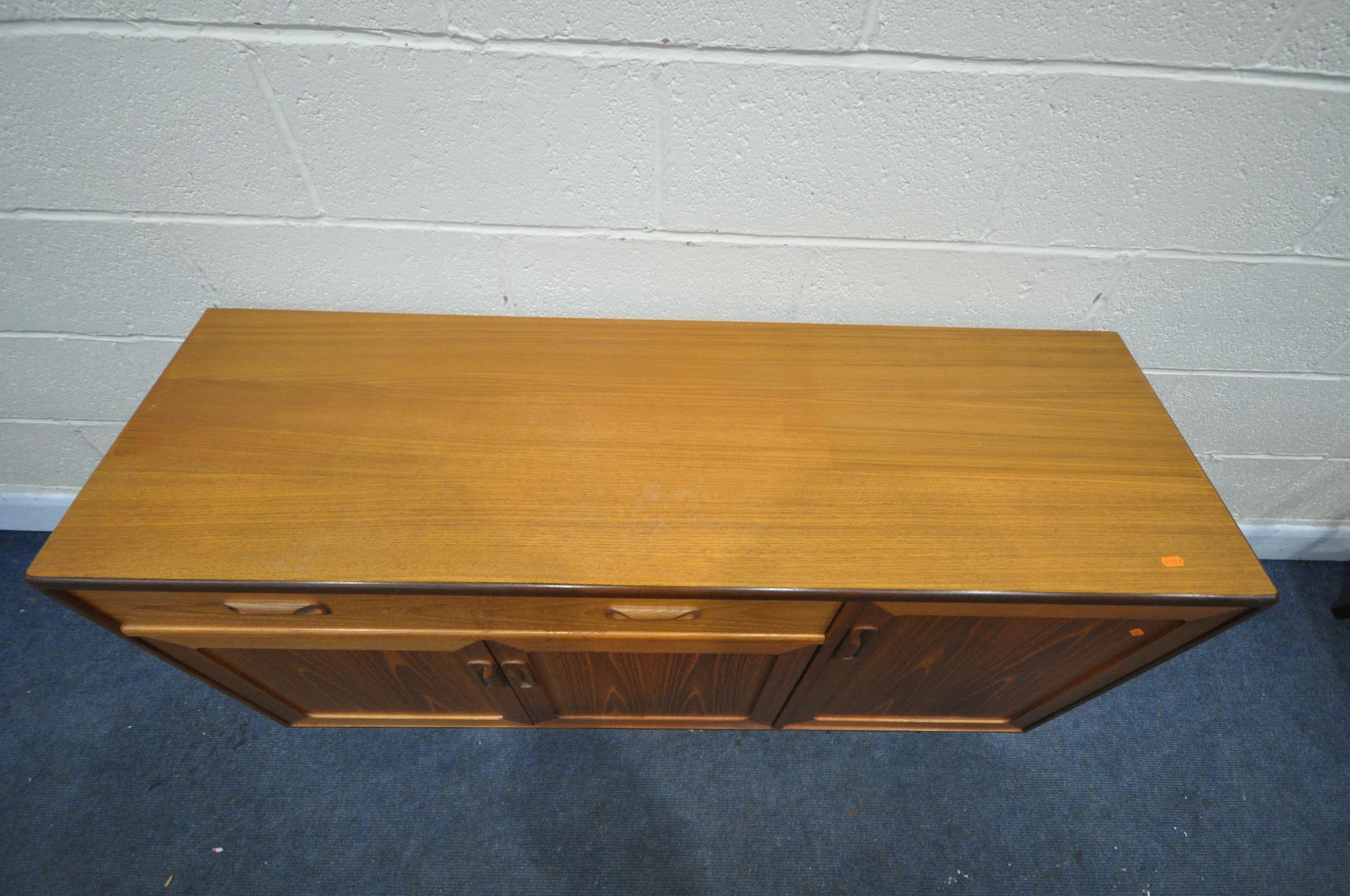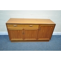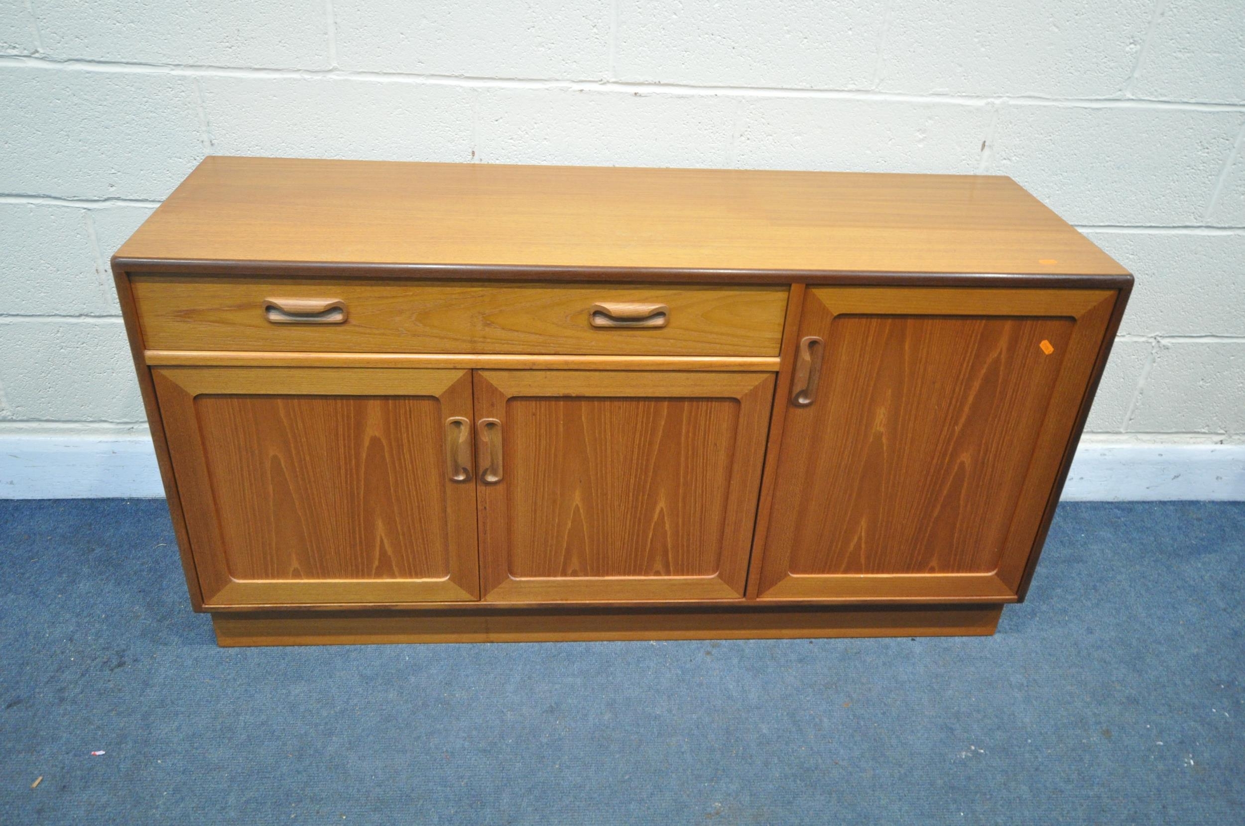 A MID CENTURY G PLAN FRESCO TEAK SIDEBOARD, with a single long drawer, and three cupboard doors, length 139cm x depth 45cm x height 72cm (condition - discolouration to top surface, minor surface marks)