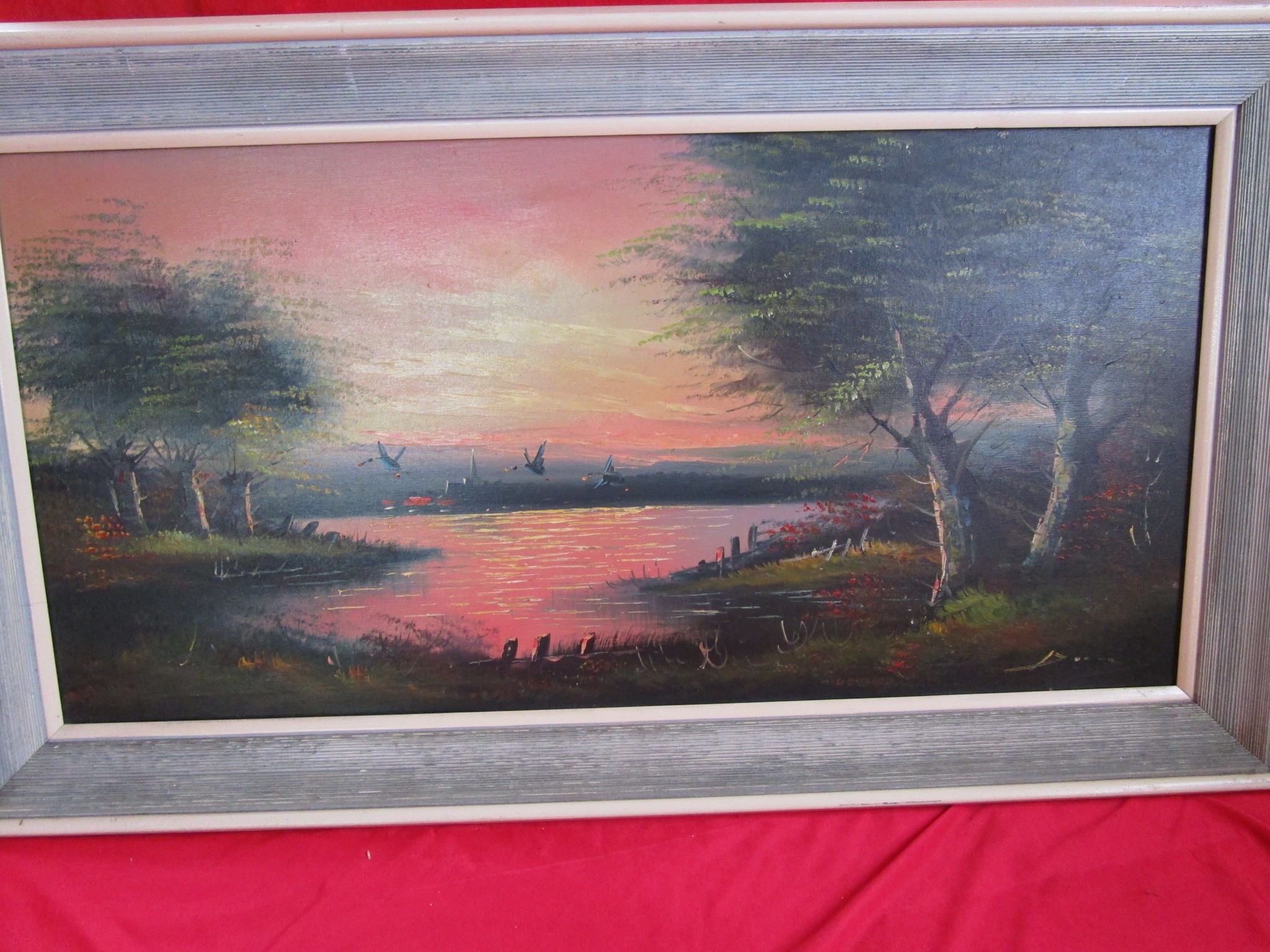 A country landscape picture in a period frame looks to have been painted in Canada .Size 18 by 36 inches