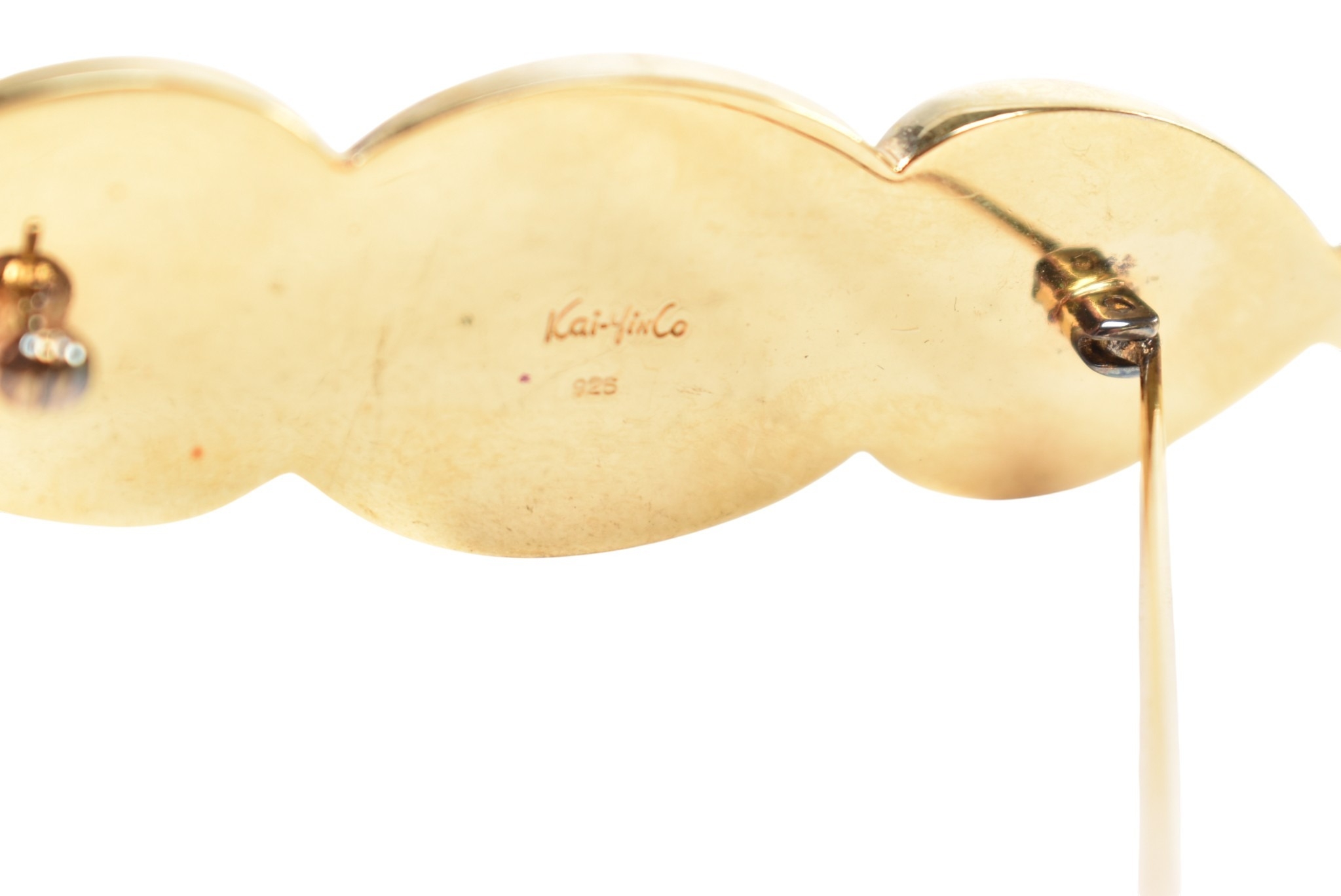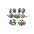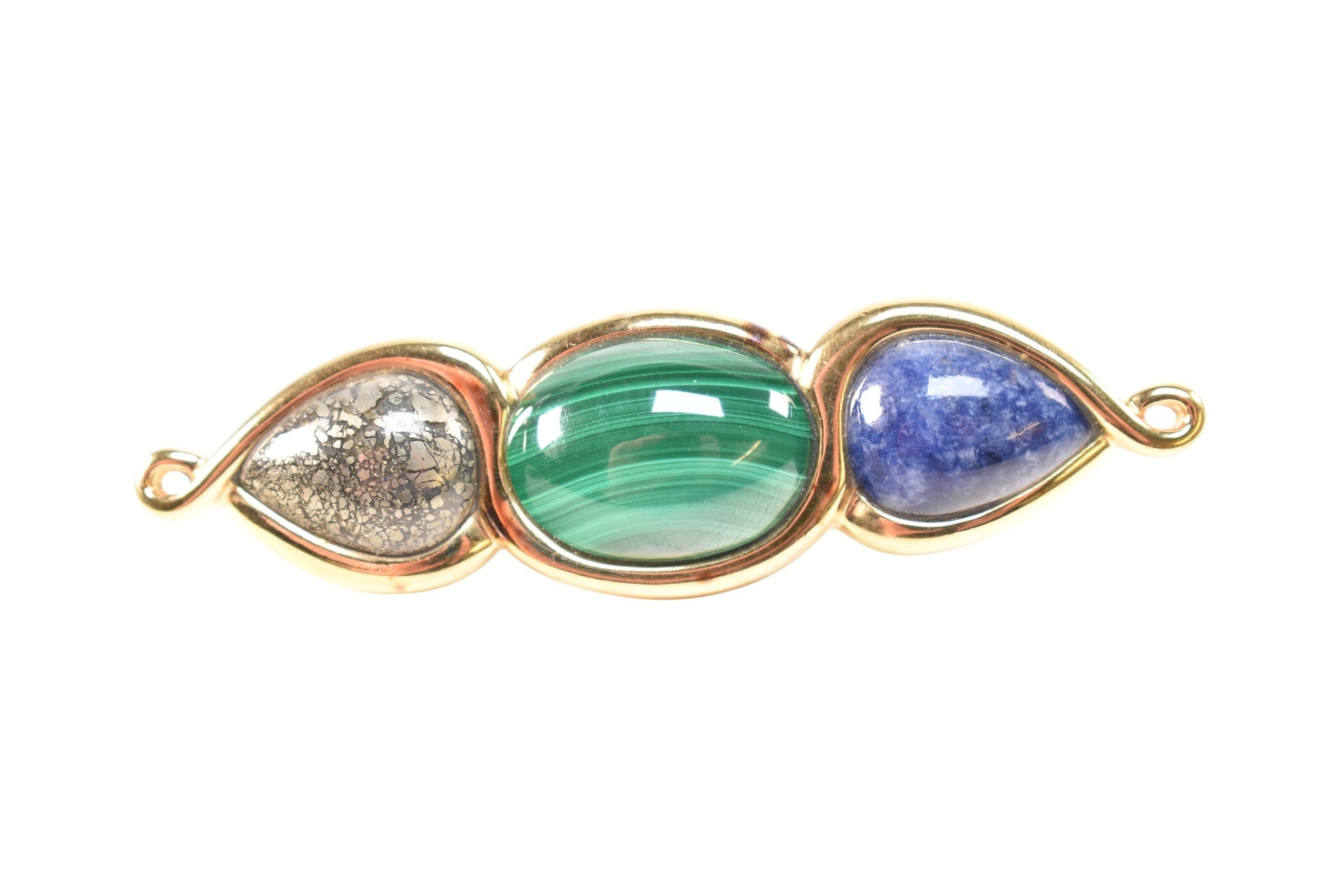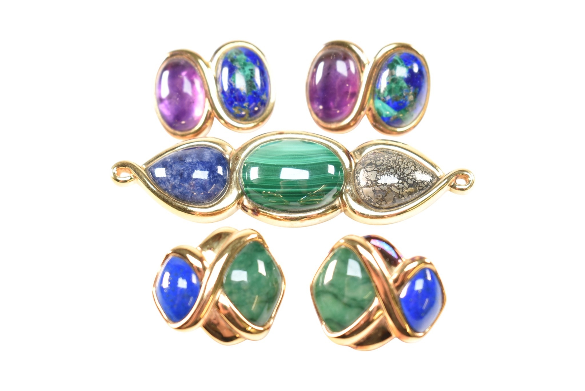 A collection of Kai Yin Lo silver gilt and gem-set earrings and a brooch pin. Including a three stone brooch set with lapis lazuli, malachite and pyrite agate. A pair of amethyst and mixed Lapis malachite earrings and a pair of lapis and malachite earrings. All signed with 925. Brooch measures 8cm.