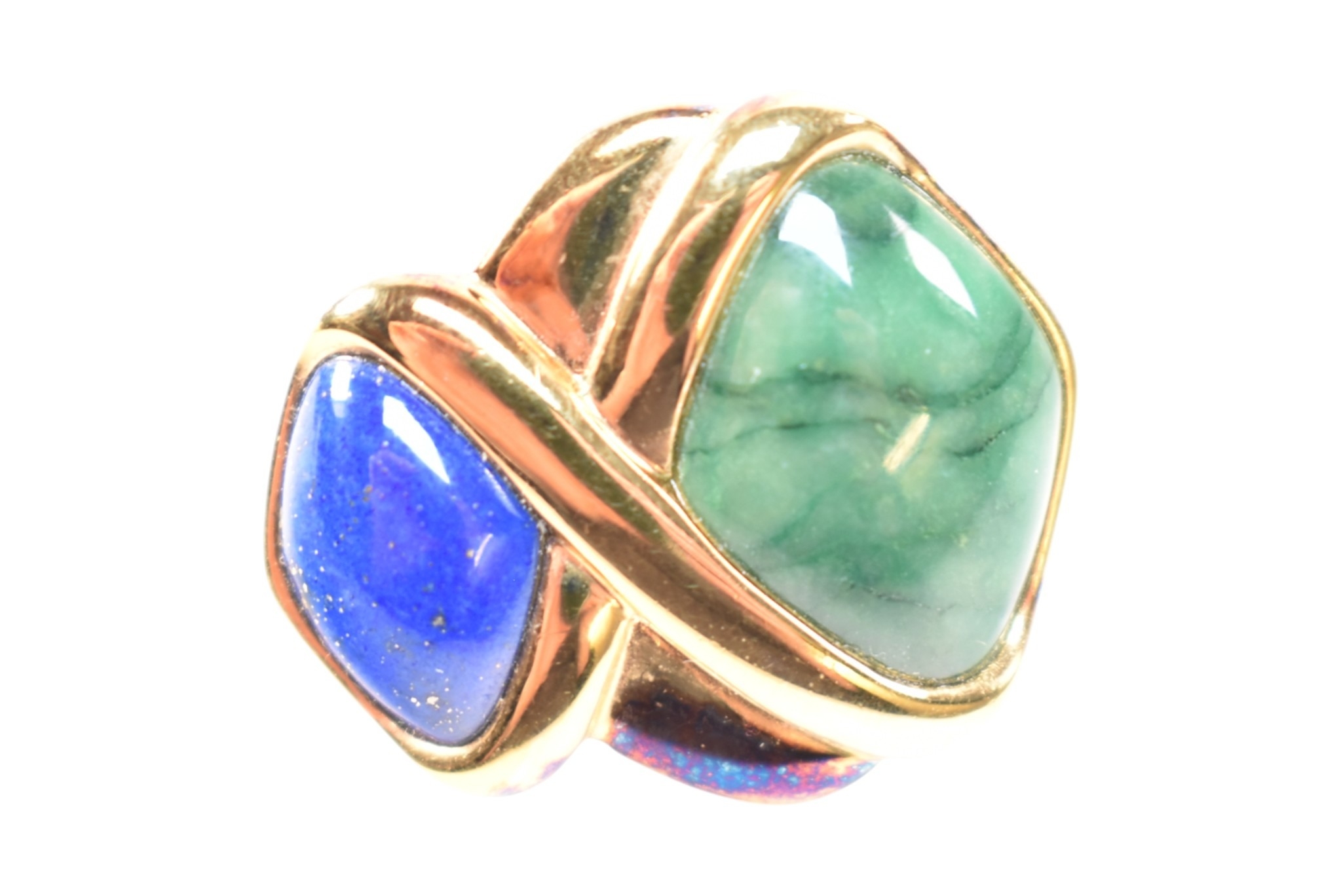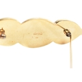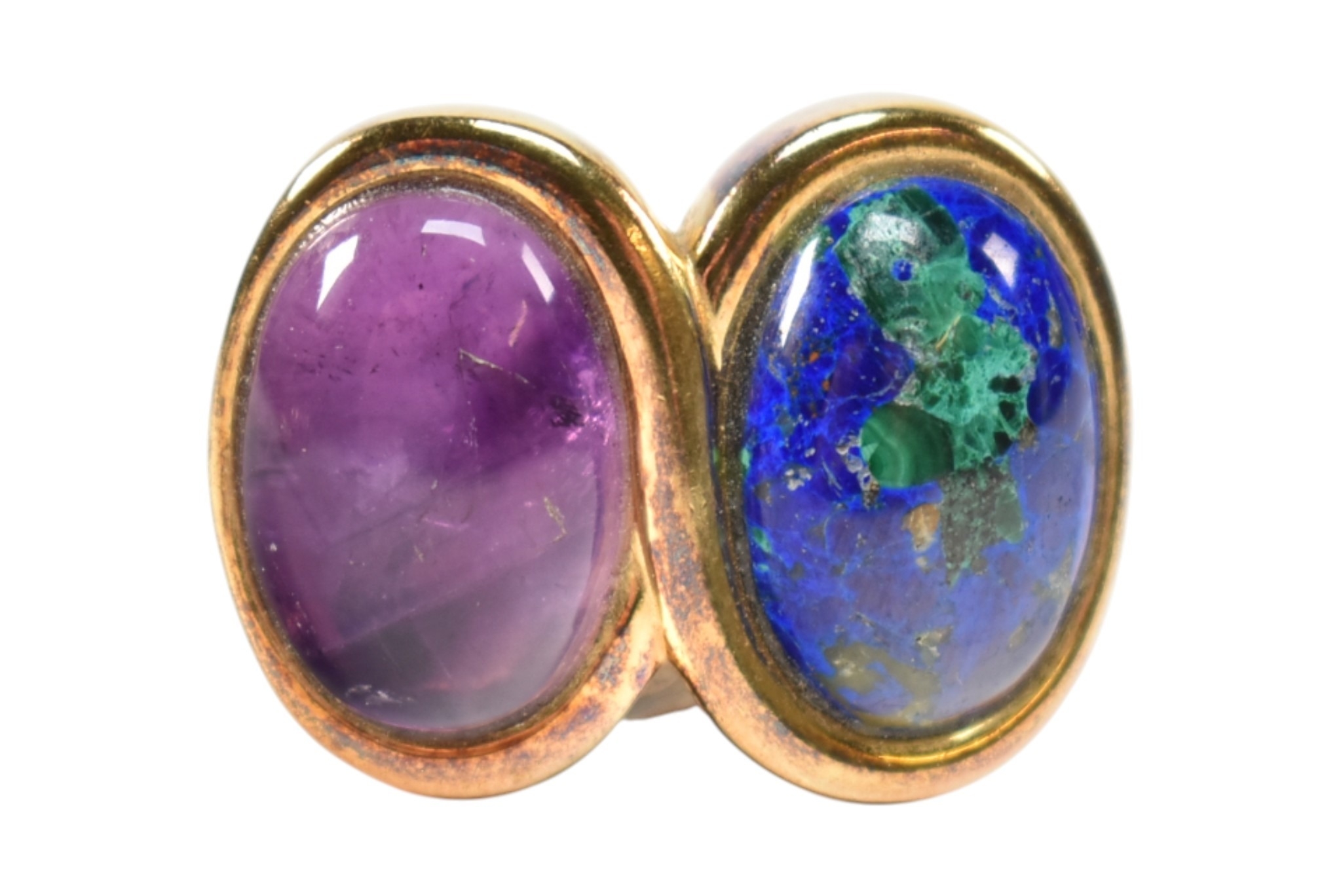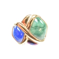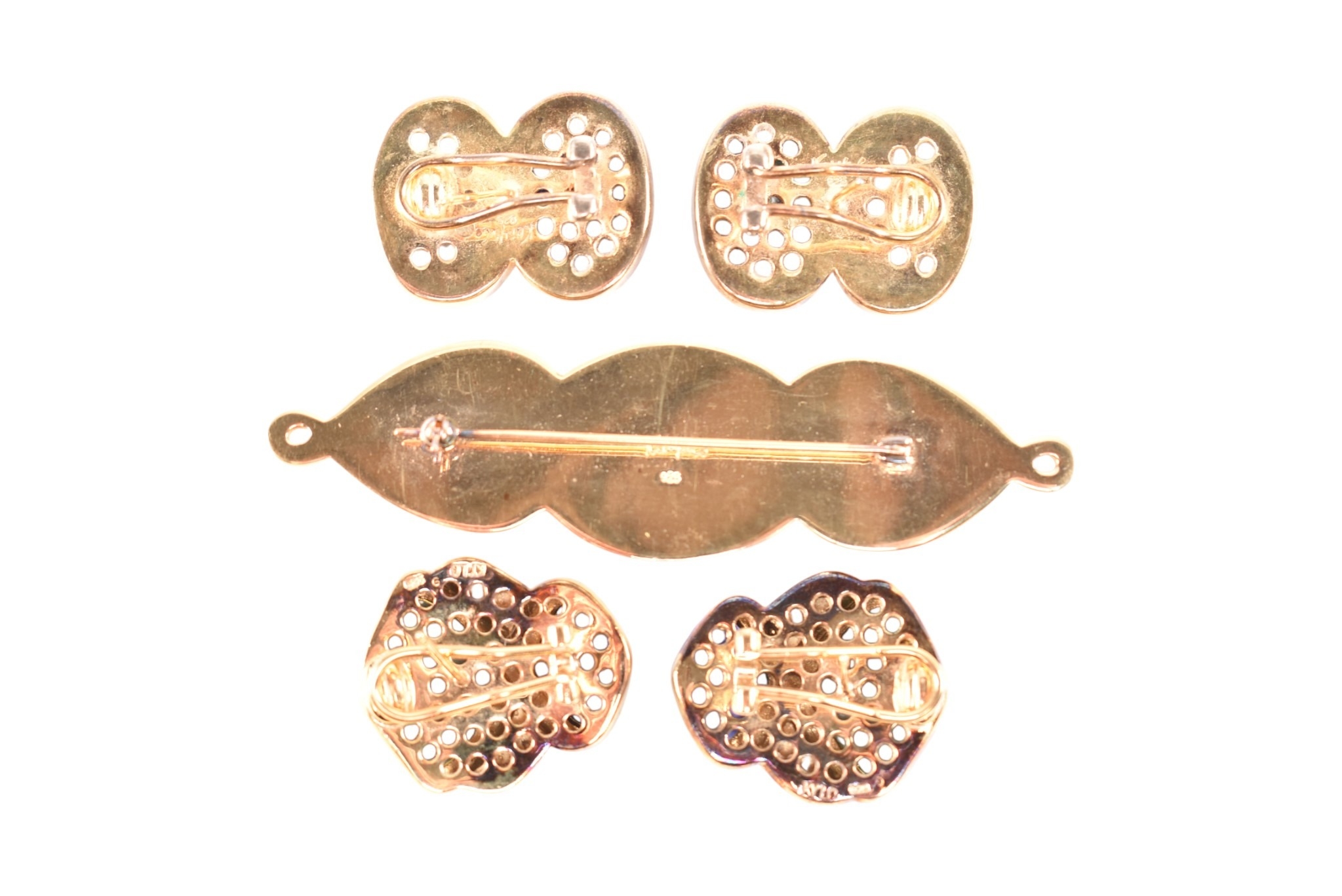 A collection of Kai Yin Lo silver gilt and gem-set earrings and a brooch pin. Including a three stone brooch set with lapis lazuli, malachite and pyrite agate. A pair of amethyst and mixed Lapis malachite earrings and a pair of lapis and malachite earrings. All signed with 925. Brooch measures 8cm.