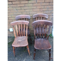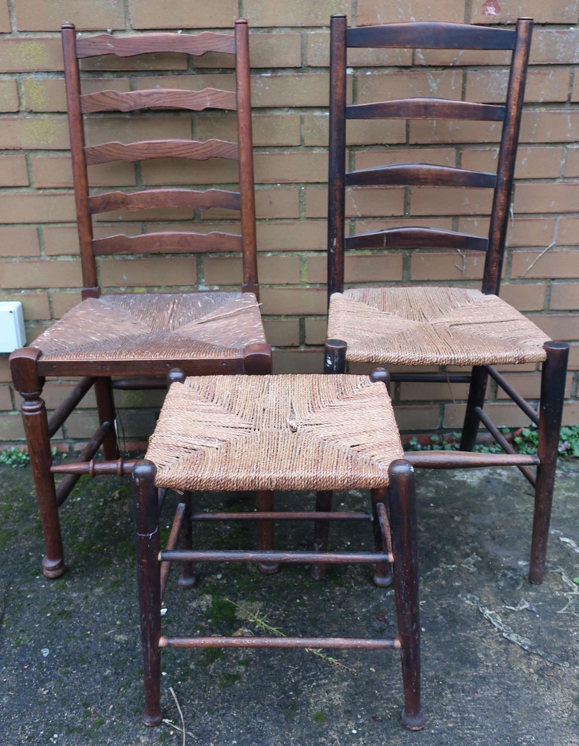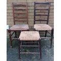 Rush seated ladder back oak dining chair, another similar chair and a four legged stool (3)