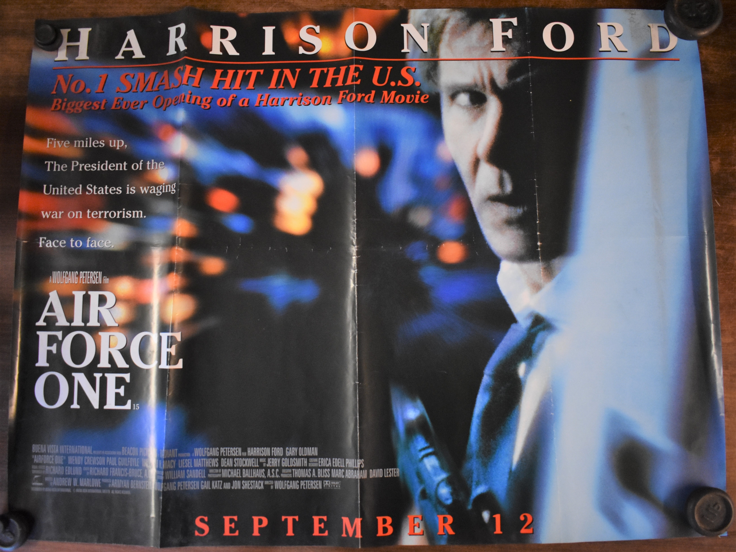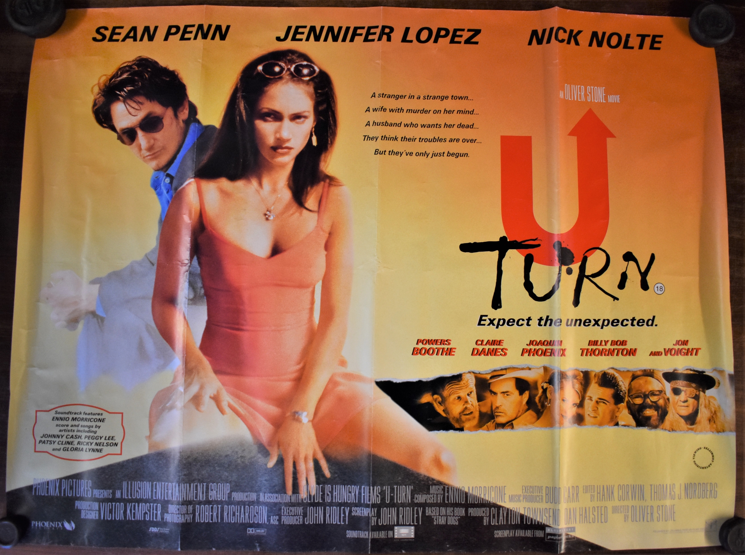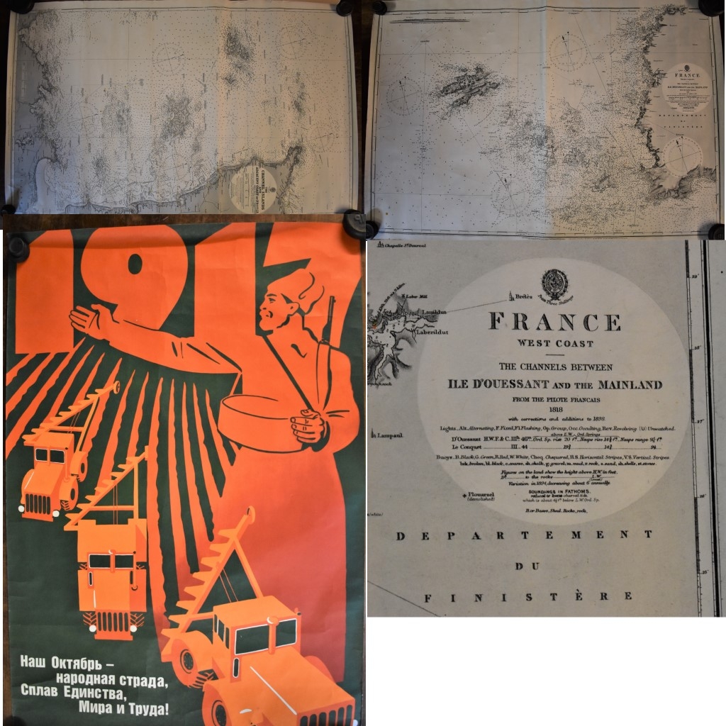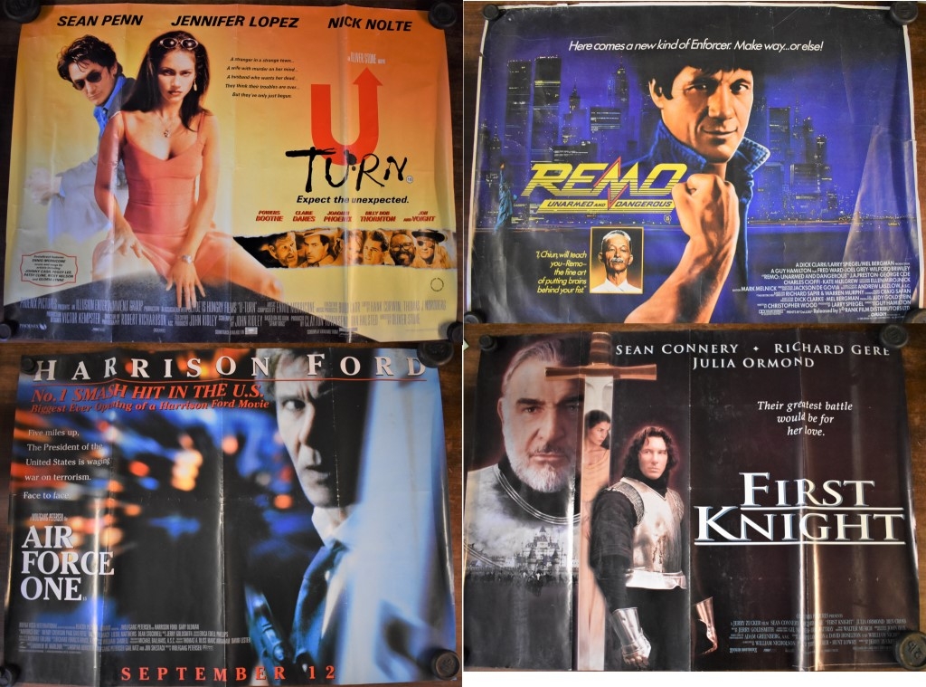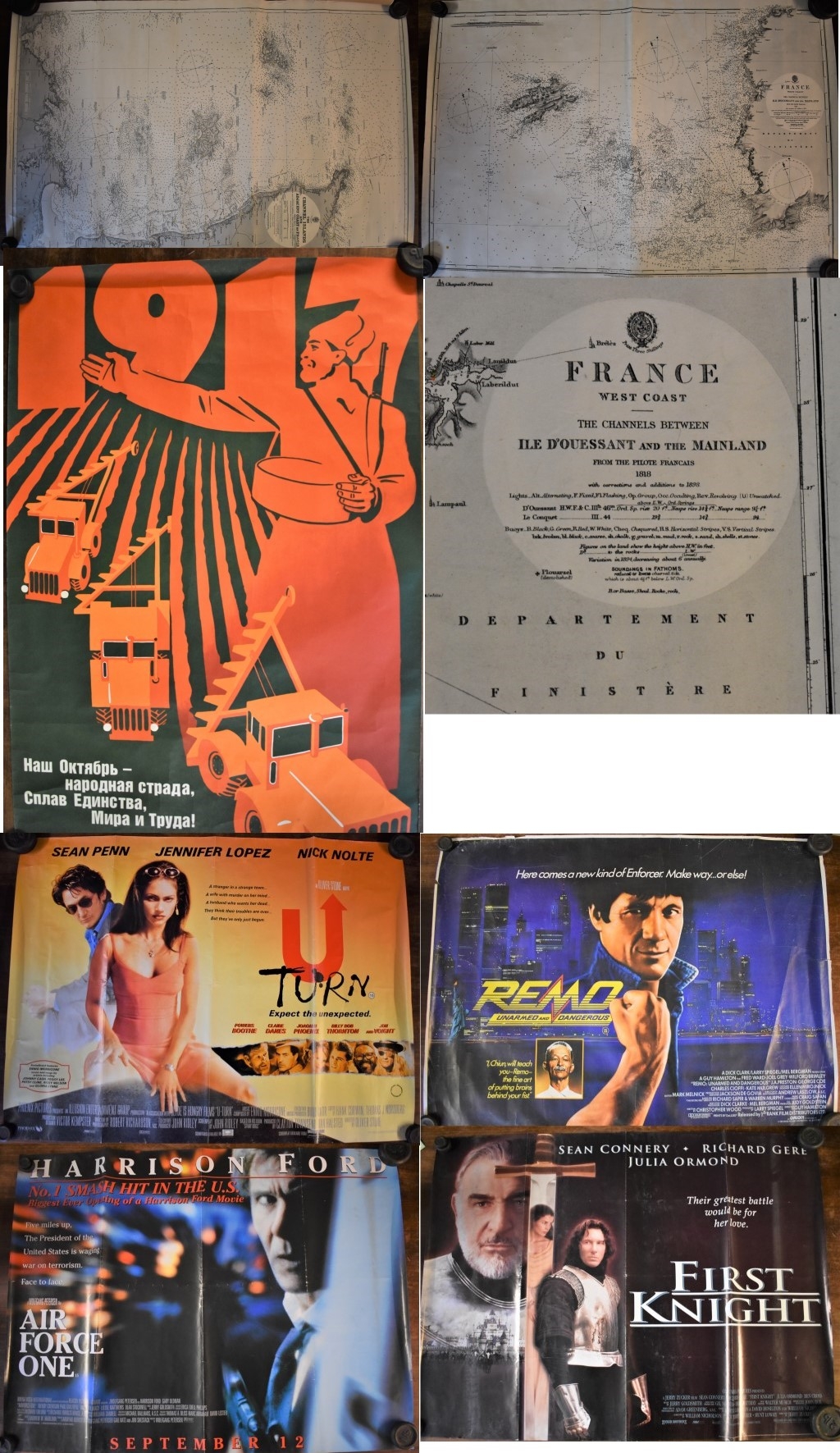 Posters - The Channel Islands - Adjacent Coast of France Survey Map, black and white edition first produced in 1909. Slight tear on edge of map, otherwise good condition. Measurements 100cm x 68cm, France - The West Coast. Measurements 100cm x 68cm and Russian 1917-1987 Agricultural Poster, measurements 96cm x 65cm, 'U Turn' starring Jennifer Lopez & Sean Penn. Measurements 100cm x 76cm, 'Reno' Unarmed and dangerous-starring Joel Grey-measurements 100cm x 76cm, 'Airforce I' starring Harrison Ford. Double sided poster, measurement 200cm x 76cm and 'First Knight' starring Sean Connery & Richard Gere, double sided poster-measurements 100cm x 76cm.