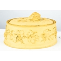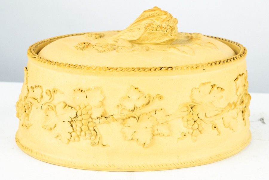 NINETEENTH CENTURY WEDGWOOD BUFF GLAZED AND MOULDED POTTERY PIE DISH AND COVER, of oval form, sprigged with a meandering, fruiting vine and set beneath a cauliflower pattern knop to the domed cover, impressed mark, 5 ½” (13.9cm) high, 10” x 7 ½” (25.4cm x 19cm)