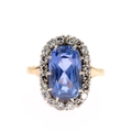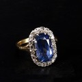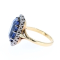 Sri Lankan Cushion Cut Sapphire and Diamond Halo Gold Ring. This piece has been tested as 18ct gold. The central sapphire is estimated at 5.90ct. The ring is a UK size O, weighs in total 5.8g.