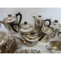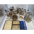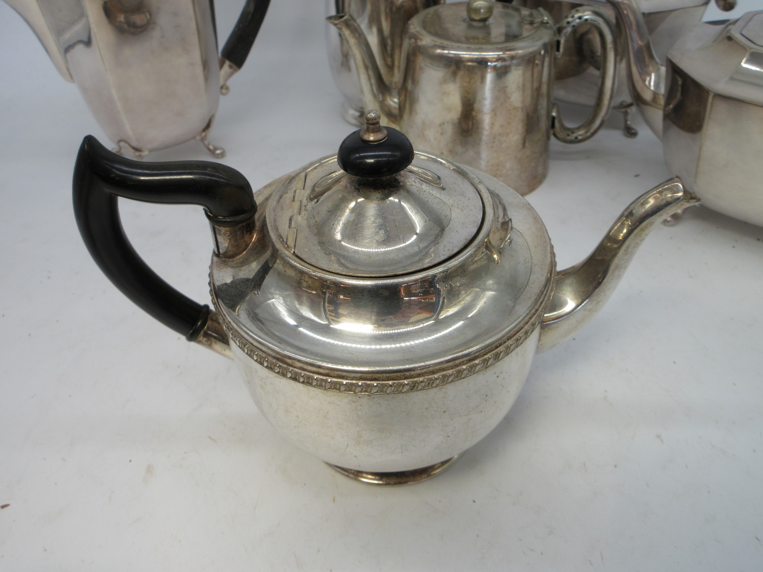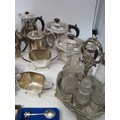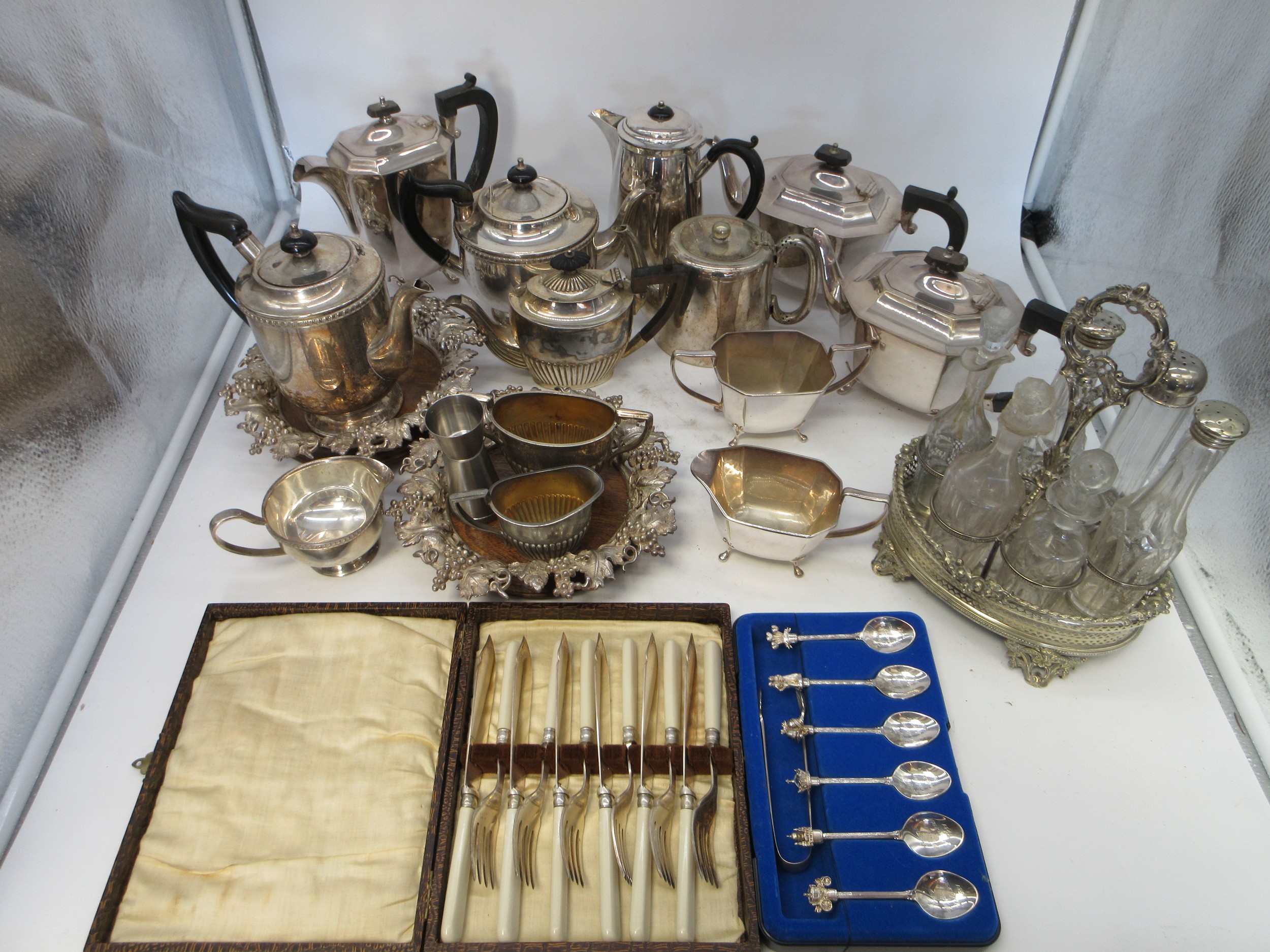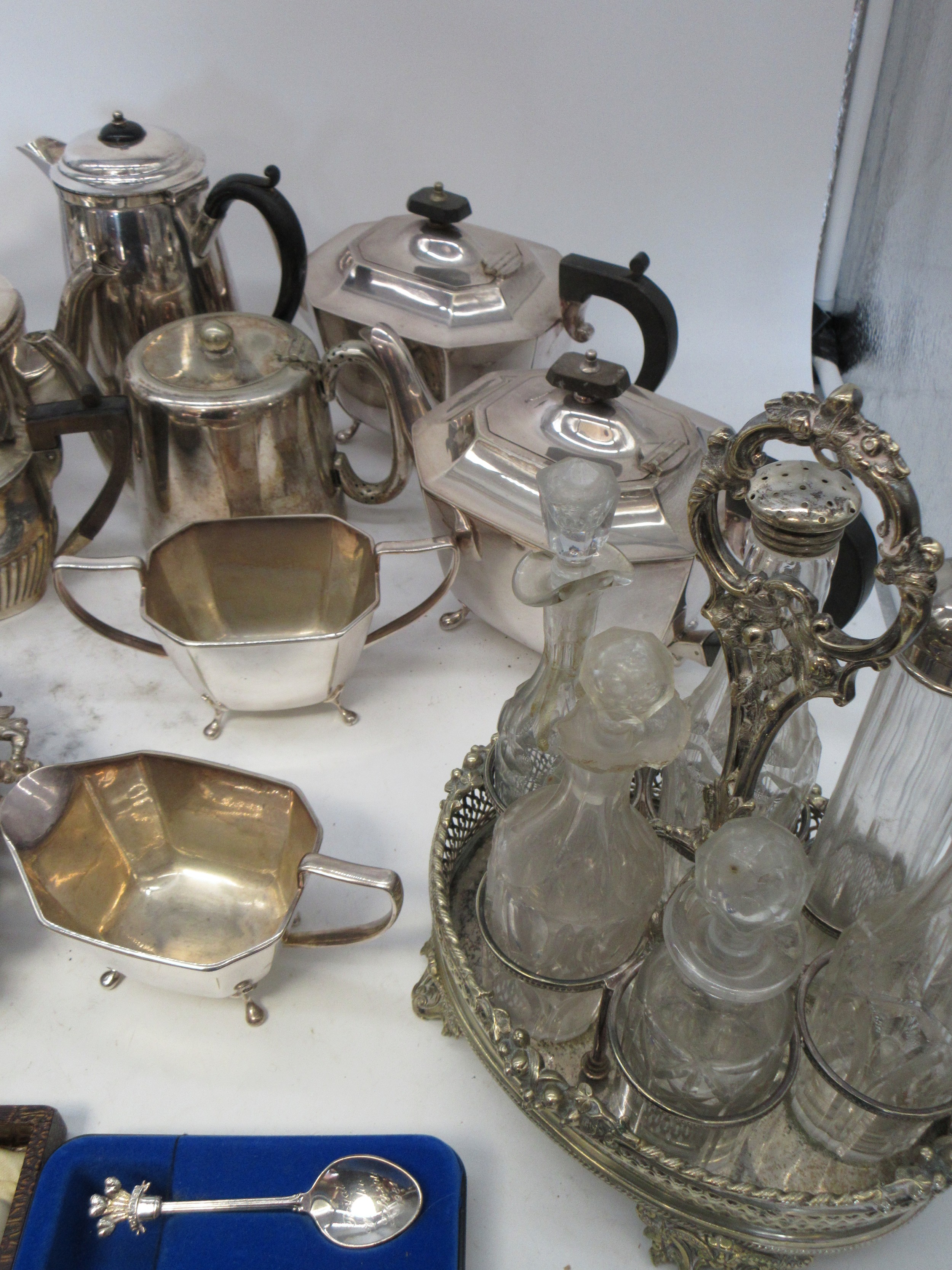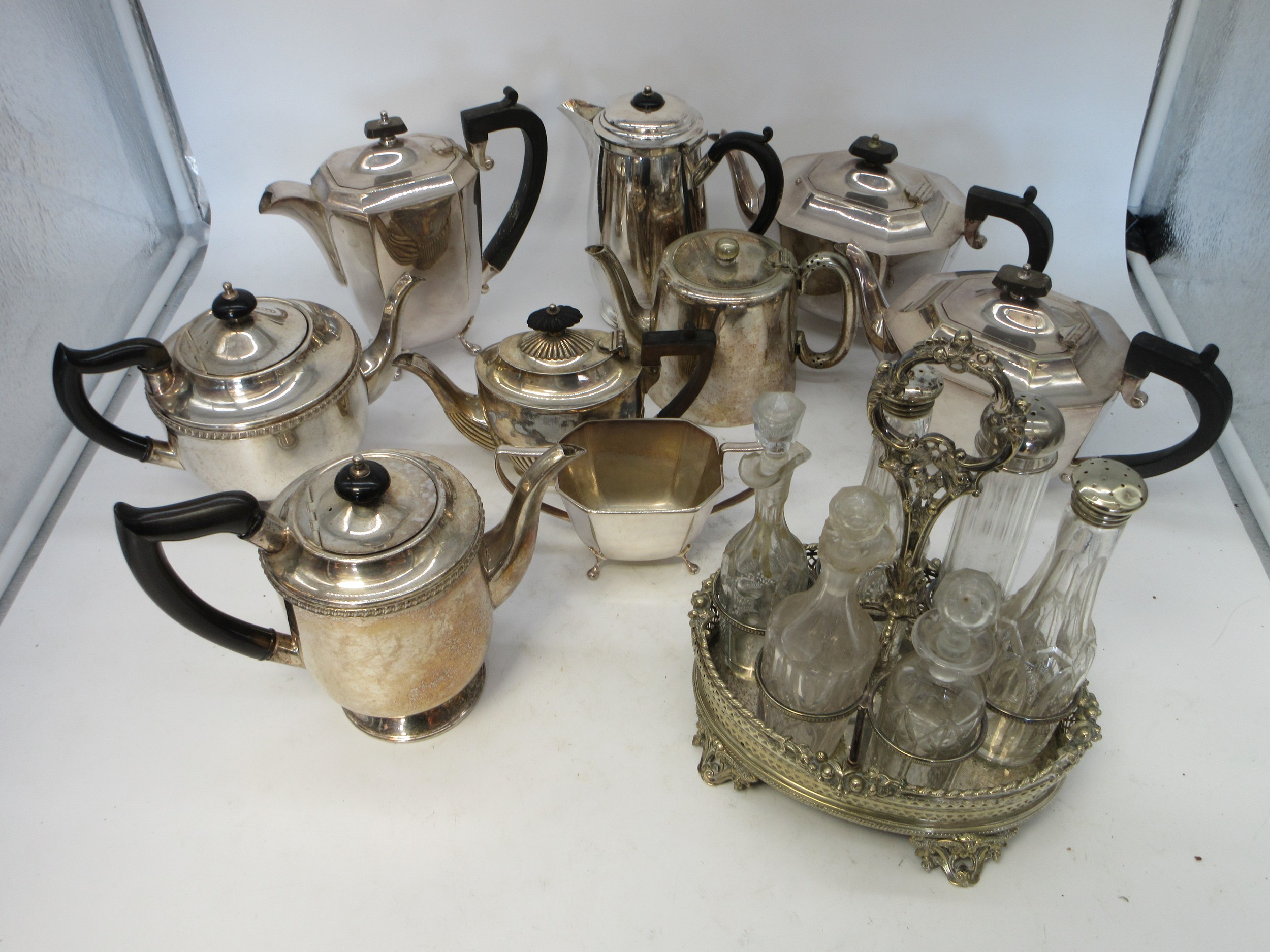 A good collection of silverplated wares incl. Atkin Bros Sheffield coffee pot, James Pinder & Co Sheffield teapot, Viners of Sheffield Alpha plate tea & coffee pots, cased EPNS fish knife and fork set, Walker & Hall teapot, Thomas Harwood & Son condiment bottle holder etc.