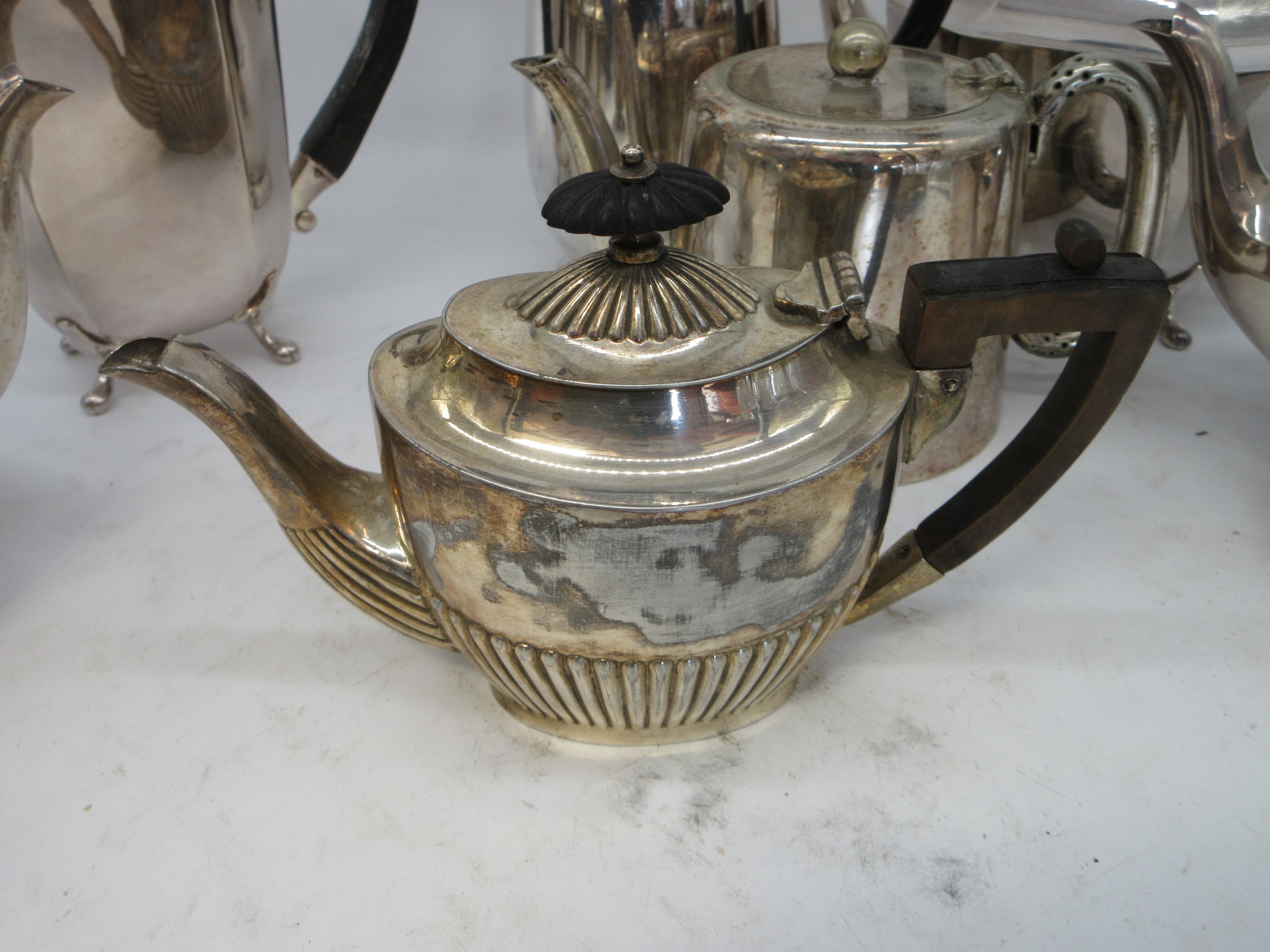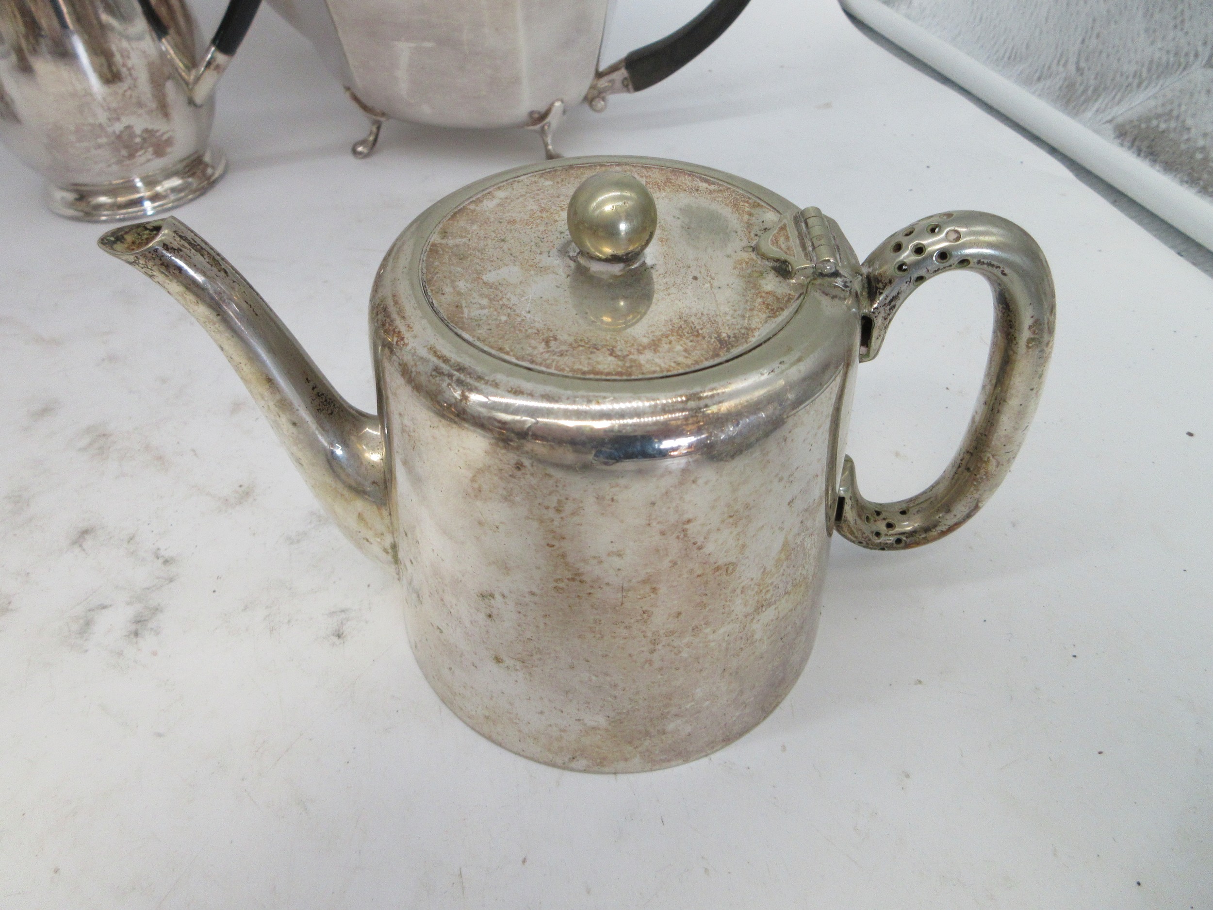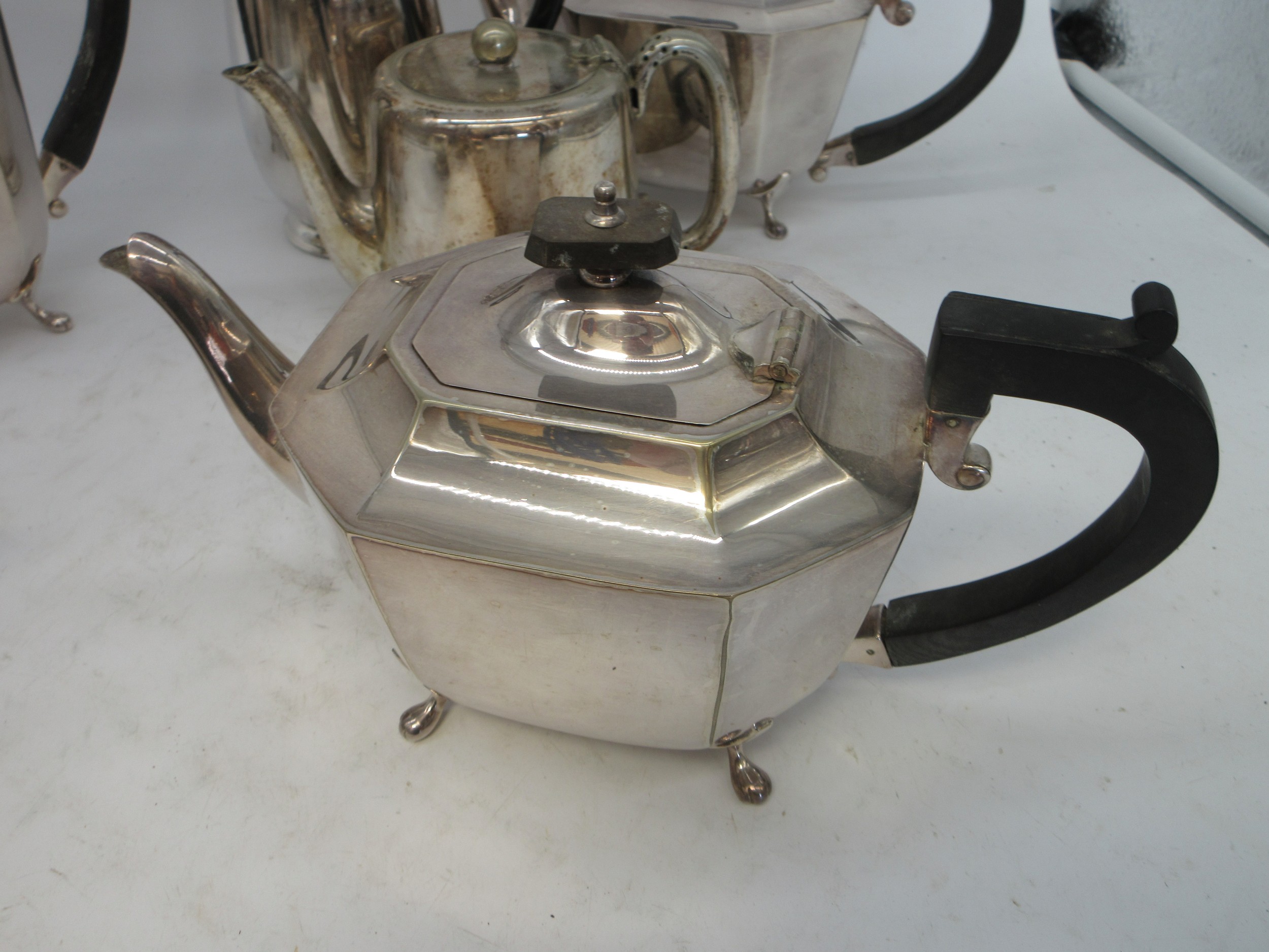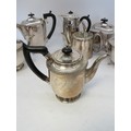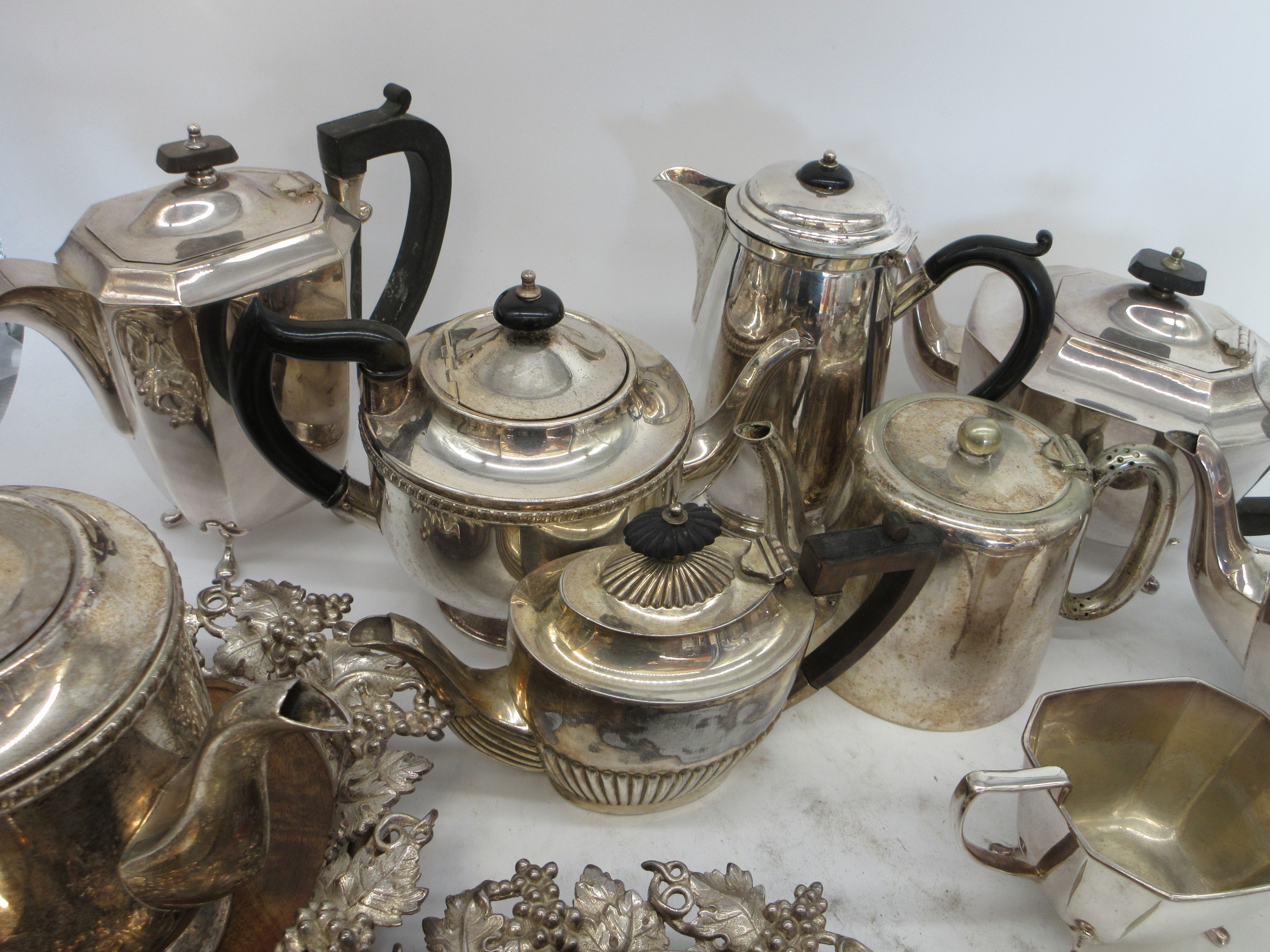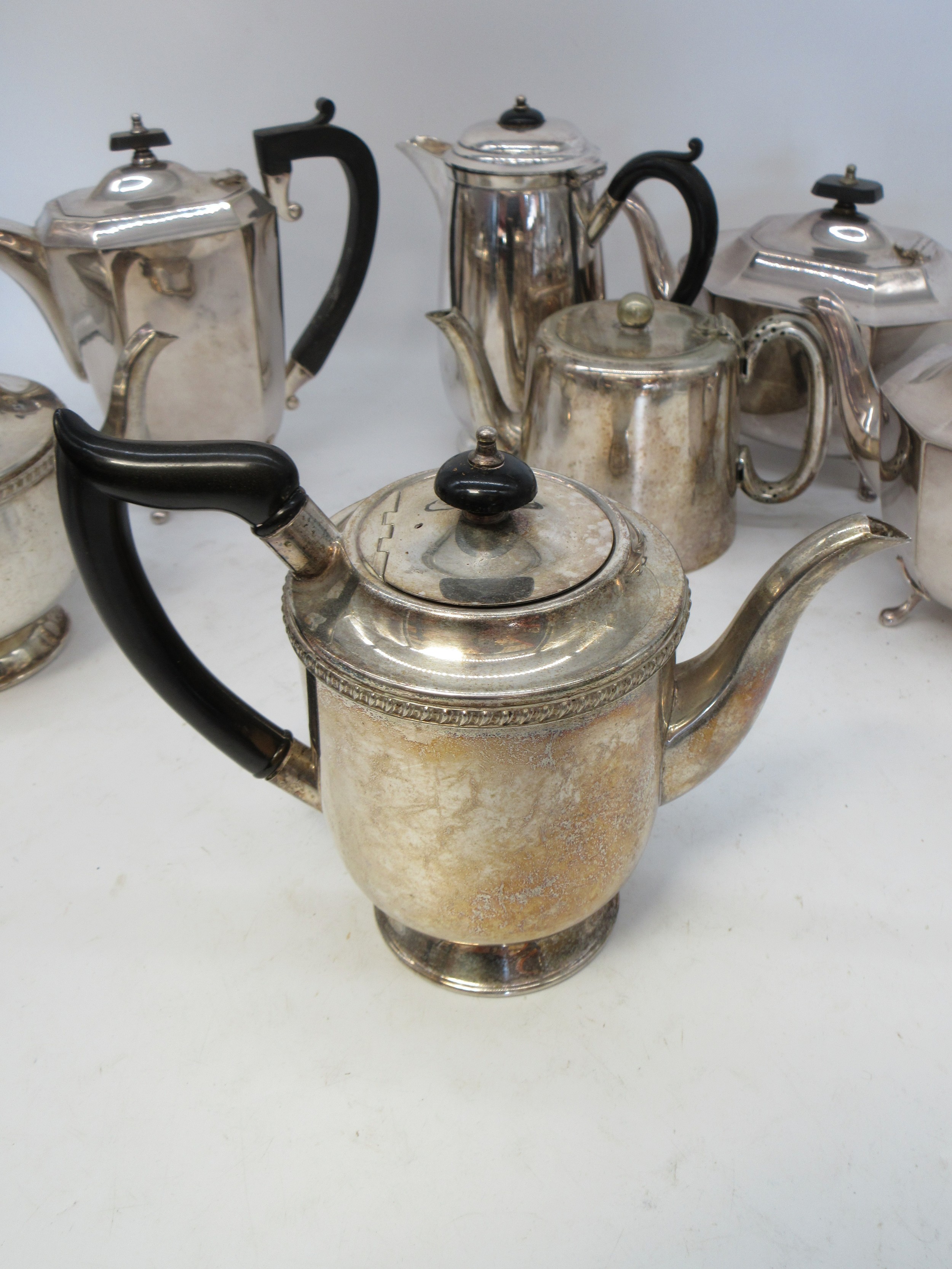 A good collection of silverplated wares incl. Atkin Bros Sheffield coffee pot, James Pinder & Co Sheffield teapot, Viners of Sheffield Alpha plate tea & coffee pots, cased EPNS fish knife and fork set, Walker & Hall teapot, Thomas Harwood & Son condiment bottle holder etc.